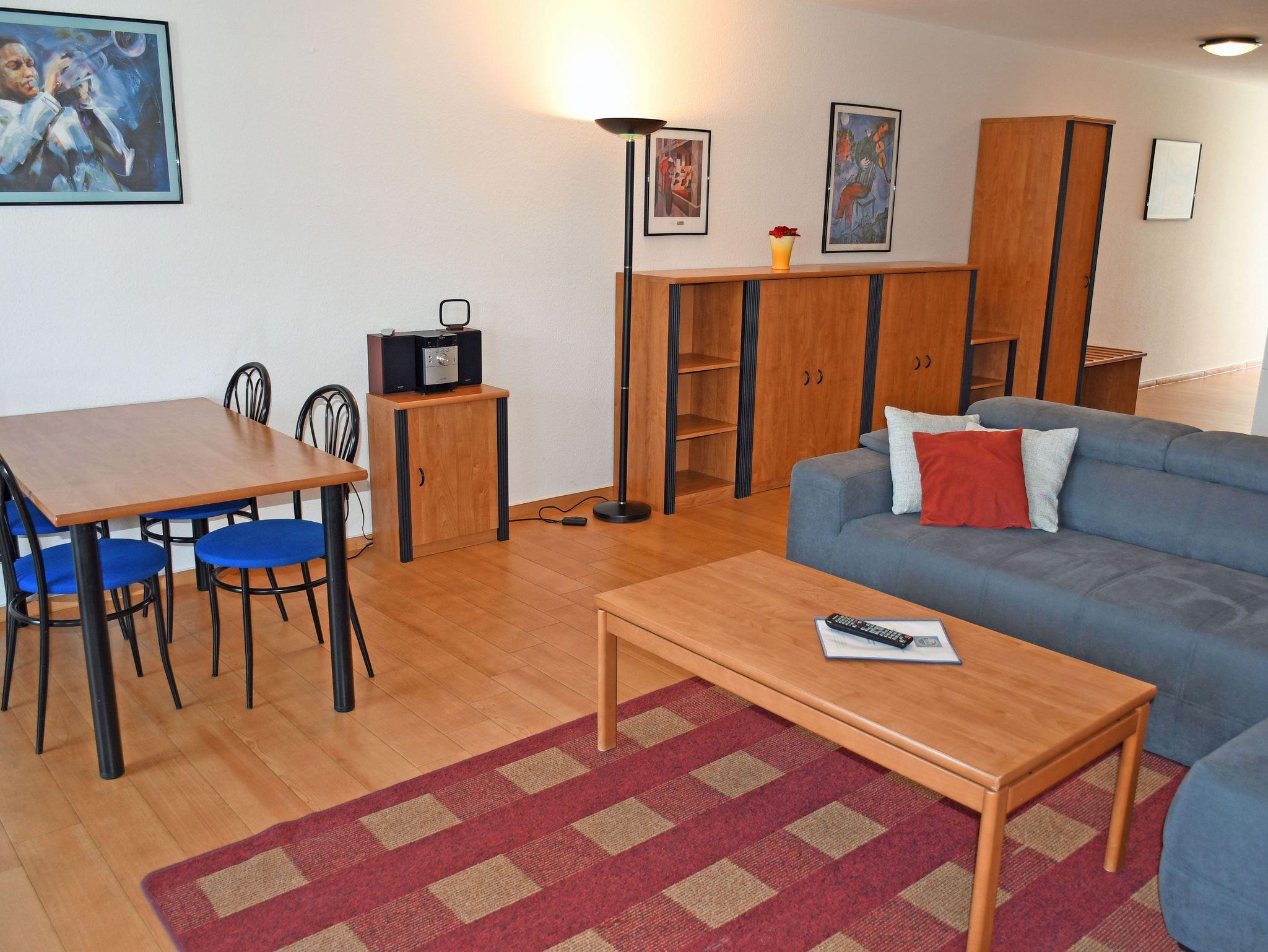 * Wohnbereich mit ausziehbarer Doppelbettschlafcouch, 2 Sesseln, Couchtisch, Anrichte mit Flat-TV und CD-Radio-Anlage