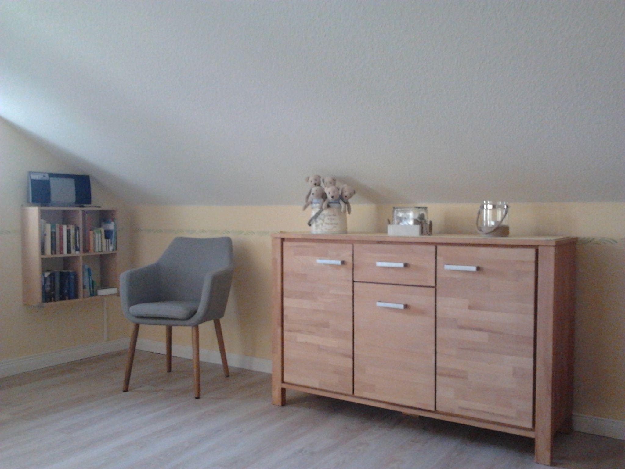 * den Wohnraum mit einem weiteren Schrank, Schlafsofa (Aufbettung für den 3. und 4. Gast), Sesseln, Couchtisch, Sideboard, Kommode, und TV, Stereoanlage mit CD-Player und Radio, sowie eine gemütliche Essecke;