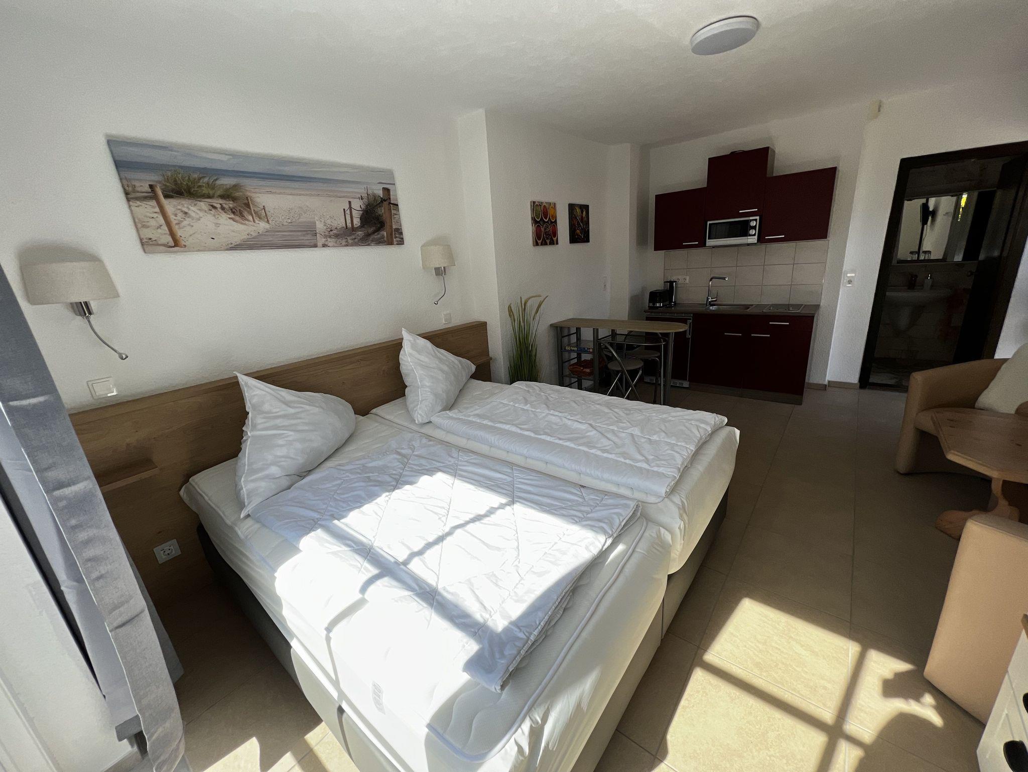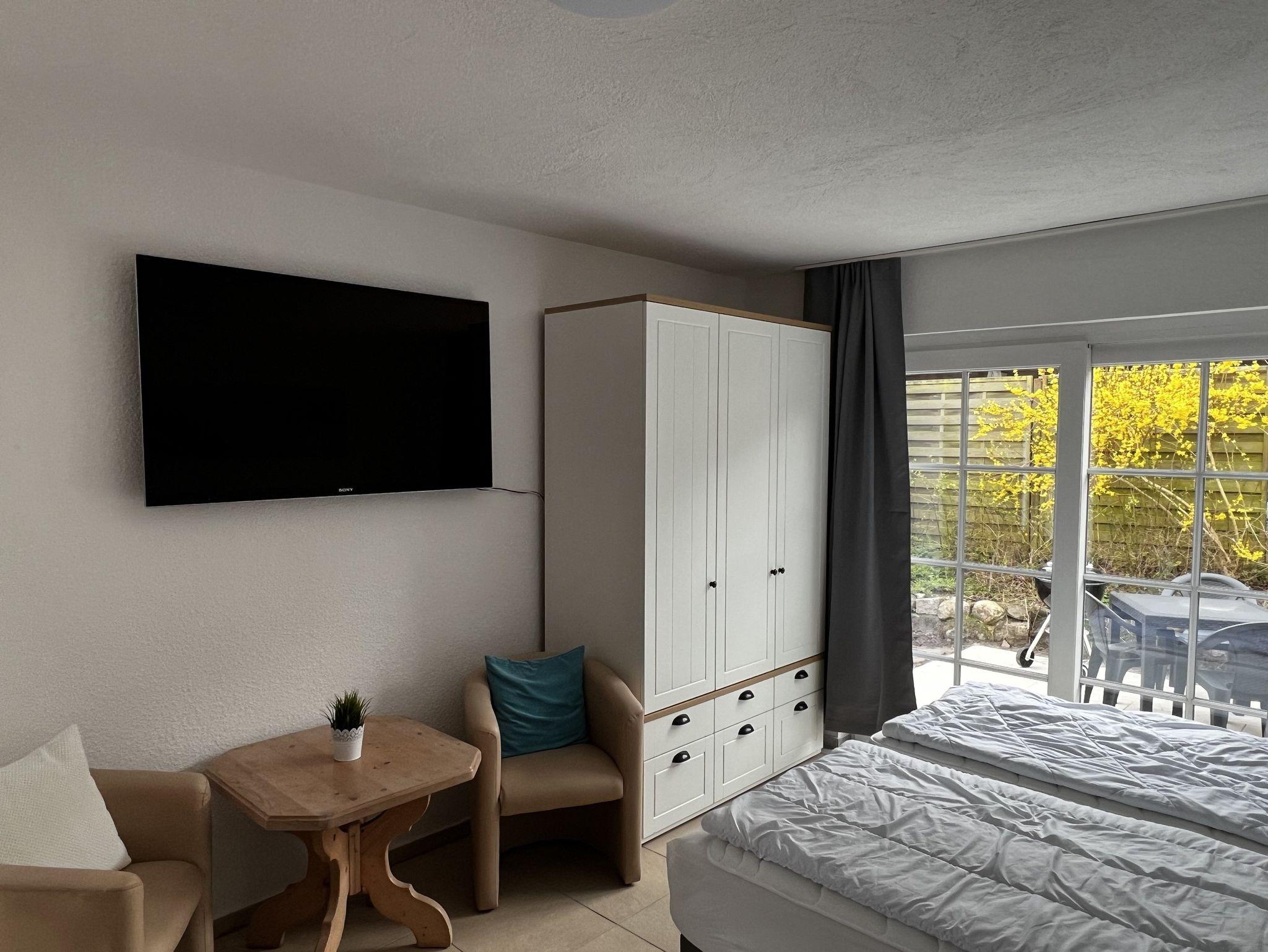 Das Apartment hat eine eigene Südterrasse und einen Grill. Sie schlafen auf einem neuen sehr hochwertigen Boxspringbett. Der Fernseher (60 Zoll) ist über Satelliten- TV angeschlossen. Das Apartment verfügt über eine kleine Küche mit Kühlschrank, Herdplatten, Spüle, Wasserkocher, Toaster und Kaffeemaschine. Das Bad verfügt über eine ebenerdige Dusche.