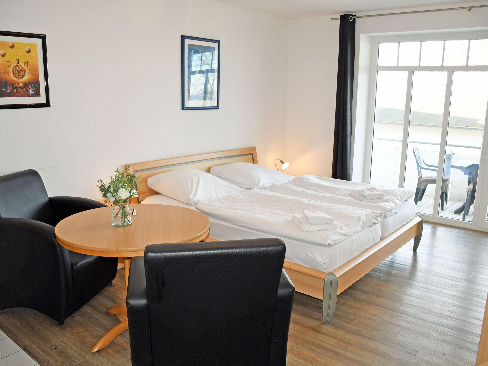 Unsere ruhig gelegenen, hellen und lichtdurchfluteten 1-Raum-Ferienwohnungen mit Balkon oder Terrasse sind wie folgt ausgestattet: