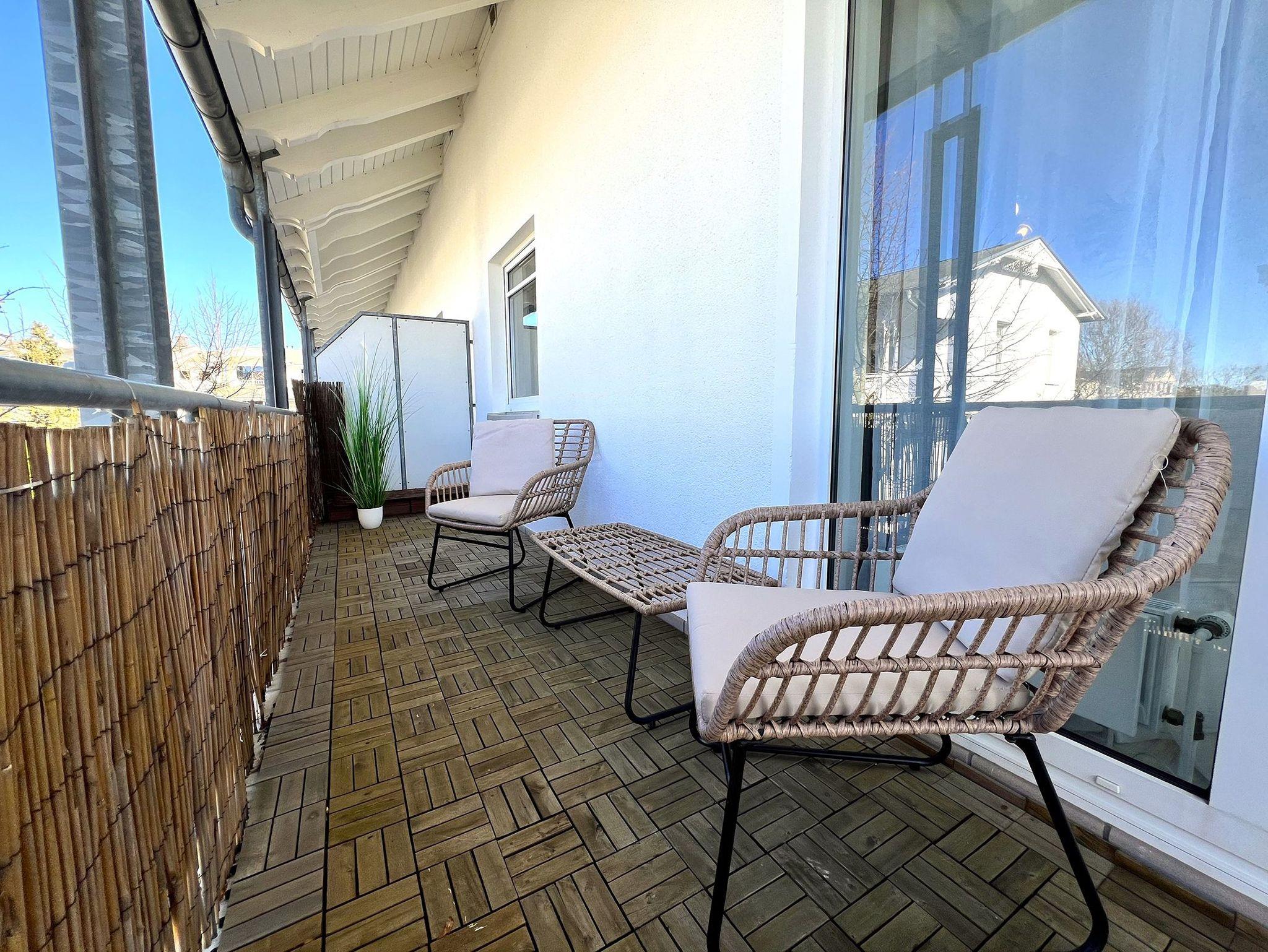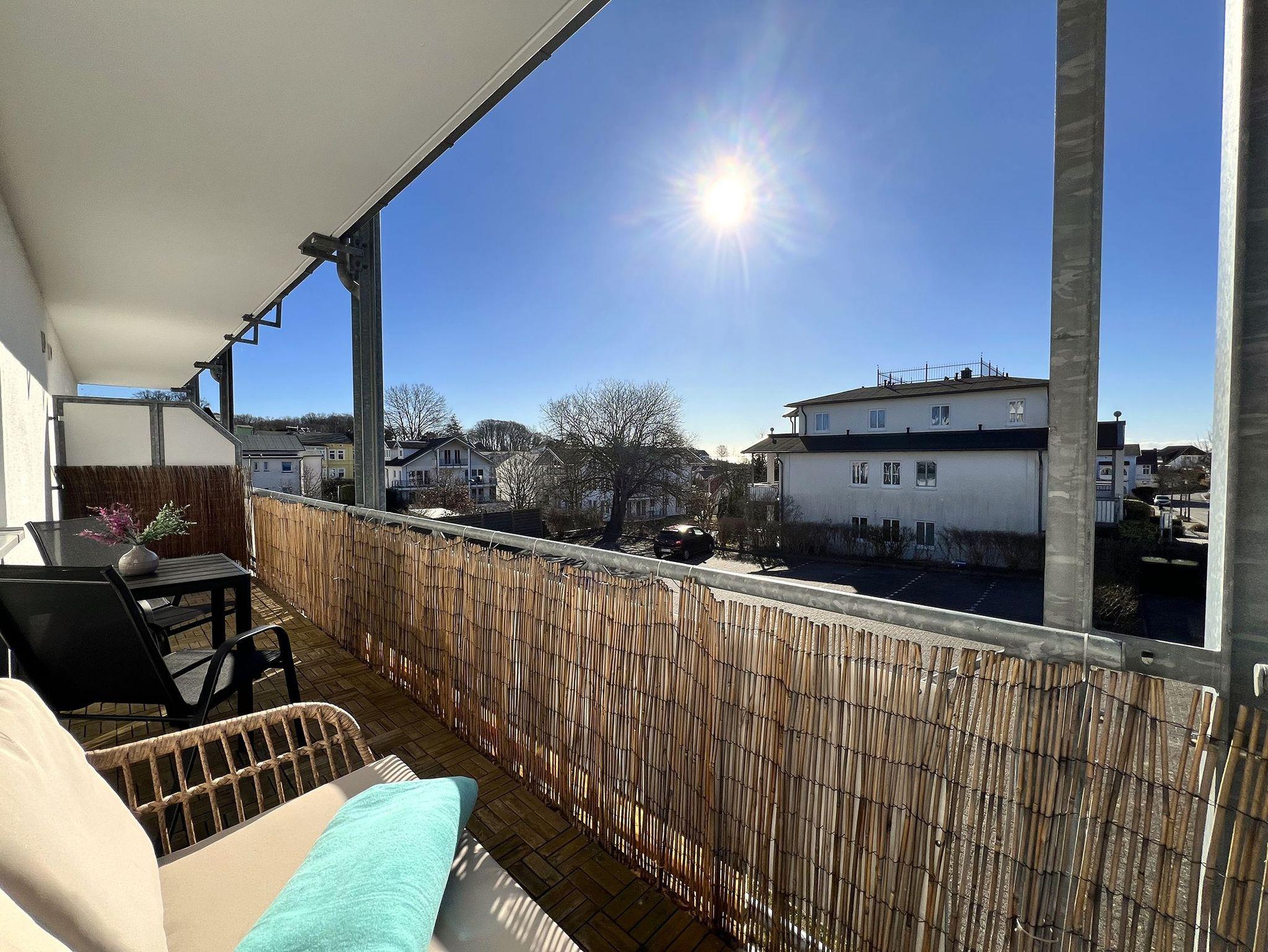Ein besonderes Highlight ist der Eckbalkon, der sich über zwei Seiten der Wohnung erstreckt. Hier genießt man morgens die ersten Sonnenstrahlen auf der südöstlichen Seite, während die südwestliche Seite am Nachmittag zum Sonnenbaden oder einem entspannten Kaffee einlädt. Ein gemütlicher Esstisch bietet den perfekten Platz für Mahlzeiten an der frischen Luft.