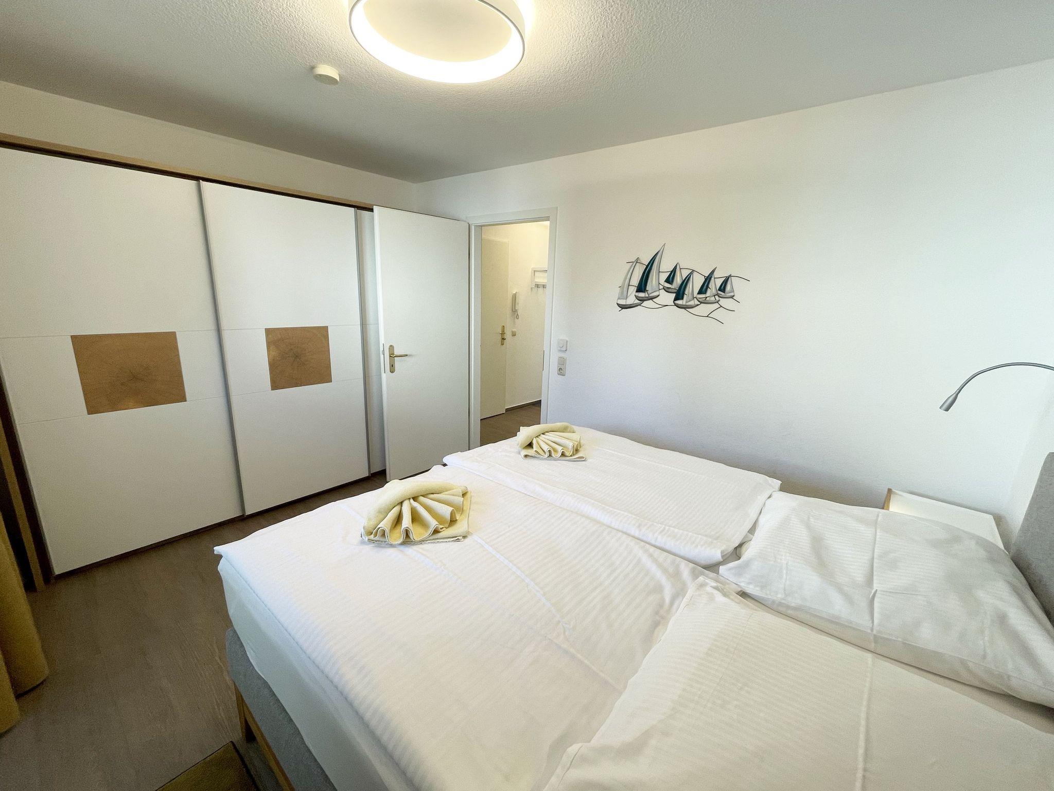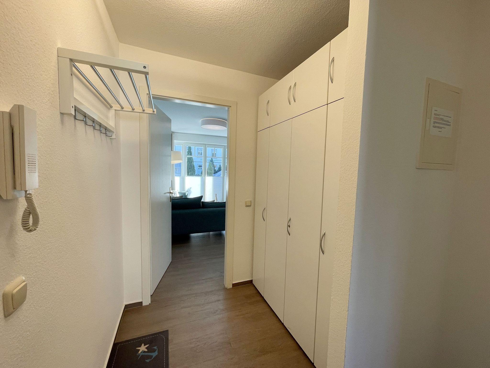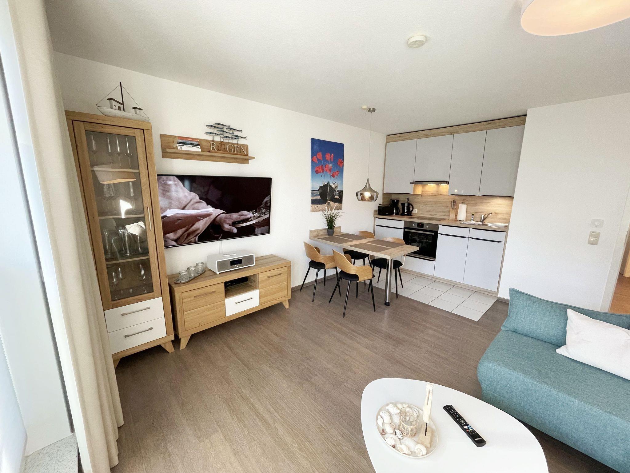 Die komfortabel und modern eingerichtete 2-Zimmer Ferienwohnung besticht mit einer durchdachten Raumaufteilung. Auf ca. 46 Quadratmetern ist diese Nichtraucherwohnung mit viel Liebe zum Detail eingerichtet. Sie bietet Ihnen Platz für max. 2 Erwachsene + 2 Kinder bis 14 Jahre. Die hochwertig eingerichtete Einbauküche ist ausgestattet mit einem Geschirrspüler, einen Kühlschrank mit Eisfach, einen Backofen, ein 4-Zonen-Induktionskochfeld, einer Kaffeemaschine, einen Toaster, einen Wasserkocher und diversen Küchenutensilien. Der helle Wohnbereich wird bestimmt durch seine bodentiefen Fenster (kindersicher abschließbar), die einen weitläufigen Blick auf das Treiben in der Strandstraße zulassen. Hier steht für Sie eine Schlafcouch (Aufbettungsmöglichkeit für 2 Personen, 1,30m x 2,00m), Couchtisch, ein TV-Board, ein Vitrinenschrank und eine Stehlampe bereit. Auf einen Smart-LED-TV im Wohnraum und einen Internetanschluß (WLAN) müssen Sie im Urlaub nicht verzichten. Ein Blu-Ray-Player sowie eine Mini-Stereo-Anlage mit Bluetooth und USB-Anschluss und inkl. Internet-Radio (DAB) runden den Wohnbereich technisch ab. Das Schlafzimmer ist ausgestattet mit einem bequemen Boxspringbett (1,80m x 2,00m), Nachttischablagen, einem geräumigen Kleiderschrank und Verdunkelungsvorhängen. Somit steht einem erholsamen Schlaf hier nichts im Wege! Im innenliegenden Bad sorgen eine ebenerdige Dusche, ein WC, ein Fön sowie ein Waschplatz mit Unterschrank für Ihr Wohlbefinden. Hier finden Sie zusätzlich, wie auch in allen anderen Räumen, eine Fußbodenheizung und hochwertige Bodenbeläge vor. Auf dem kleinen Balkon (Süd/Osten), ausgestattet mit einem Tisch und zwei Stühlen mit Polsterauflagen, können Sie jederzeit die frische Ostseeluft geniessen. Ein Haustier ist gegen eine Gebühr bei uns herzlich willkommen! Im Gemeinschaftskeller des Hauses können Sie gegen einen Aufpreis eine Waschmaschine und einen Trockner nutzen. Hier können Sie auch Ihre mitgebrachten Fahrräder unterstellen. Ihr PKW kann in der angrenzenden Tiefgarage (Nr. 20a / Einfahrtshöhe 2,00m) kostenfrei geparkt werden. Die Erstausstattung eines Wäschepaketes (komplette Bettwäsche, 1 Duschhandtuch, 2 kleine Handtücher, 2 Geschirrhandtücher) können Sie bis 14 Tage vor Anreise gegen einen Aufpreis dazu buchen oder durch eigene ergänzen.