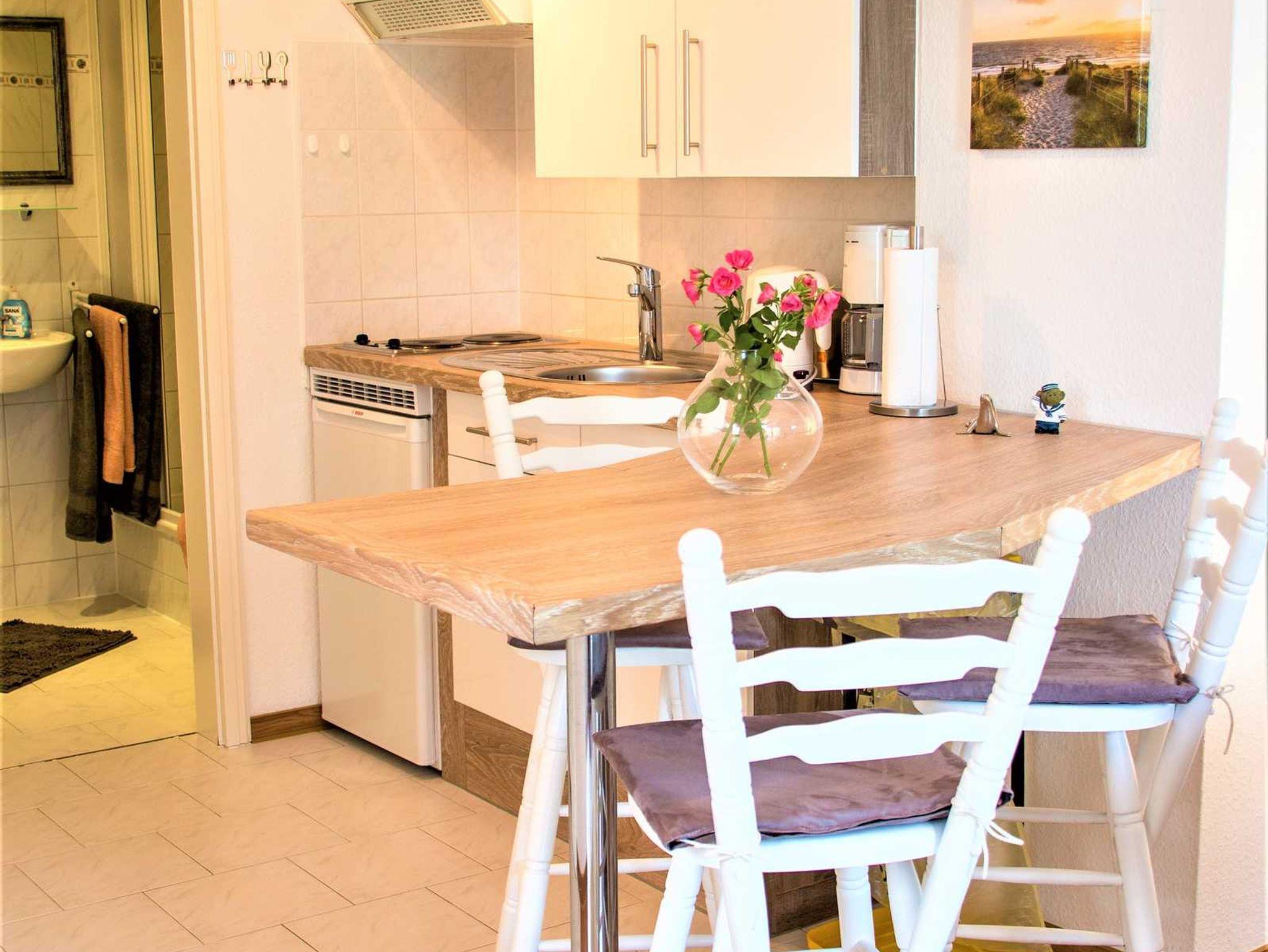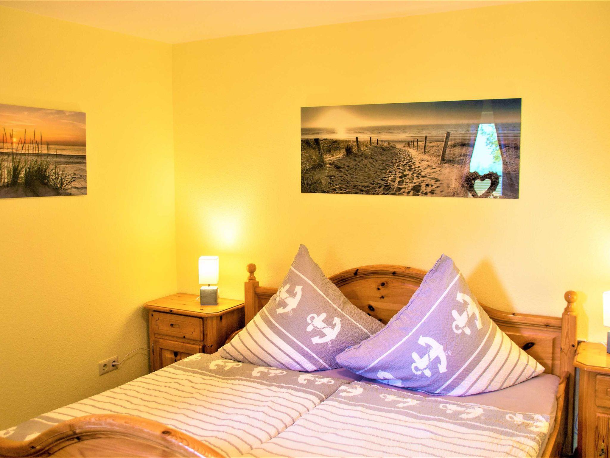 Im Wohnzimmer befindet sich auch eine kleine Küchenzeile mit Herd, Abzugshaube, Kühlschrank und Kaffeemaschine, Toaster und Esstisch mit Stühlen. Das Schlafzimmer verfügt über ein Doppelbett mit Nachtschränken, Leselampen sowie einem Kleiderschrank. Im modernen Bad finden Sie Dusche, Waschbecken und WC. Bei Ihrer Anreise sind die Betten selbstverständlich bereits mit Bettwäsche bezogen. Handtücher sowie Strandhandtücher bringen Sie bitte selbst mit.