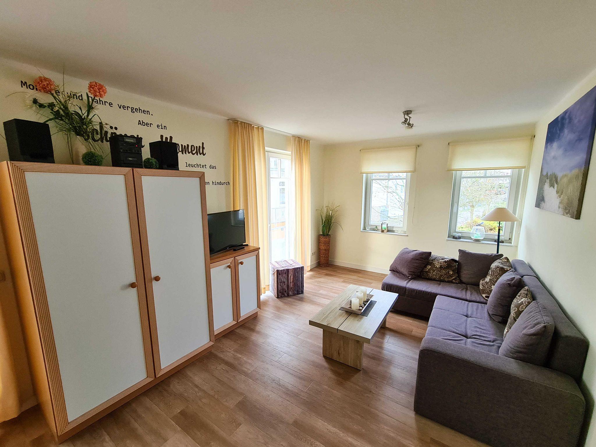* Wohnzimmer mit Sitzecke (Doppelschlafcouch) TV, komplett eingerichtete Küchenzeile (Cerankochfeld, Spülmaschine) mit Esstisch und Balkon