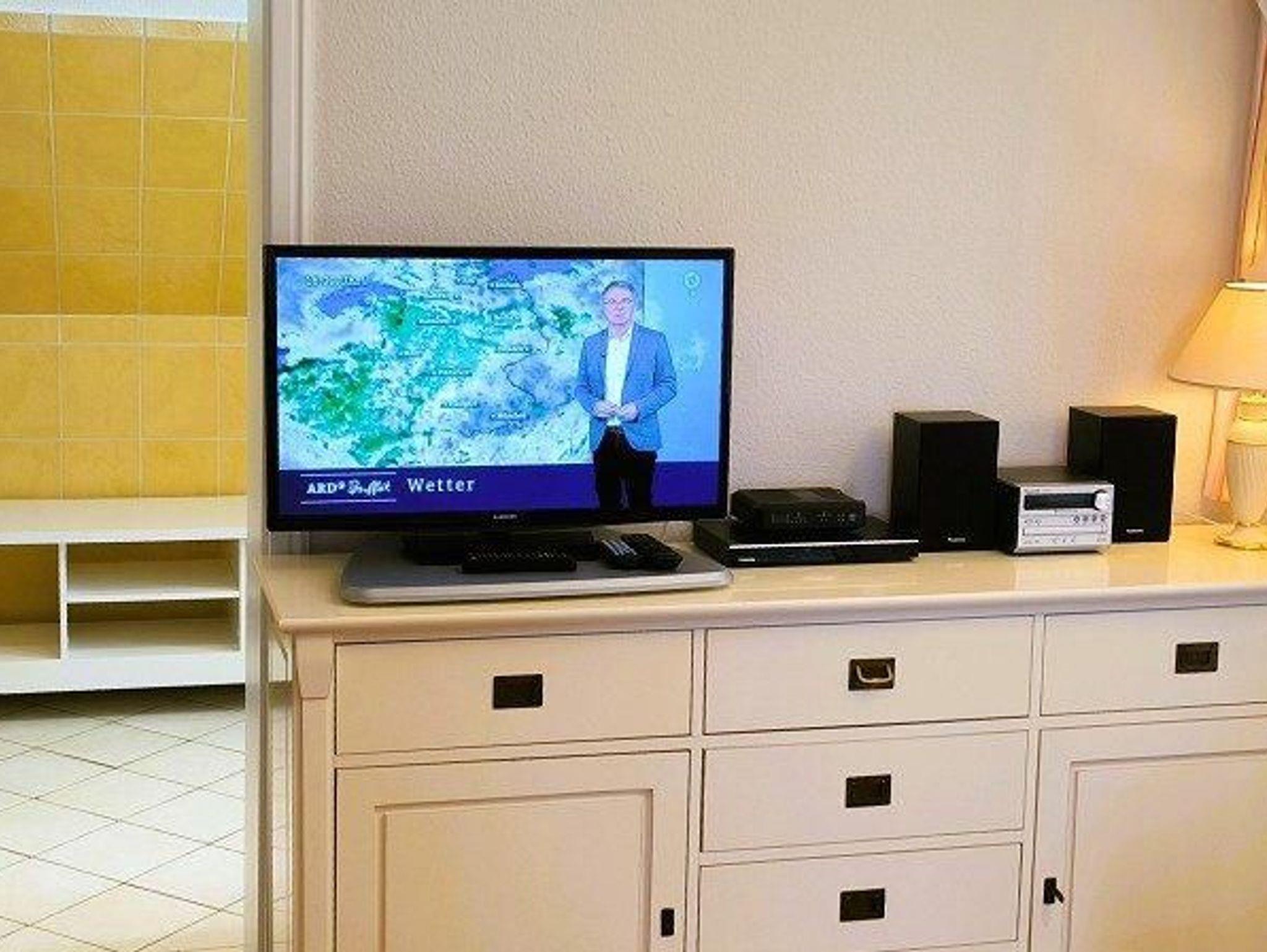 * 1 Wohnzimmer mit einer Aufbettungscouch, 1 Couchtisch, 1 Sessel, Kommode mit Flat-TV, eine Wohnwand, CD-Radio, Gesellschaftsspiele