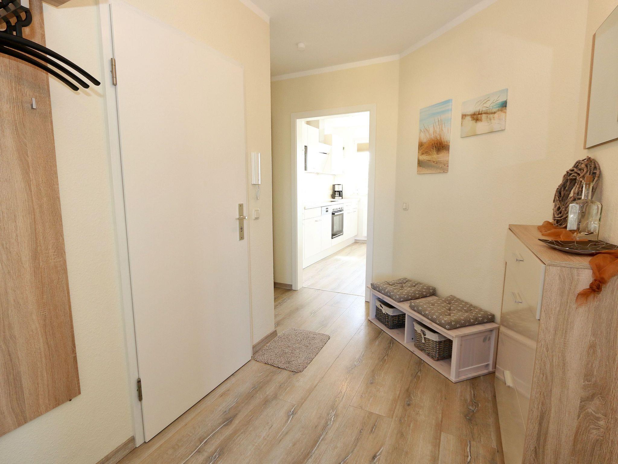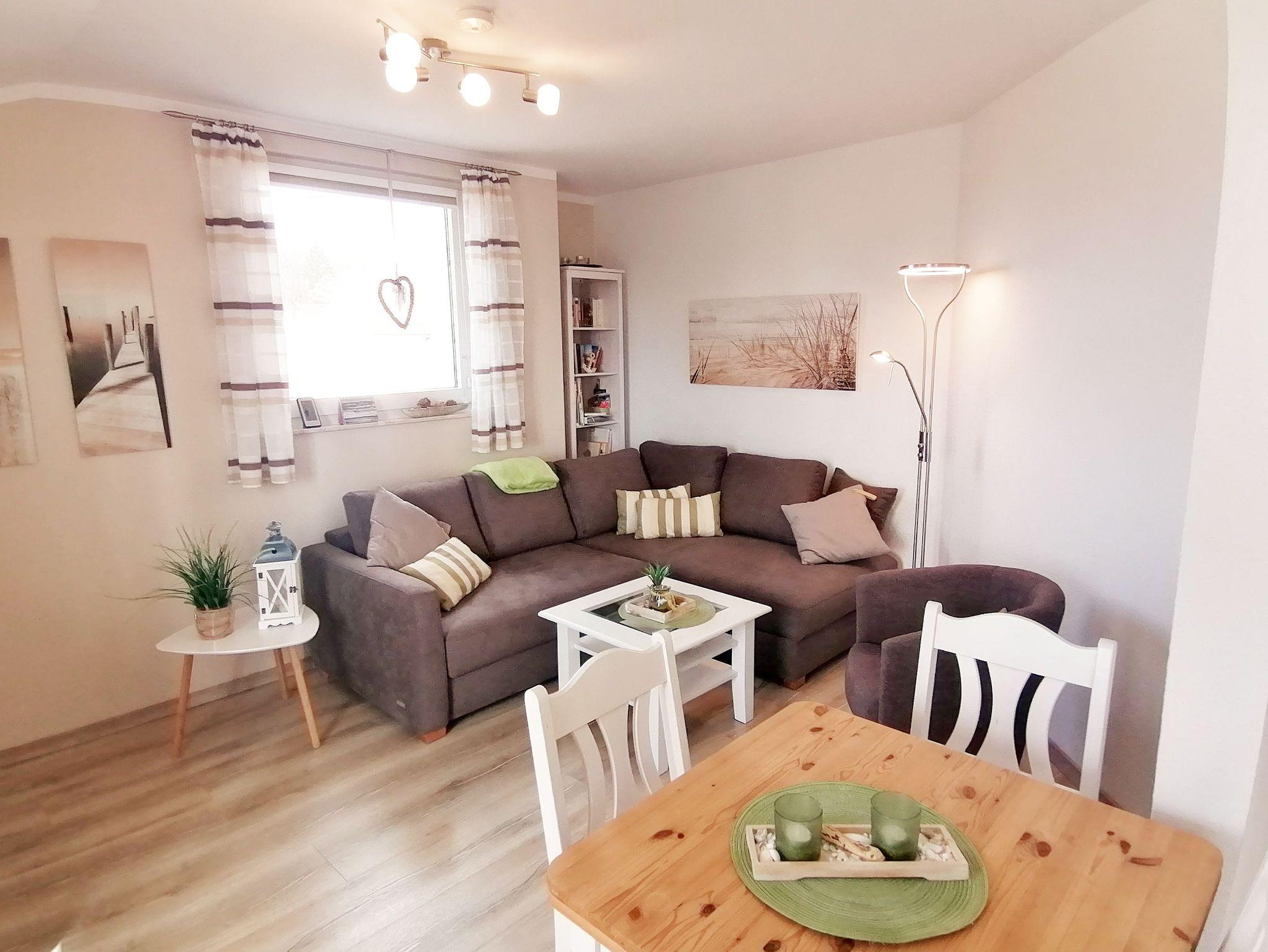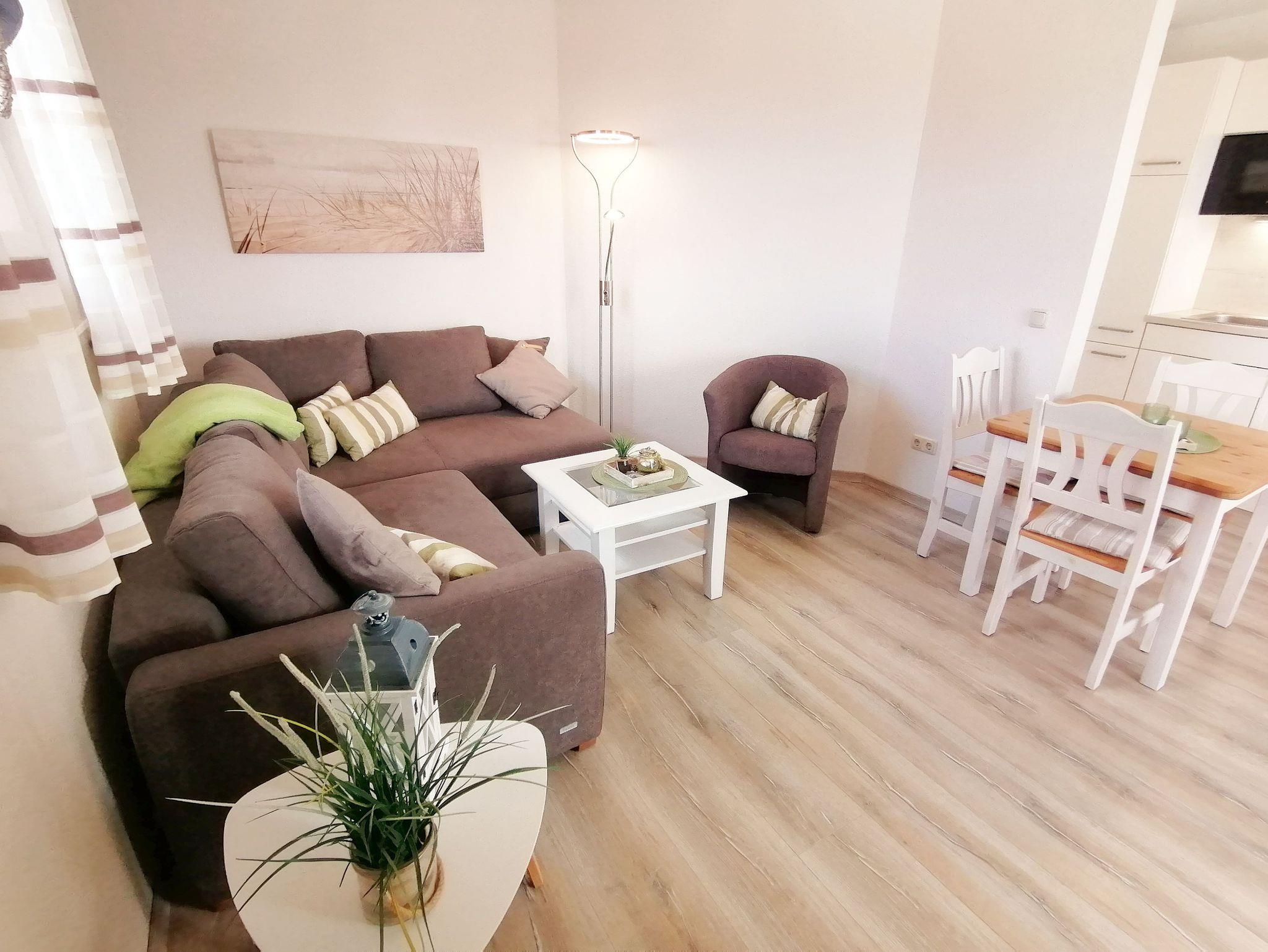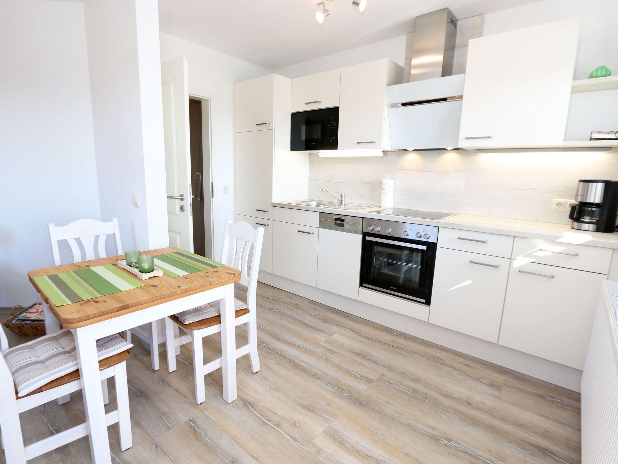 Die gemütliche 2-Zimmerwohnung (Nichtraucher) befindet sich im 2. Obergeschoss des modernen Anbaus der Villa Vineta. Die Wohnung ist mit einem Bodenbelag in Holzoptik sowie hellen Wohnzimmermöbeln ausgestattet. Mit Ihren ca. 50 m² bietet Ihnen die Wohnung ausreichend Platz für 2-3 Personen. Die Wohnung besteht aus einem separaten Schlafzimmer (ruhig nach Norden gelegen) mit einem Doppelbett (1,80m x 2,00m), verstellbare Lattenroste, Nachttischkonsolen sowie einem Kleiderschrank. Ein Kinderreisebett mit Matratze (ohne Bett Inlett) kann hier aufgestellt werden. Der kombinierte Wohn-/Essbereich ist mit einer Boxspring Schlafcouch (1,25m x 2,00m, Aufbettungsmöglichkeit für 3. Person) mit Couchtisch, einer Leselampe, kleinem Sideboard mit Smart-TV (43 Zoll) mit HD-Qualität, Blu-Ray-Player und einer Stereoanlage ausgestattet. Die offene, neue Küchenzeile bietet eine komplette Ausstattung mit Backofen, Ceranfeld, Mikrowelle, Geschirrspüler, Kühlschrank mit Gefrierfach, Kaffeemaschine, Senseo Padmaschine, Toaster, Wasserkocher und diversen Küchenutensilien. Ein Essplatz mit Tisch und Stühlen schließt sich dem Küchenbereich an. Vom Wohnbereich aus erreichen Sie den überdachten und bestuhlten Südbalkon, von dem Sie einen Meerblick in Richtung Südstrand und der Halbinsel Mönchgut haben. Das Schlafzimmer sowie der Wohnbereich sind mit Insektenschutz und Verdunklungsplissees versehen. Das geflieste Tageslichtbad ist mit einem Waschtisch, Fön, Kosmetikspiegel, WC und Dusche ausgestattet. Ein PKW-Stellplatz Nr. 14 gehört zur Wohnung und befindet sich hinter dem Haus. Für Ihre geliehenen oder auch mitgebrachten Fahrräder steht Ihnen ein Fahrradständer sowie ein Fahrradkeller zur Verfügung. Auf einen Internetzugang (WLAN) brauchen Sie nicht zu verzichten. Dieser ist inklusive für Sie. Haustiere sind nicht erlaubt. Die Erstausstattung eines Wäschepaketes (komplette Bettwäsche, 1 Duschhandtuch, 2 kleine Handtücher) können Sie bis 14 Tage vor Anreise gegen einen Aufpreis dazu buchen oder durch eigene ergänzen. Ab 2 gebuchten Paketen erhalten Sie einmalig 1 Geschirrhandtuch und 1 Duschvorleger hinzu.
