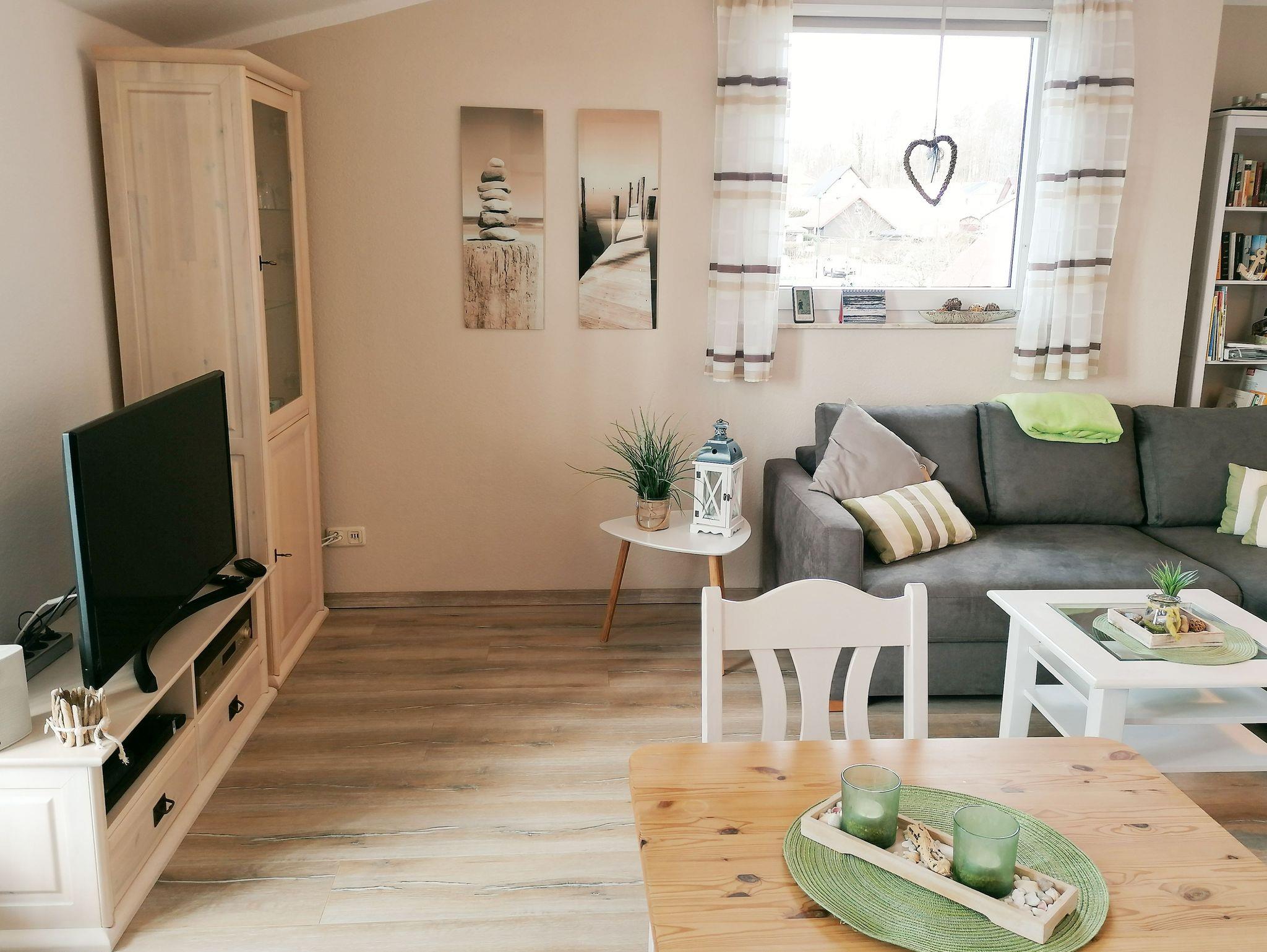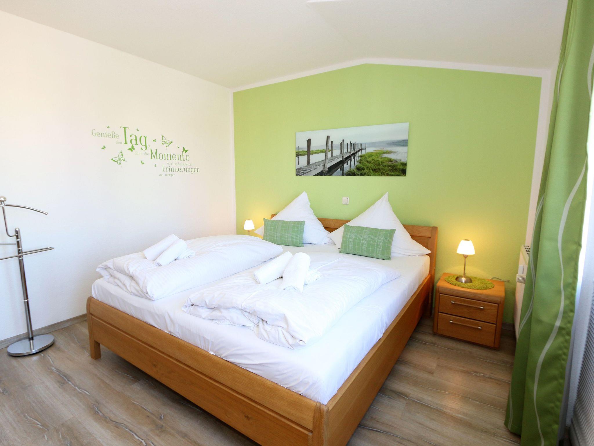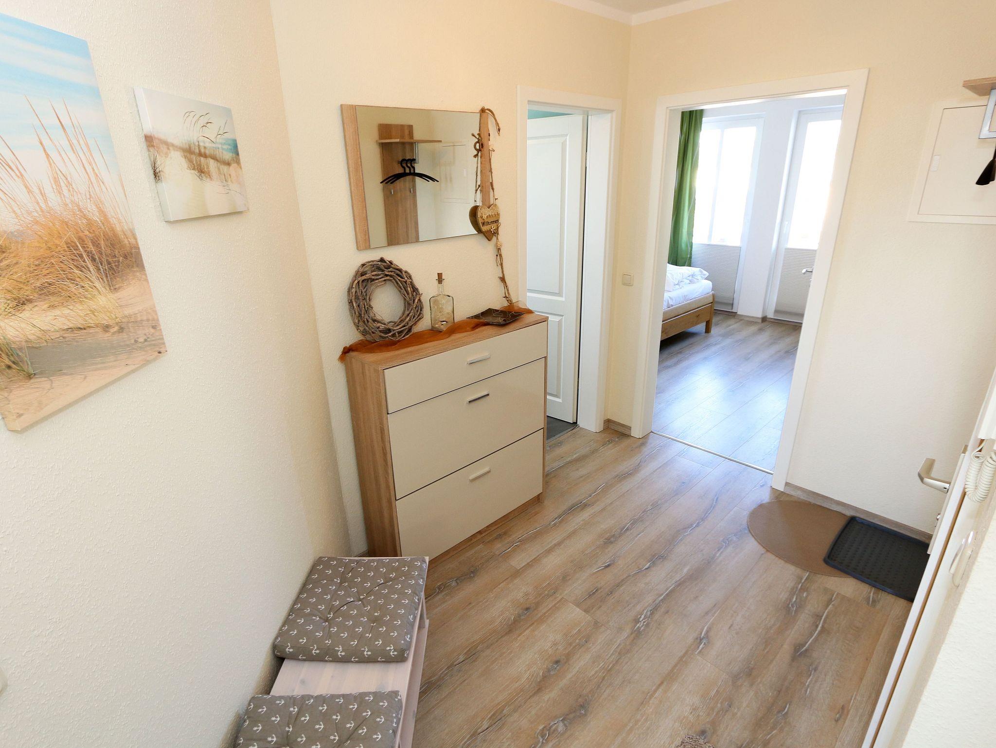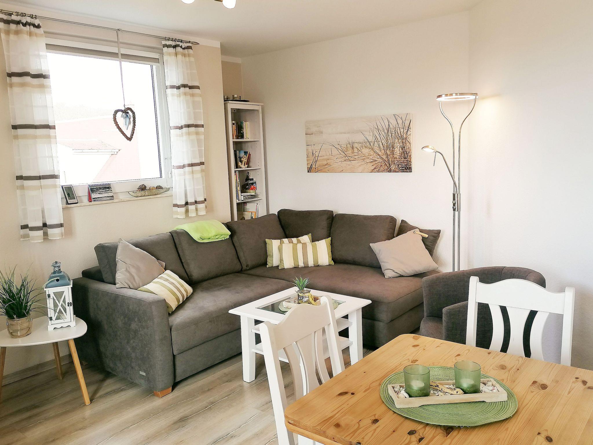 Die gemütliche 2-Zimmerwohnung (Nichtraucher) befindet sich im 2. Obergeschoss des modernen Anbaus der Villa Vineta. Die Wohnung ist mit einem Bodenbelag in Holzoptik sowie hellen Wohnzimmermöbeln ausgestattet. Mit Ihren ca. 50 m² bietet Ihnen die Wohnung ausreichend Platz für 2-3 Personen. Die Wohnung besteht aus einem separaten Schlafzimmer (ruhig nach Norden gelegen) mit einem Doppelbett (1,80m x 2,00m), verstellbare Lattenroste, Nachttischkonsolen sowie einem Kleiderschrank. Ein Kinderreisebett mit Matratze (ohne Bett Inlett) kann hier aufgestellt werden. Der kombinierte Wohn-/Essbereich ist mit einer Boxspring Schlafcouch (1,25m x 2,00m, Aufbettungsmöglichkeit für 3. Person) mit Couchtisch, einer Leselampe, kleinem Sideboard mit Smart-TV (43 Zoll) mit HD-Qualität, Blu-Ray-Player und einer Stereoanlage ausgestattet. Die offene, neue Küchenzeile bietet eine komplette Ausstattung mit Backofen, Ceranfeld, Mikrowelle, Geschirrspüler, Kühlschrank mit Gefrierfach, Kaffeemaschine, Senseo Padmaschine, Toaster, Wasserkocher und diversen Küchenutensilien. Ein Essplatz mit Tisch und Stühlen schließt sich dem Küchenbereich an. Vom Wohnbereich aus erreichen Sie den überdachten und bestuhlten Südbalkon, von dem Sie einen Meerblick in Richtung Südstrand und der Halbinsel Mönchgut haben. Das Schlafzimmer sowie der Wohnbereich sind mit Insektenschutz und Verdunklungsplissees versehen. Das geflieste Tageslichtbad ist mit einem Waschtisch, Fön, Kosmetikspiegel, WC und Dusche ausgestattet. Ein PKW-Stellplatz Nr. 14 gehört zur Wohnung und befindet sich hinter dem Haus. Für Ihre geliehenen oder auch mitgebrachten Fahrräder steht Ihnen ein Fahrradständer sowie ein Fahrradkeller zur Verfügung. Auf einen Internetzugang (WLAN) brauchen Sie nicht zu verzichten. Dieser ist inklusive für Sie. Haustiere sind nicht erlaubt. Die Erstausstattung eines Wäschepaketes (komplette Bettwäsche, 1 Duschhandtuch, 2 kleine Handtücher) können Sie bis 14 Tage vor Anreise gegen einen Aufpreis dazu buchen oder durch eigene ergänzen. Ab 2 gebuchten Paketen erhalten Sie einmalig 1 Geschirrhandtuch und 1 Duschvorleger hinzu.
