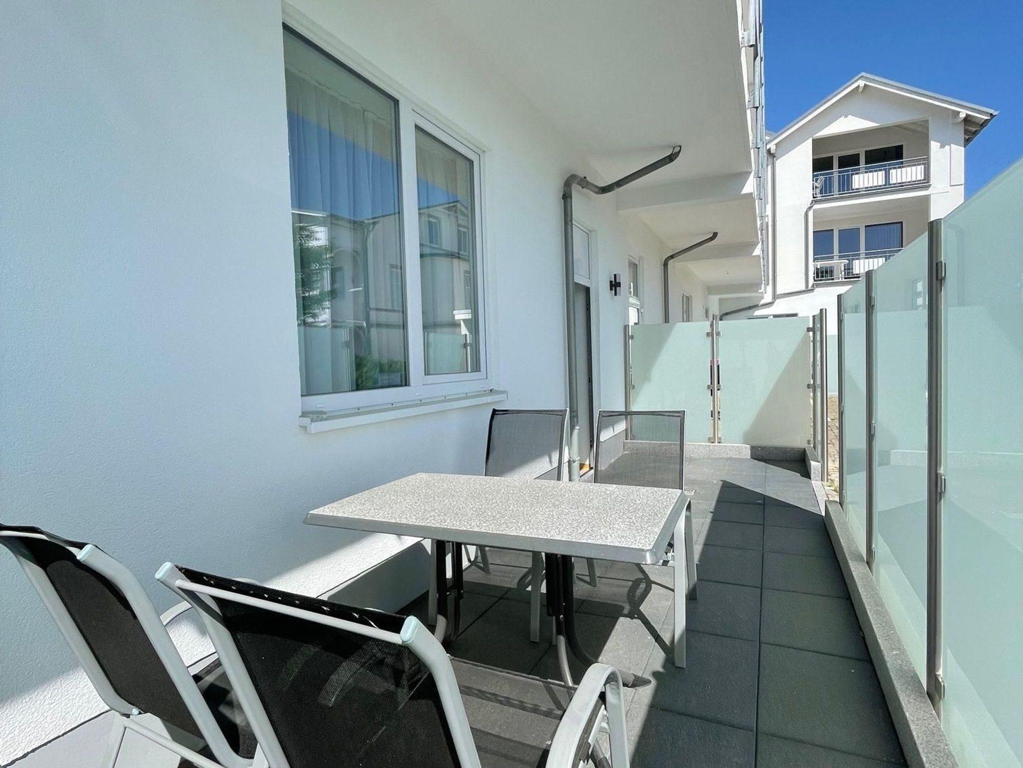 Die schöne Terrasse mit Gartenmöbeln lädt zu gemütlichen Stunden ein. Hier können Sie die Abende bei einem Glas Wein ausklingen lassen und jederzeit die gute Ostseeluft und Sonne auf Rügen genießen.