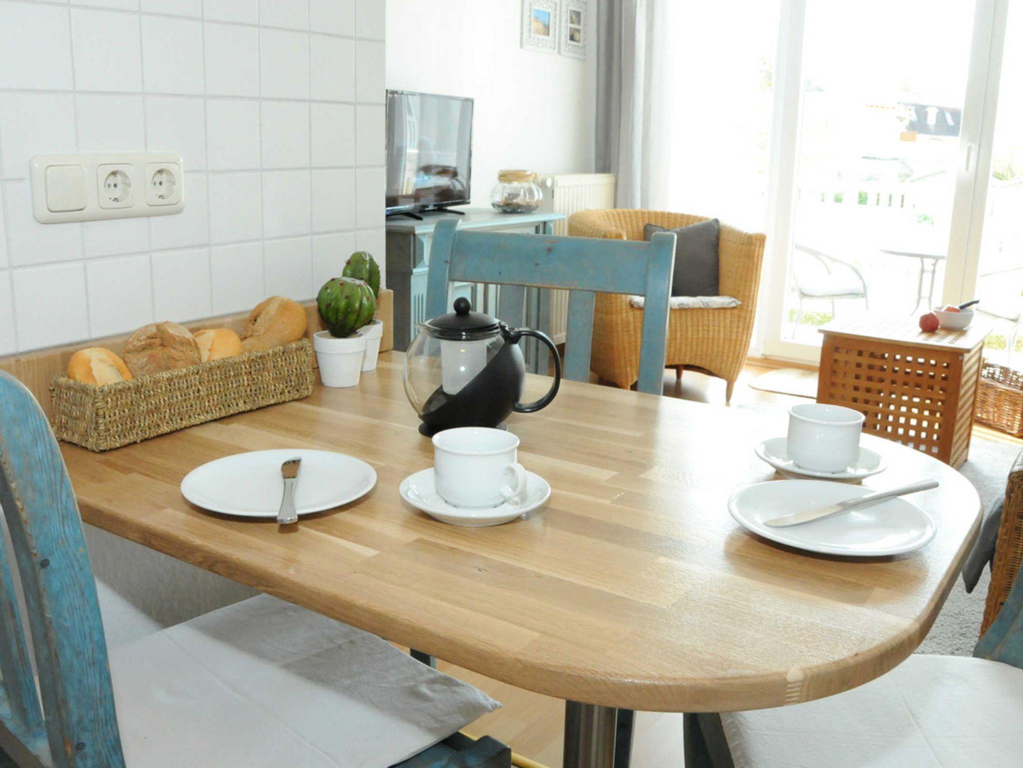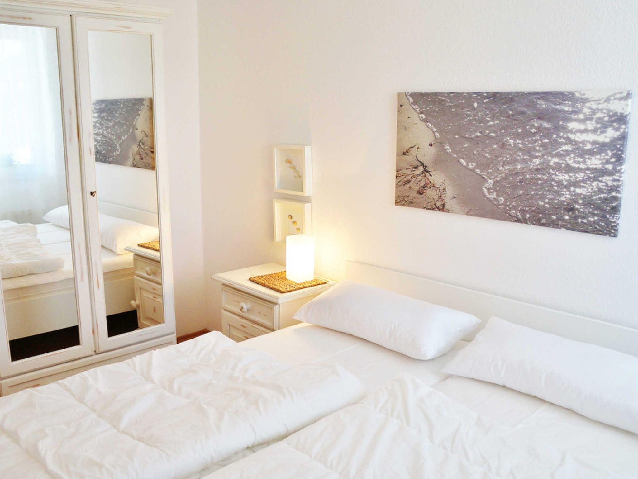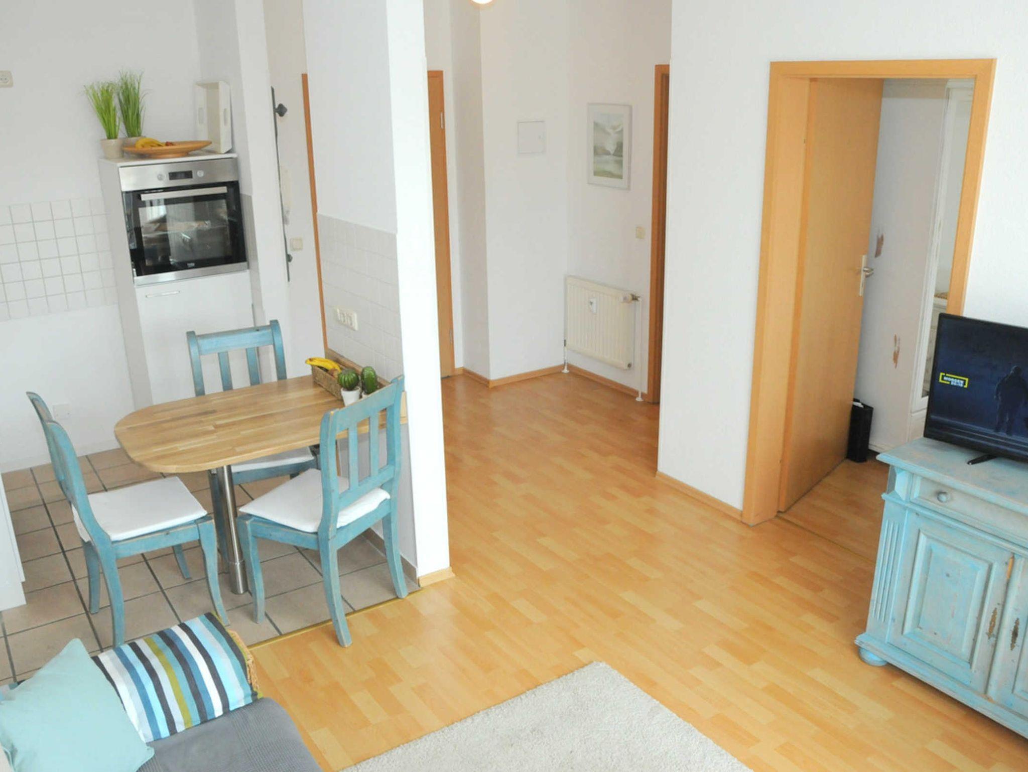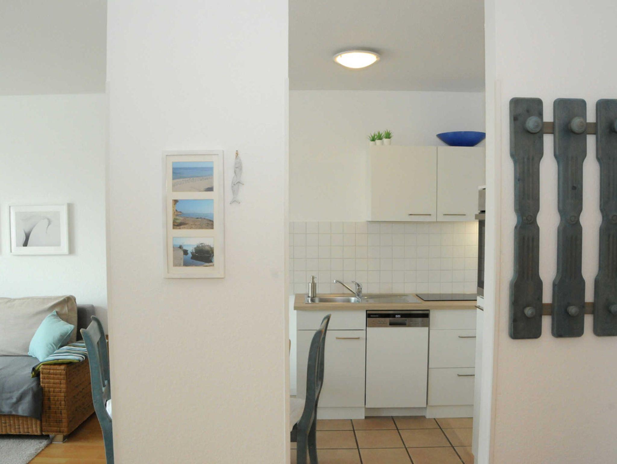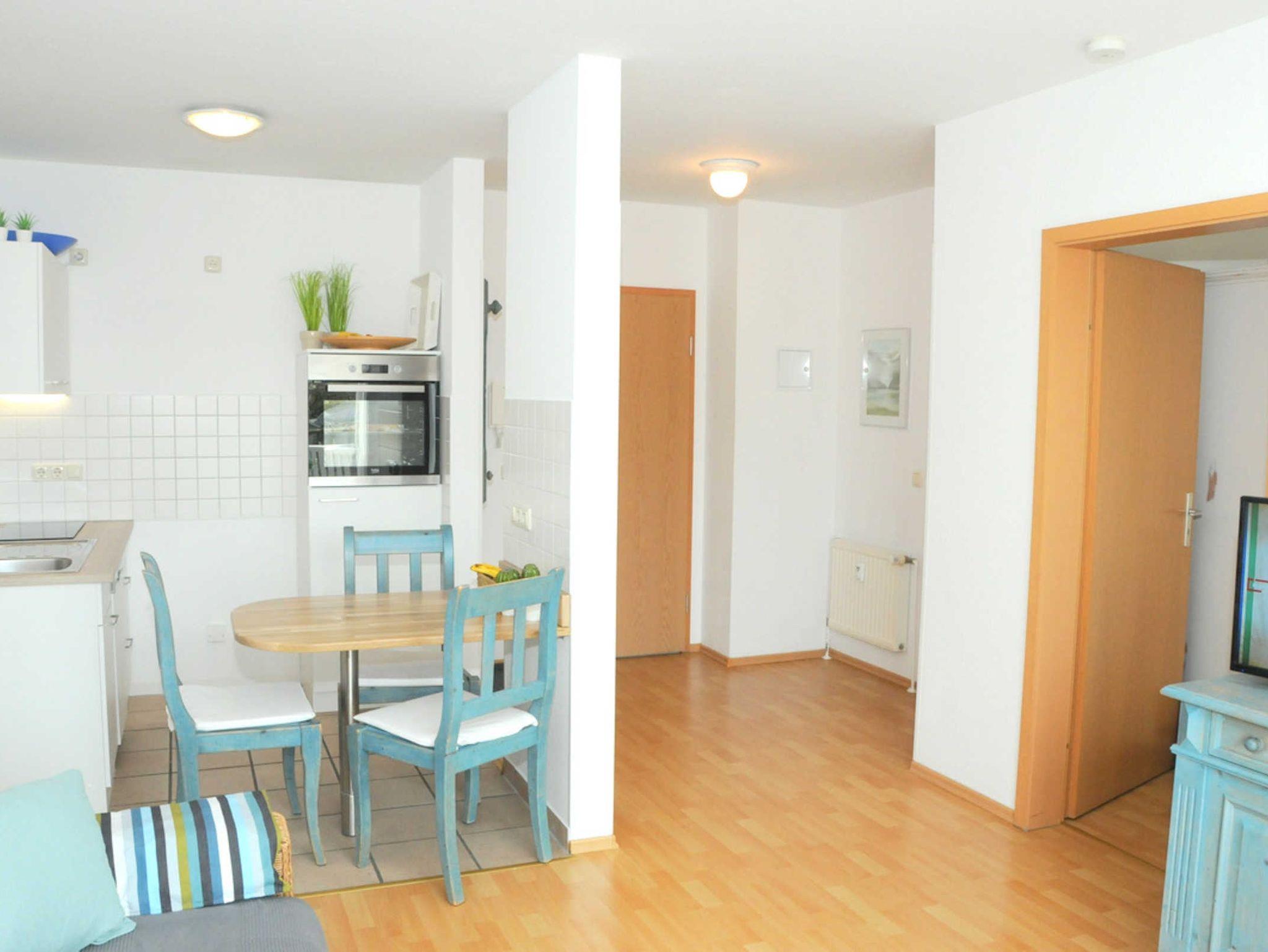 Hell und freundlich empfängt Sie diese 2-Zimmer-Ferienwohnung mit ca. 40m². Bis zu 2 Erwachsene finden hier Ruhe und Erholung in 250m Strandnähe. Nachdem Sie Ihre Garderobe im Eingangsbereich abgelegt haben, betreten Sie den lichtdurchfluteten Wohn- und Essbereich, in dem Sie sich sofort wie zu Hause fühlen werden. Ein komfortables Sofa, ein TV, sowie ein Esstisch mit ausreichend Platz bietet Ihnen viel Raum für Ihre Freizeitgestaltung. Auf dem möblierten Balkon können Sie ausgiebig frühstücken oder ein gutes Buch genießen.