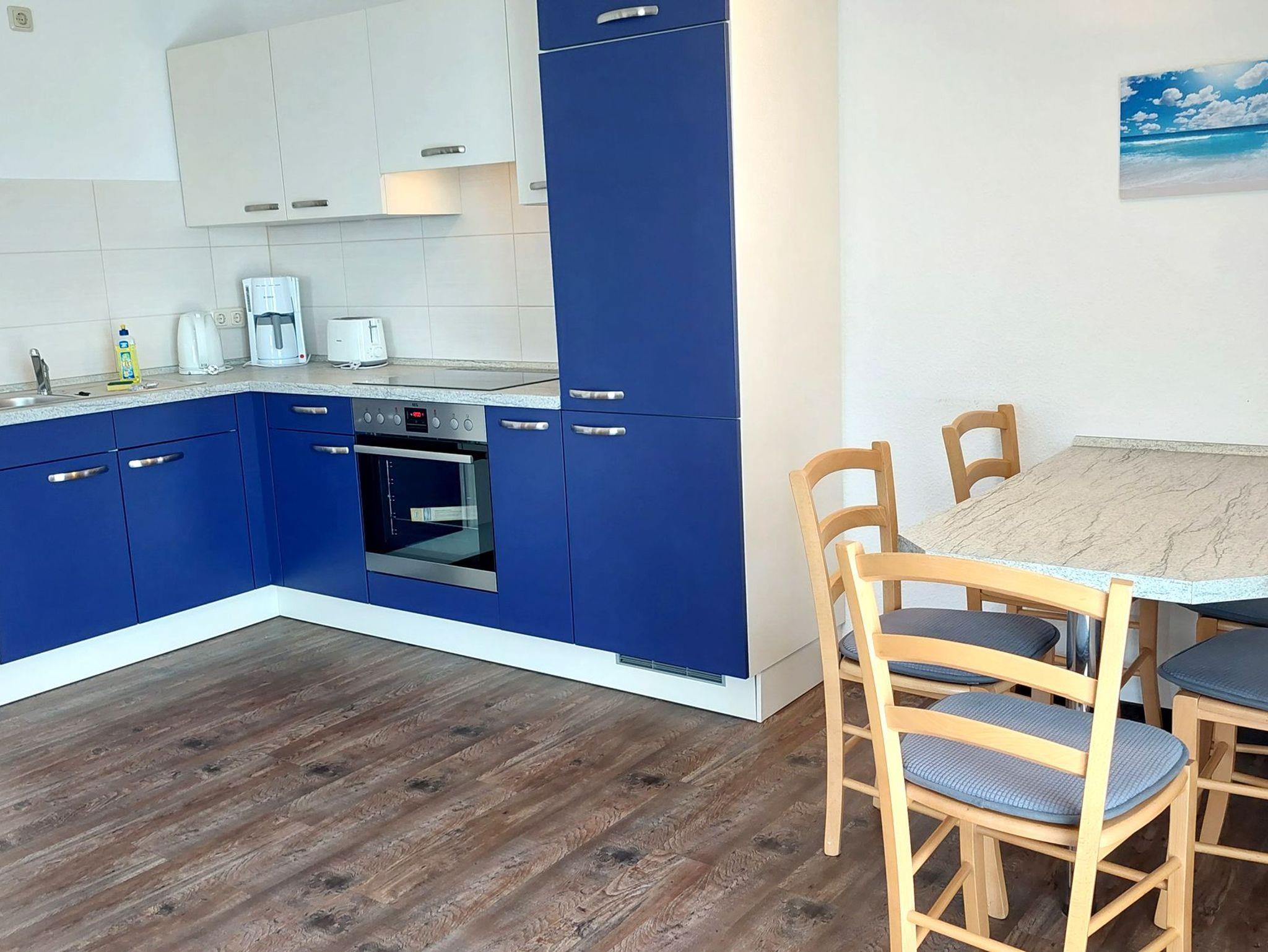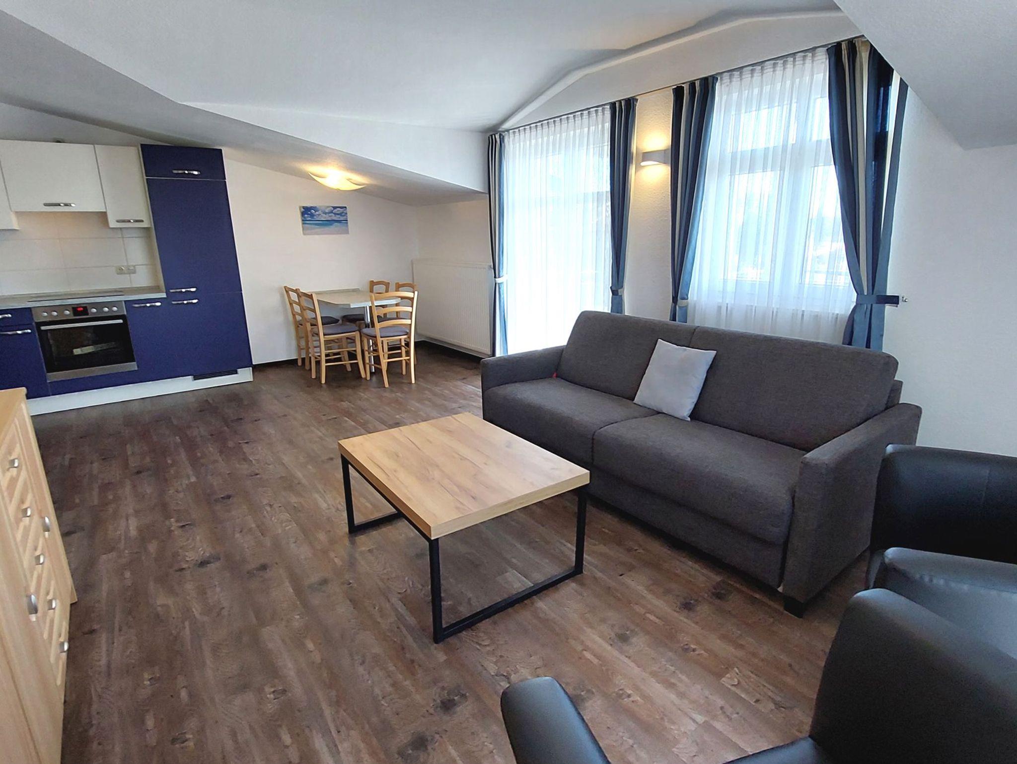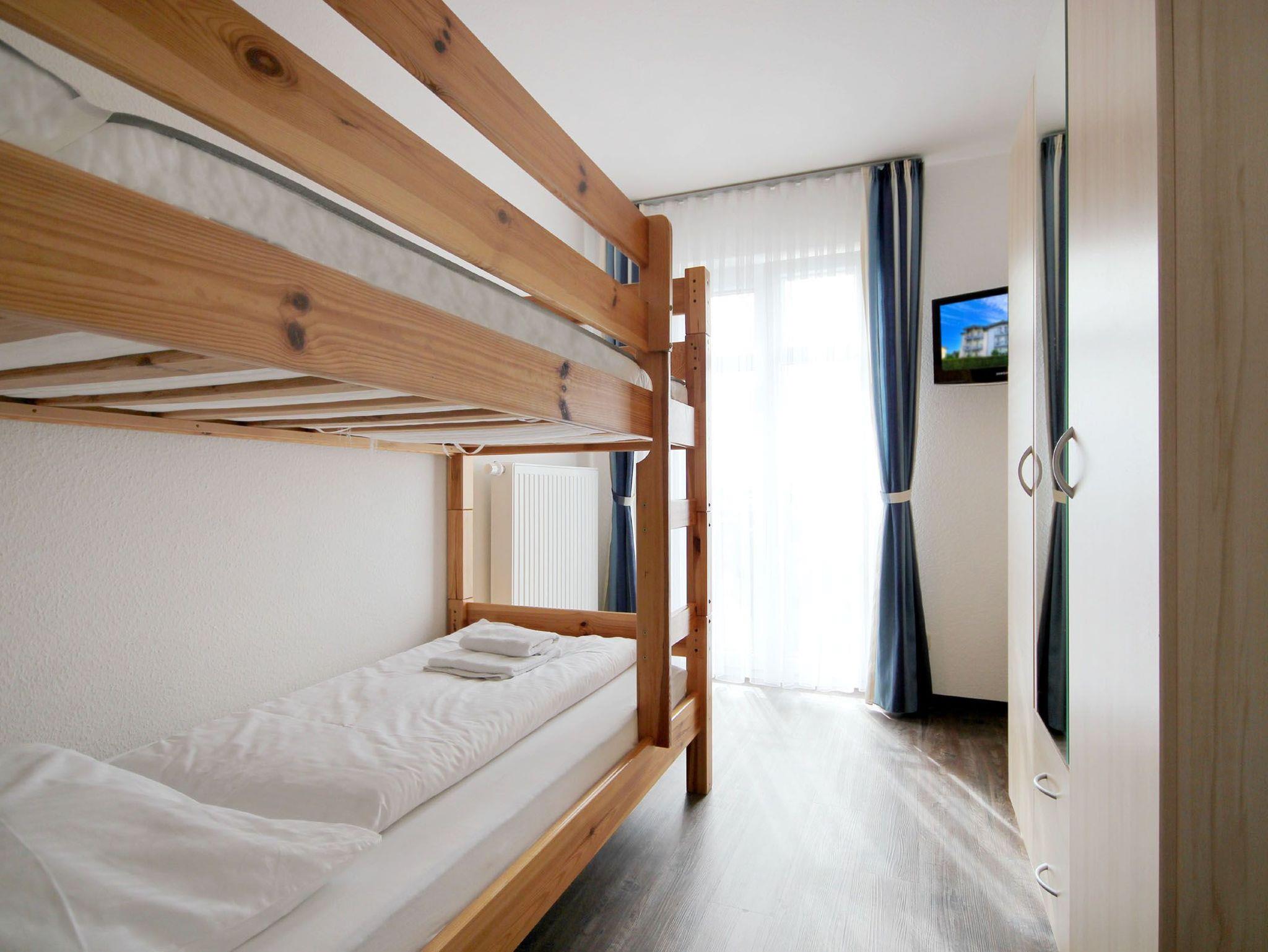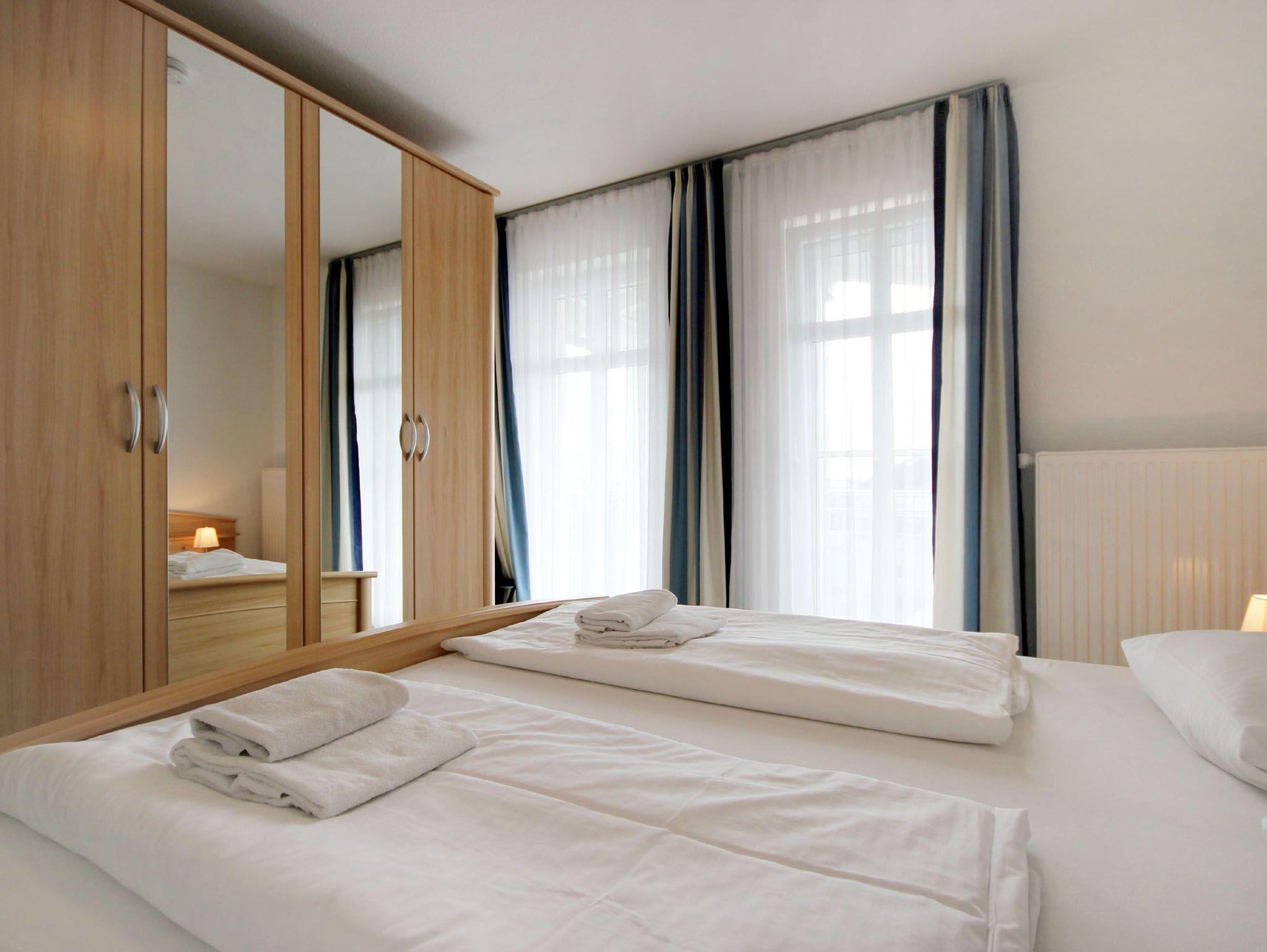 Diese freundliche Wohnung ist aufgeteilt in einen Wohnraum mit Balkon und integrierter Küchenzeile, zwei Schlafzimmer und ein Bad mit Badewanne, Waschtisch und WC. Das Wohnzimmer begrüßt Sie mit einem Schlafsofa und Sessel sowie Flachbild-TV. Das Hauptschlafzimmer verfügt über ein Doppelbett (1,80m x 2m), zusätzlichem Balkon sowie einen Kleiderschrank. Der zweite Schlafraum begrüßt Sie mit einem Etagenbett, Kleiderschrank und TV. Die Küchenzeile ist mit Backofen, Geschirrspüler, Cerankochfeld, Kühlschrank mit kleinem Gefrierfach, Cerankochfeld, Mikrowelle, Kaffeemaschine, Wasserkocher und Toaster ausgestattet. Highlights: Kostenfreies WLAN sowie ein frei wählbarer PKW-Stellplatz direkt am Haus.