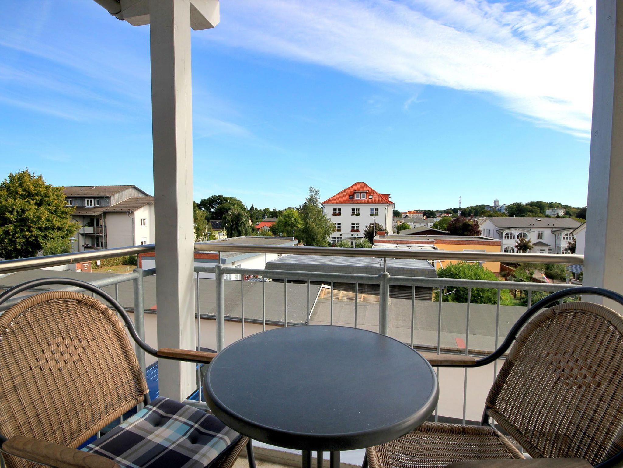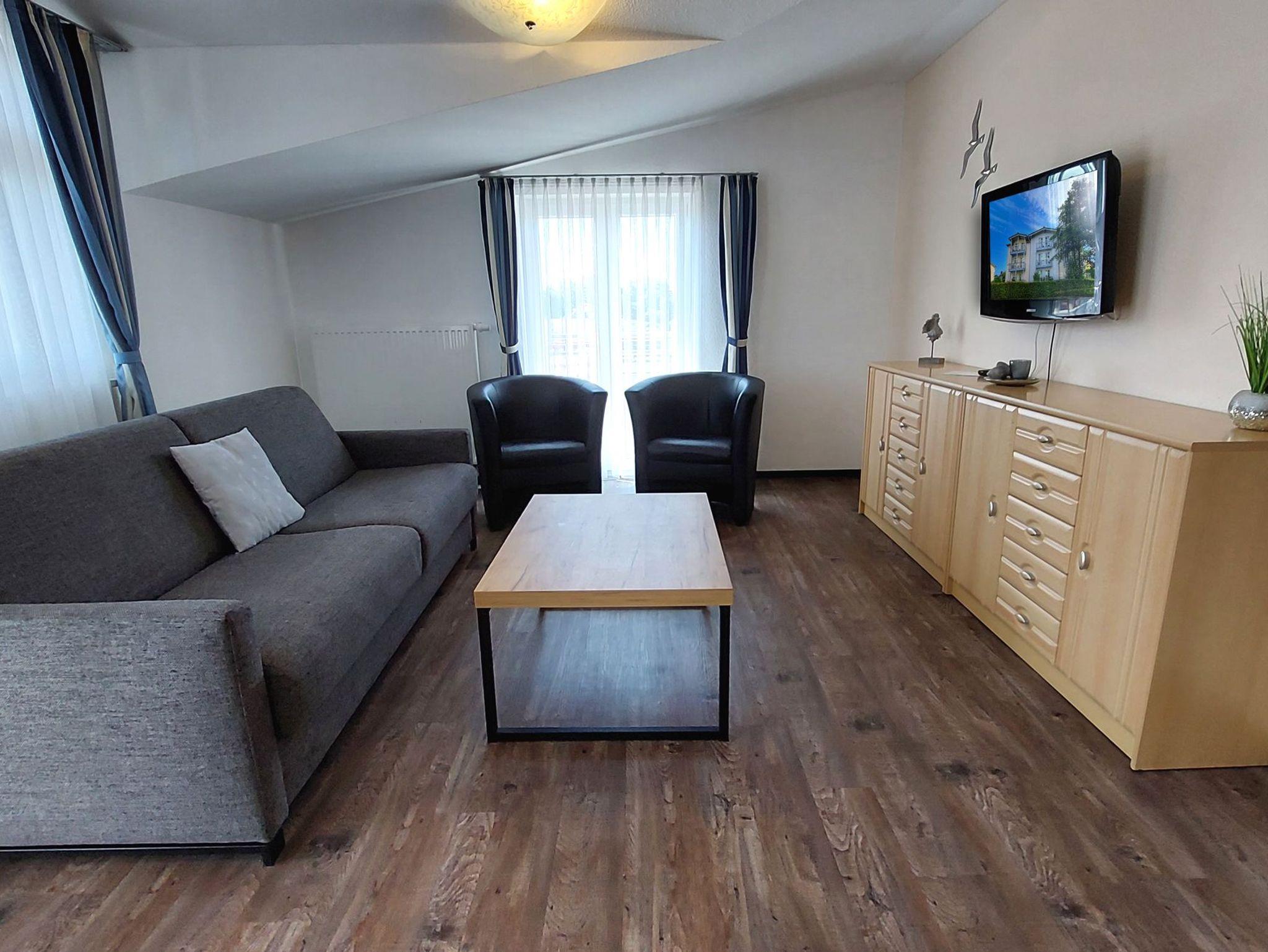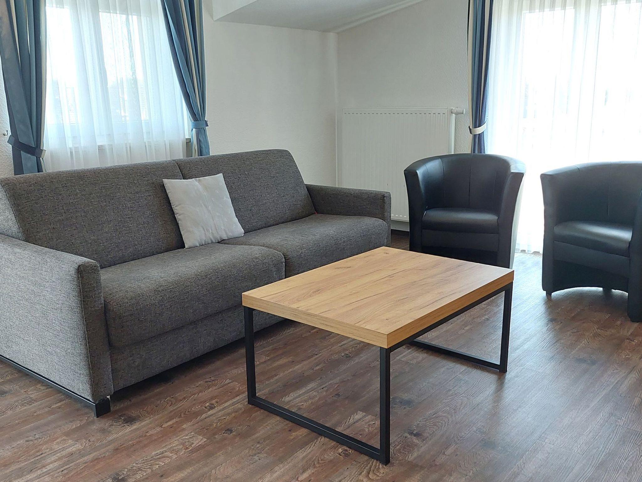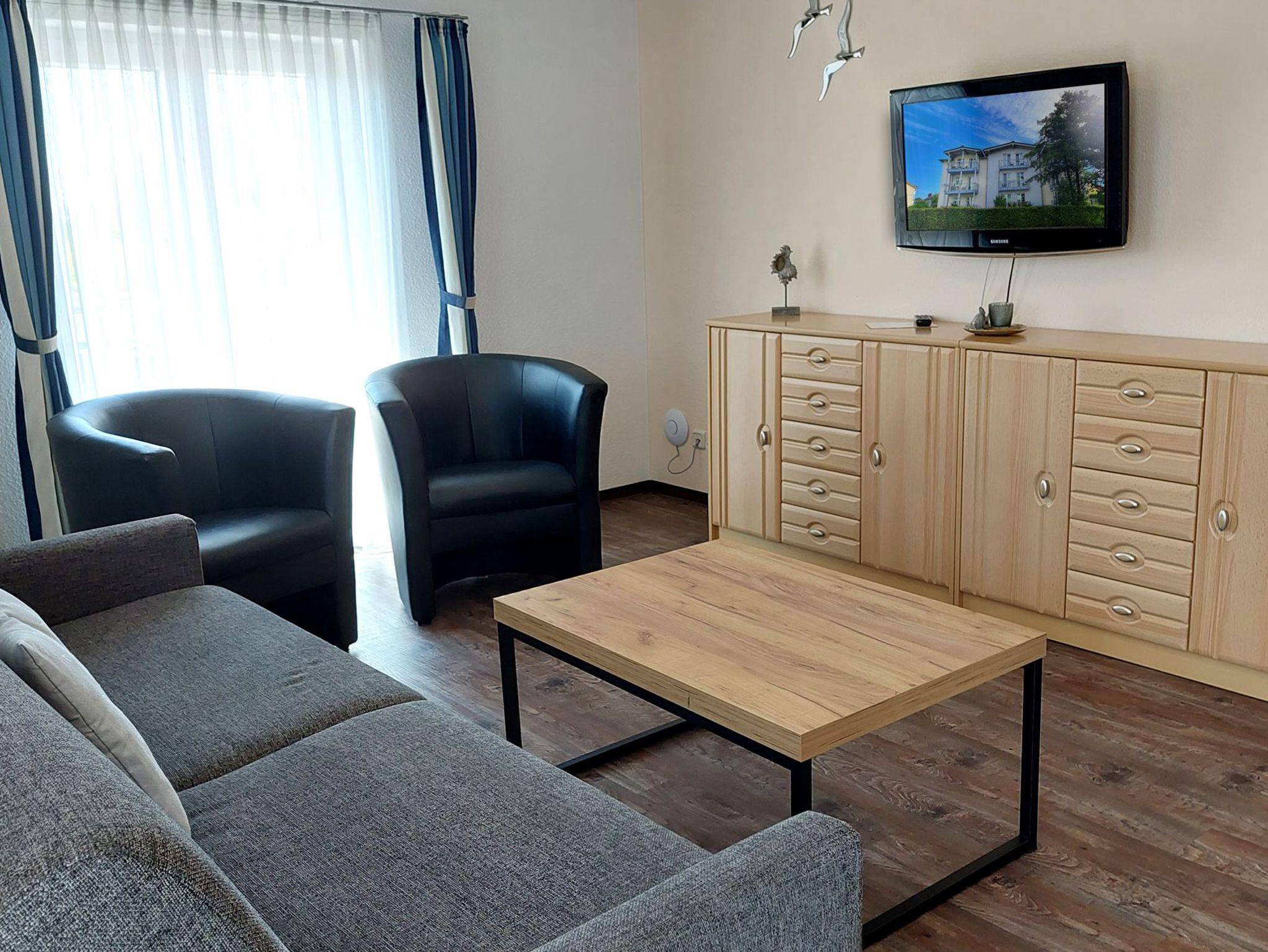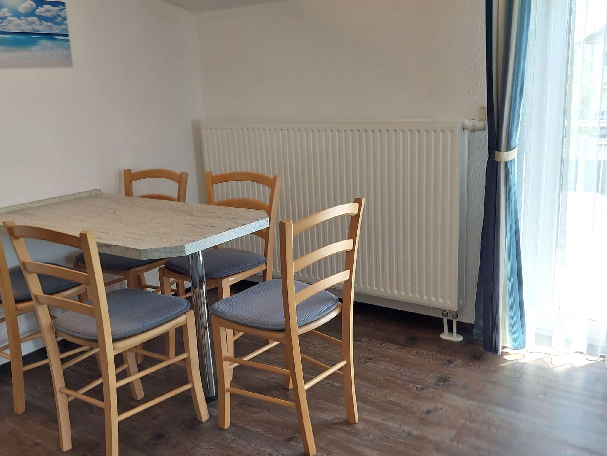 Diese freundliche Wohnung ist aufgeteilt in einen Wohnraum mit Balkon und integrierter Küchenzeile, zwei Schlafzimmer und ein Bad mit Badewanne, Waschtisch und WC. Das Wohnzimmer begrüßt Sie mit einem Schlafsofa und Sessel sowie Flachbild-TV. Das Hauptschlafzimmer verfügt über ein Doppelbett (1,80m x 2m), zusätzlichem Balkon sowie einen Kleiderschrank. Der zweite Schlafraum begrüßt Sie mit einem Etagenbett, Kleiderschrank und TV. Die Küchenzeile ist mit Backofen, Geschirrspüler, Cerankochfeld, Kühlschrank mit kleinem Gefrierfach, Cerankochfeld, Mikrowelle, Kaffeemaschine, Wasserkocher und Toaster ausgestattet. Highlights: Kostenfreies WLAN sowie ein frei wählbarer PKW-Stellplatz direkt am Haus.