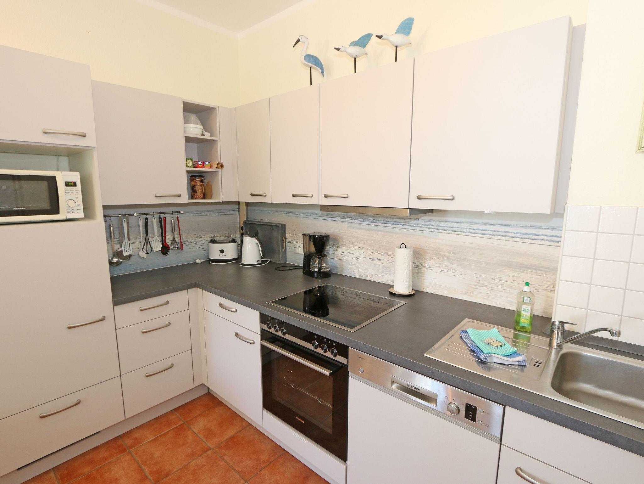 Die 3-Raumferienwohnung (Nichtraucher) liegt im 1. Obergeschoss und bietet mit Ihren ca. 68 qm ausreichend Platz für 2-4 Erwachsene + 1 Kleinkind bis 3 Jahre im Kinderreisebett. Der offene Wohnbereich verfügt über einer Couch, einem Sessel, Couchtisch, Leselampe und Sideboard mit TV, DVD-Player und Mini-Stereo-Anlage mit USB-Anschluss und DAB-Radio. Auch auf einen Internetanschluss (WLAN) müssen Sie im Urlaub nicht verzichten. Die integrierte Küchenzeile mit Cerankochfeld, Backofen, Geschirrspüler, Kühlschrank, Gefrierfach, Mikrowelle, Kaffeemaschine, Wasserkocher, Toaster und diverse Küchenutensilien wird mit einem Essplatz komplettiert. Die Wohnung hat zwei Schlafräume. Das große Schlafzimmer ist mit einem Doppelbett (1,80m x 2,00m), einem großen Kleiderschrank, Nachttischablagen und einer Kommode mit Smart-TV eingerichtet. Zusätzlich befindet sich in dem großen Schlafzimmer eine komfortable Leseecke mit einer kleinen Bücherauswahl. Das kleinere Schlafzimmer ist mit einem Boxspringbett (1,60m x 2,00m), einer Kommode und einem kleinen Kleiderschrank eingerichtet sowie ein Tisch mit 1 Sessel. Der Sanitärbereich wir durch eine ebenerdige Dusche, Waschplatz, WC, Kosmetikspiegel und Fön abgerundet. Den möblierten Balkon erreichen Sie vom Wohn-/Essbereich und Schlafzimmer. Alle Räumlichkeiten können durch Vorhänge verdunkelt werden. 1 Haustier (keine Katzen) ist gegen eine Gebühr ein gern gesehener Gast. Im Keller des Hauses können Sie eine Waschmaschine sowie ein Trockner gegen Gebühr nutzen. Ein PKW-Stellplatz Nr. 06 befindet sich direkt hinter dem Haus. Ihre mitgebrachten Fahrräder oder auch geliehenen Räder können Sie im Fahrradschuppen verschließen. Die Erstausstattung eines Wäschepaketes (komplette Bettwäsche, 1 Duschhandtuch, 2 kleine Handtücher) können Sie bis 14 Tage vor Anreise gegen einen Aufpreis dazu buchen oder durch eigene ergänzen. Ab 2 gebuchten Paketen erhalten Sie einmalig 1 Geschirrhandtuch und 1 Duschvorleger hinzu.