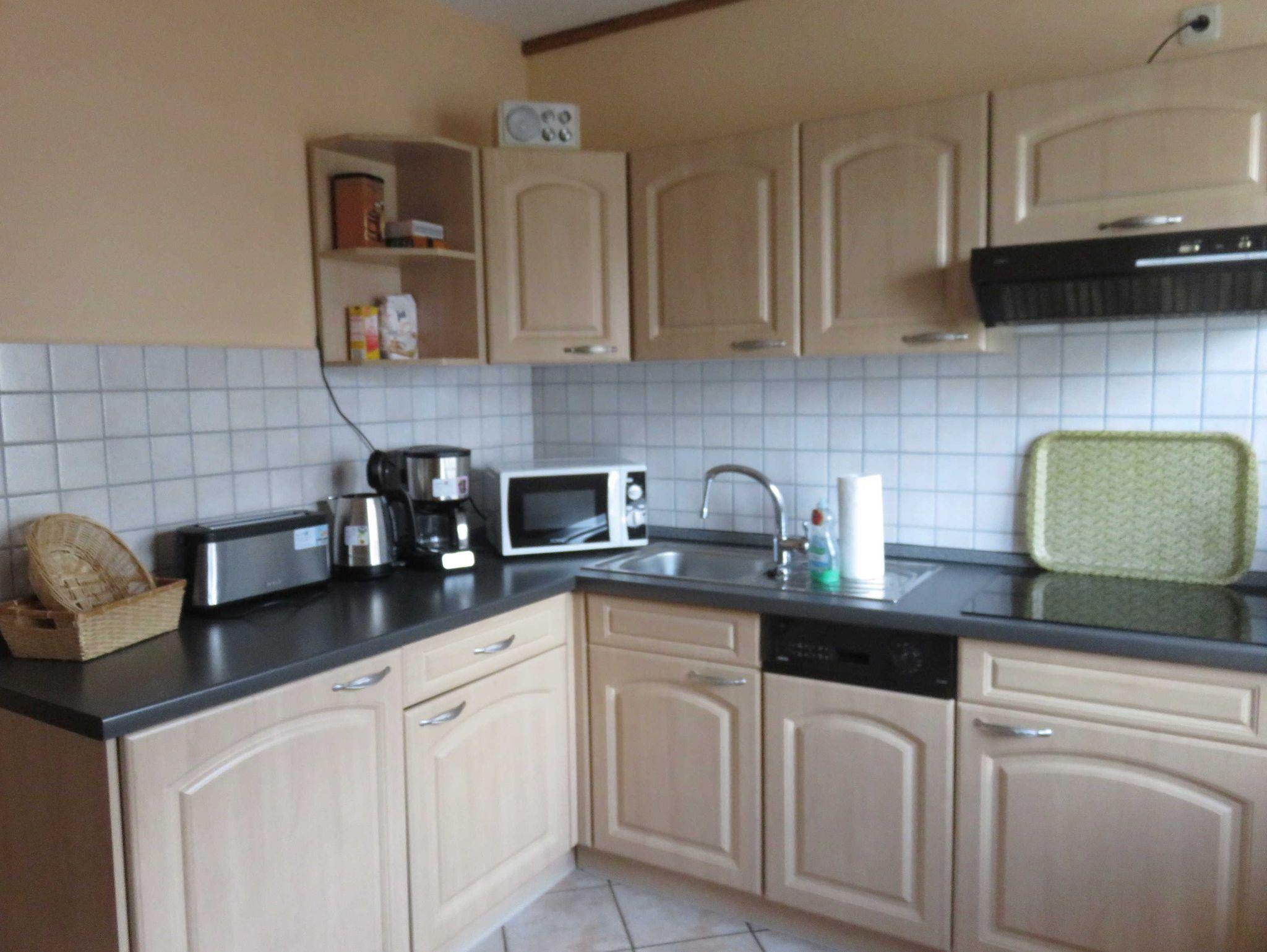 * komplett eingerichtete Küche mit 4-Herdplatten, Geschirrspüler, Kaffeemaschine, Wasserkocher, Toaster,