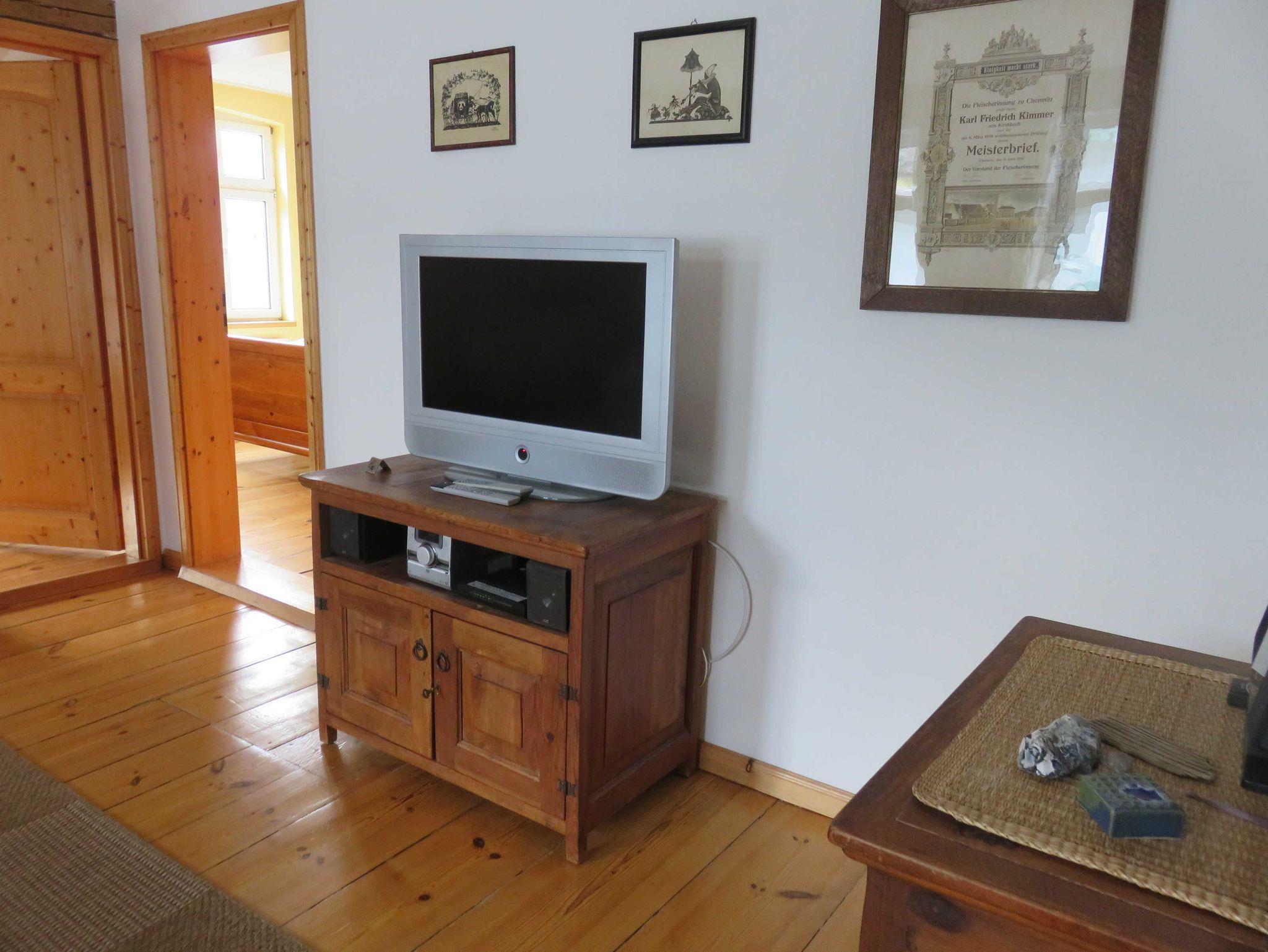 * Wohnzimmer mit Couch, Sessel, Tisch und TV