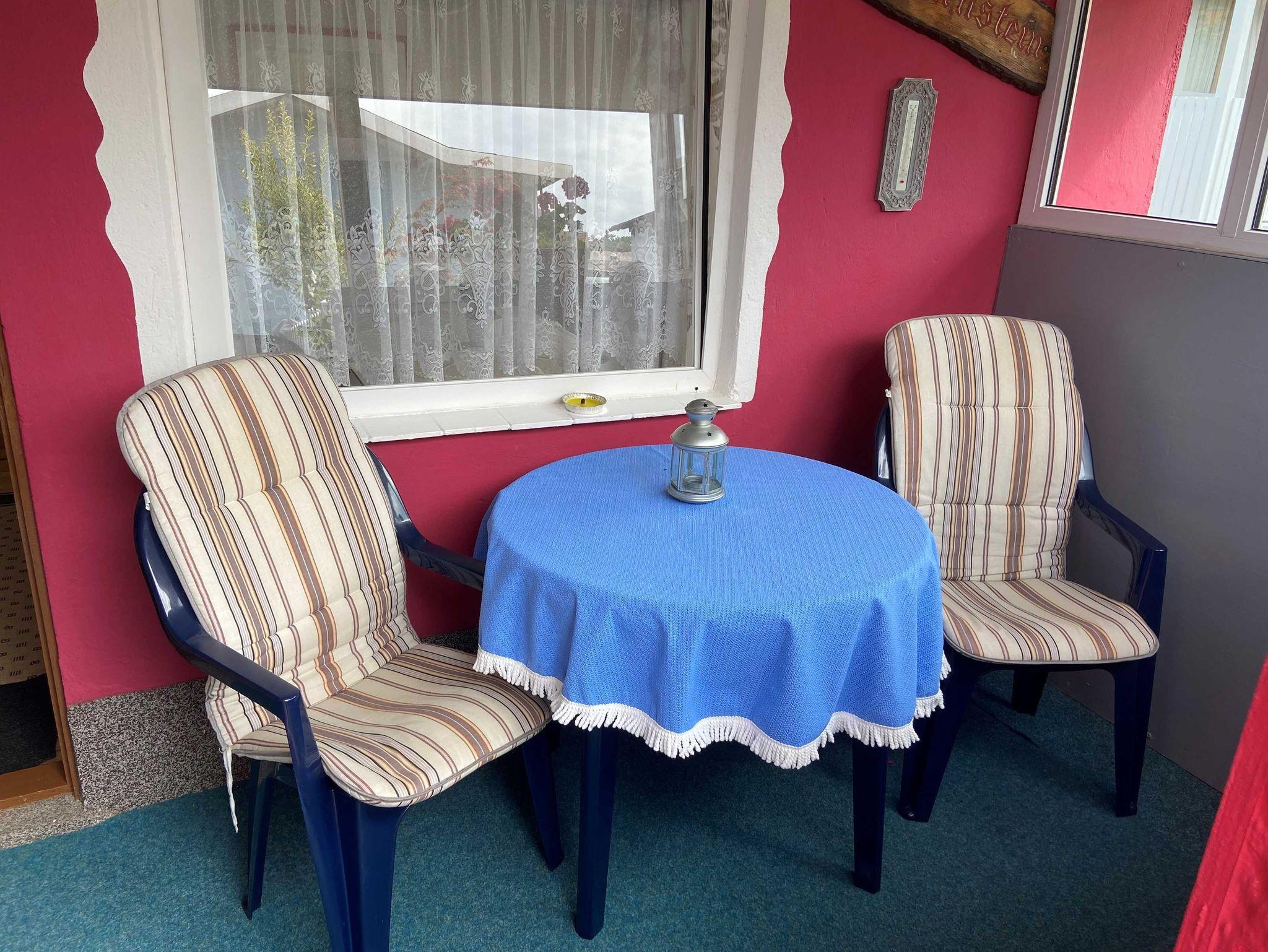 Vor dem Bungalow lädt eine überdachte Terrasse mit Gartenmöbeln zum Verweilen ein. Bettwäsche und Handtücher sind inklusive. PKW-Stellplatz ist vorhanden.