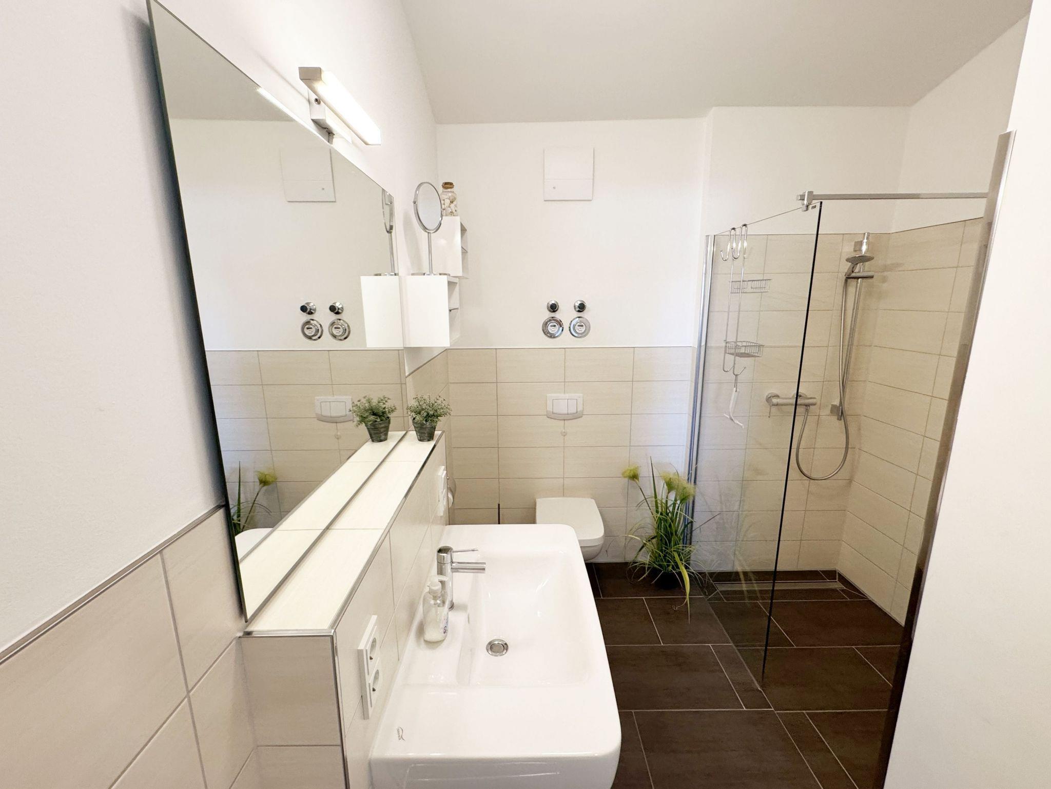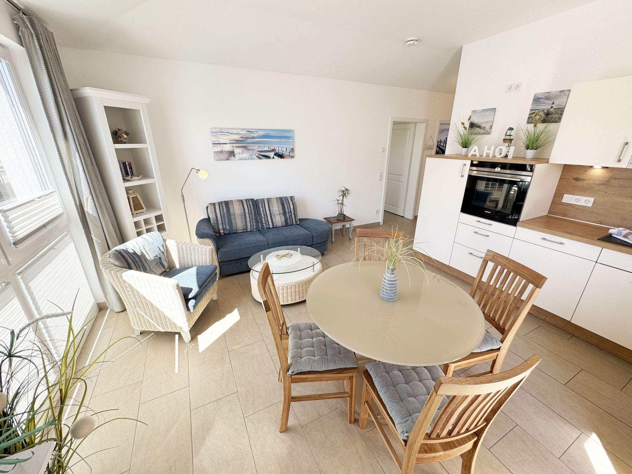 Die Wohnung Nr.08 in der Villa Anni ist eine moderne und stilvoll eingerichtete Nichtraucherwohnung in der 2.Etage. Sie bietet mit ihren ca. 54qm ausreichend Platz für max. 4 Personen. Der kombinierte Wohn- /Koch-und Essbereich mit einer modernen integrierten Küchenzeile lässt mit einem Induktionsfeld, einen Backofen mit Mikrowelle, einem Geschirrspüler, ein Kühlschrank mit Gefrierfach, einer Kaffeemaschine, einem Wasserkocher, einen Toaster, einen Eierkocher sowie diverse Küchenutensilien keine Wünsche offen. Ein runder Esstisch mit 4 Stühlen fügt sich der Küchenzeile an. Der übergehende Wohnbereich verfügt über eine gemütliche Couch mit Couchtisch, einem Sessel, einer Stehlampe mit flexibler Leseleuchte, ein Smart-TV mit einem Anschluss für Spielekonsolen und USB-Port und einen Blue-Ray Player. Ein WLAN-Anschluss komplettiert diesen Bereich für Sie, welcher inklusive ist. Eine kleine Auswahl an Gesellschaftsspielen und Urlaubslektüre steht Ihnen zusätzlich zur Verfügung. Über eine kleine Stufe vom Wohnbereich gelangen Sie auf den bestuhlten Balkon. Das erste Schlafzimmer verfügt über ein Doppelbett (1,80m x 2,00m, durchgehend), Nachttischablagen, einen Smart-TV, einem Kleiderschrank, eine Kommode, einen Wandspiegel sowie einem Herrendiener. Das zweite Schlafzimmer verfügt über ein Doppelbett (1,60m x 2,00m, Härtegrad 3, durchgehend) mit integrierten Nachttischlampen, verstellbare Lattenroste, einen Nachttisch, einen Smart-TV, eine Kommode sowie einen Herrendiener. Alle Räumlichkeiten wurden mit Plissee und Vorhängen ausgestattet. Das innenliegende Bad verfügt über eine ebenerdige und geräumige Dusche, einen Waschtisch mit Unterschrank, ein WC, einen Wandspiegel sowie einen Handtuchheizkörper. Die komplette Wohnung wurde mit einer Fußbodenheizung versehen und sorgt somit an kalten Tagen für eine angenehme Wärme. Ein Wäscheständer, ein Staubsauger und weitere Reinigungsutensilien stehen Ihnen zur Verfügung. Ihr PKW-Stellplatz (Nr.08) befindet sich in der Tiefgarage (Einfahrtshöhe 2,00m) des Hauses. Ihr Vierbeiner ist mit seinem eigenen Schlafplatz gegen eine Gebühr ein gern gesehener Gast. Die Erstausstattung eines Wäschepaketes (komplette Bettwäsche, 1 Duschhandtuch, 2 kleine Handtücher) können Sie bis 14 Tage vor Anreise gegen einen Aufpreis dazu buchen oder durch eigene ergänzen. Ab 2 gebuchten Paketen erhalten Sie einmalig 1 Geschirrhandtuch und 1 Duschvorleger dazu.