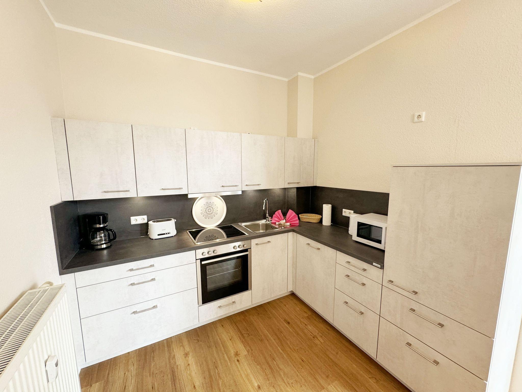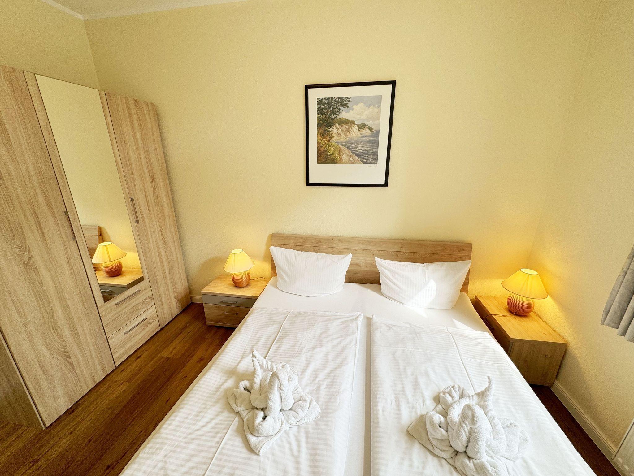 Die komfortable, ca. 44 m² große Nichtraucherwohnung befindet sich im Erdgeschoss der Villa Störtebeker und ist für max. 2 Erwachsene + 1 Kleinkind im Kinderreisebett bis 3 Jahre ausgelegt. Zu der Wohnung gehört eine bestuhlte Terrasse (Südost) in ruhiger Lage, mit Blick auf den Innenhof der Villa Störtebeker. Im Wohnbereich der Wohnung erwartet Sie eine gemütliche Couch mit Couchtisch, einer Leselampe, eine Bücherecke mit kleiner Auswahl sowie Gesellschaftsspielen in einem Sideboard. Ein LCD-TV, Blu Ray-Player und eine Mini-Stereo-Anlage mit CD und USB - Anschluss sorgen für Ihre Unterhaltungsmöglichkeiten. Ein WLAN-Anschluss zur freien Nutzung ist ebenfalls für Sie vorhanden. Angrenzend zum offenen Wohnbereich befinden sich die Küchenzeile mit Ceranfeld, Backofen, Mikrowelle, Geschirrspüler, Kühlschrank mit Eisfach, Kaffeemaschine, Wasserkocher, Toaster und weitere diverse Küchenutensilien. Ein Essplatz in der hellen und vollverglasten Veranda komplettiert diese. Das Schlafzimmer bietet Ihnen mit einem Doppelbett (1,80m x 2,00m), Nachtischablagen und geräumigem Kleiderschrank einen angenehmen Schlaf. Das geflieste Bad ist mit einer Dusche, Waschplatz, WC, Wäscheständer und Fön ausgestattet. Alle Räumlichkeiten lassen sich durch Vorhänge verdunkeln. Der Wohn- & Schlafbereich ist zusätzlich mit Insektenschutz versehen. Direkt auf dem Grundstück des Hauses befindet sich Ihr PKW-Stellplatz (Nr. 2). Im Keller des Hauses können Sie eine Waschmaschine sowie ein Trockner gegen Gebühr nutzen. Ihre mitgebrachten oder geliehenen Fahrräder können Sie im verschließbaren Fahrradschuppen unterbringen. 1 Haustier ist mit seinem eigenen Schlafplatz gegen eine Gebühr ein gern gesehener Gast. Die Erstausstattung eines Wäschepaketes (komplette Bettwäsche, 1 Duschhandtuch, 2 kleine Handtücher) können Sie bis 14 Tage vor Anreise gegen einen Aufpreis dazu buchen oder durch eigene ergänzen. Ab 2 gebuchten Paketen erhalten Sie einmalig 1 Geschirrhandtuch und 1 Duschvorleger hinzu.