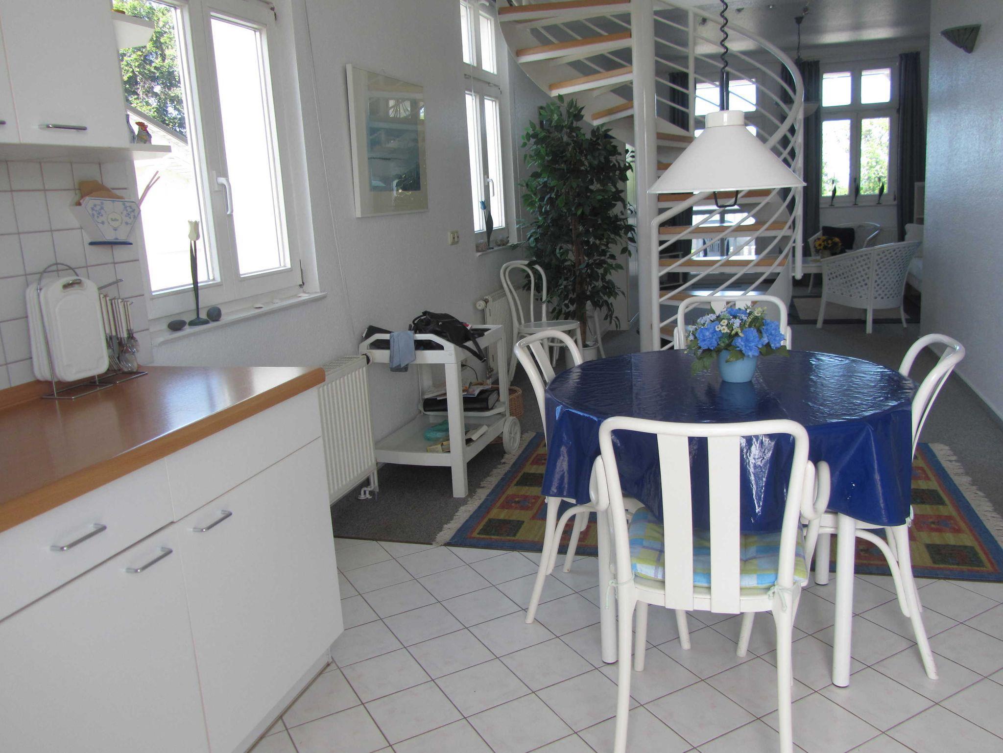Auf der gleichen Ebene, durch die Wendeltreppe getrennt, befinden sich die Küche mit dem Essbereich, das Bad mit Dusche und WC sowie der Flur mit der Garderobe.