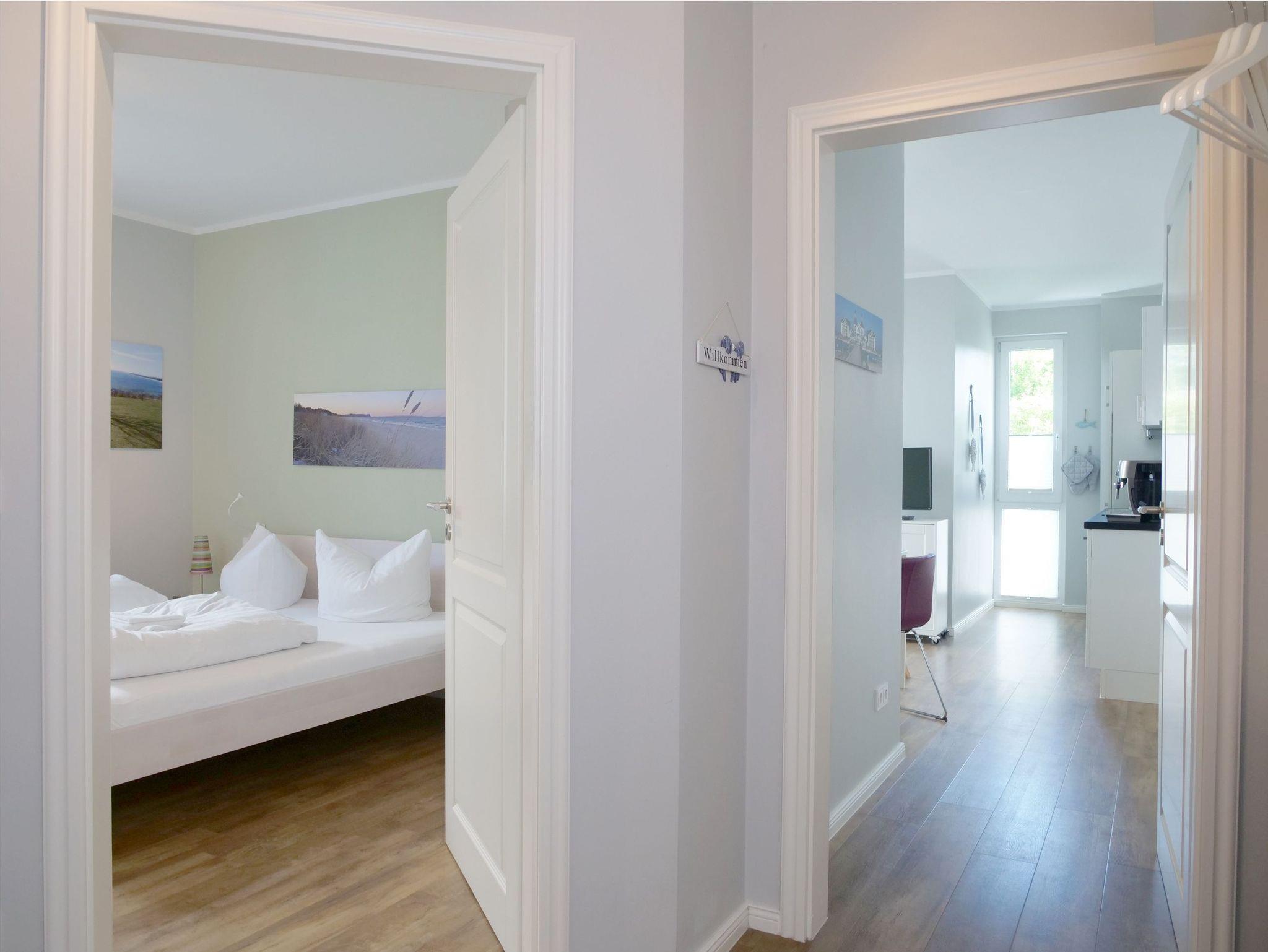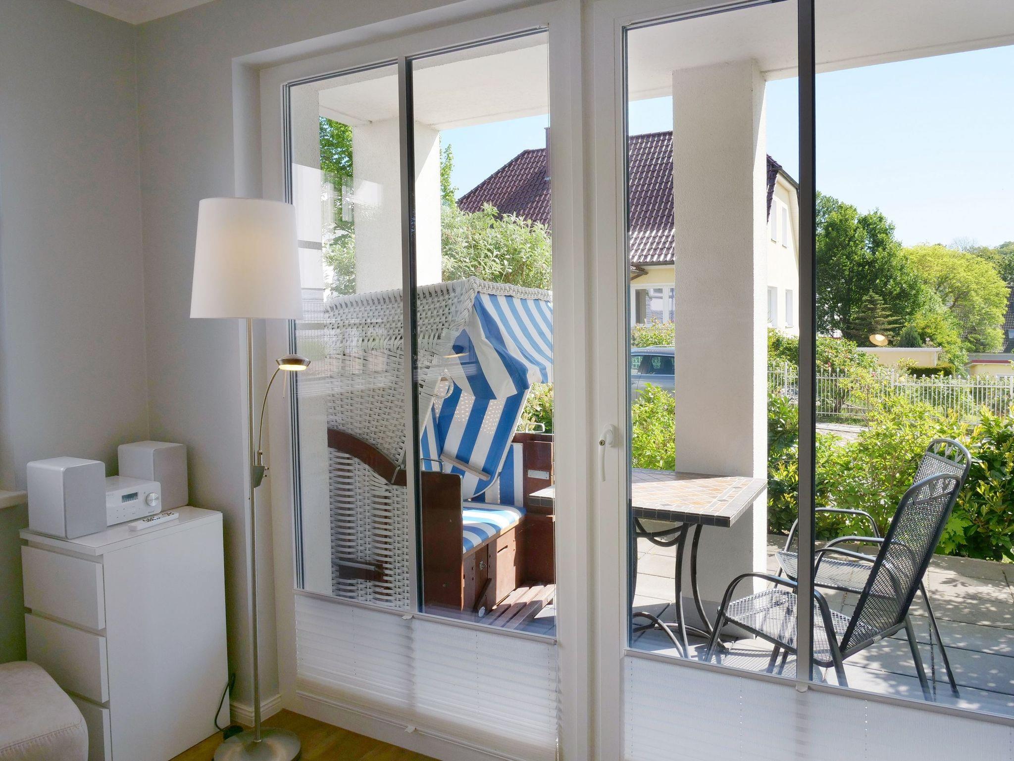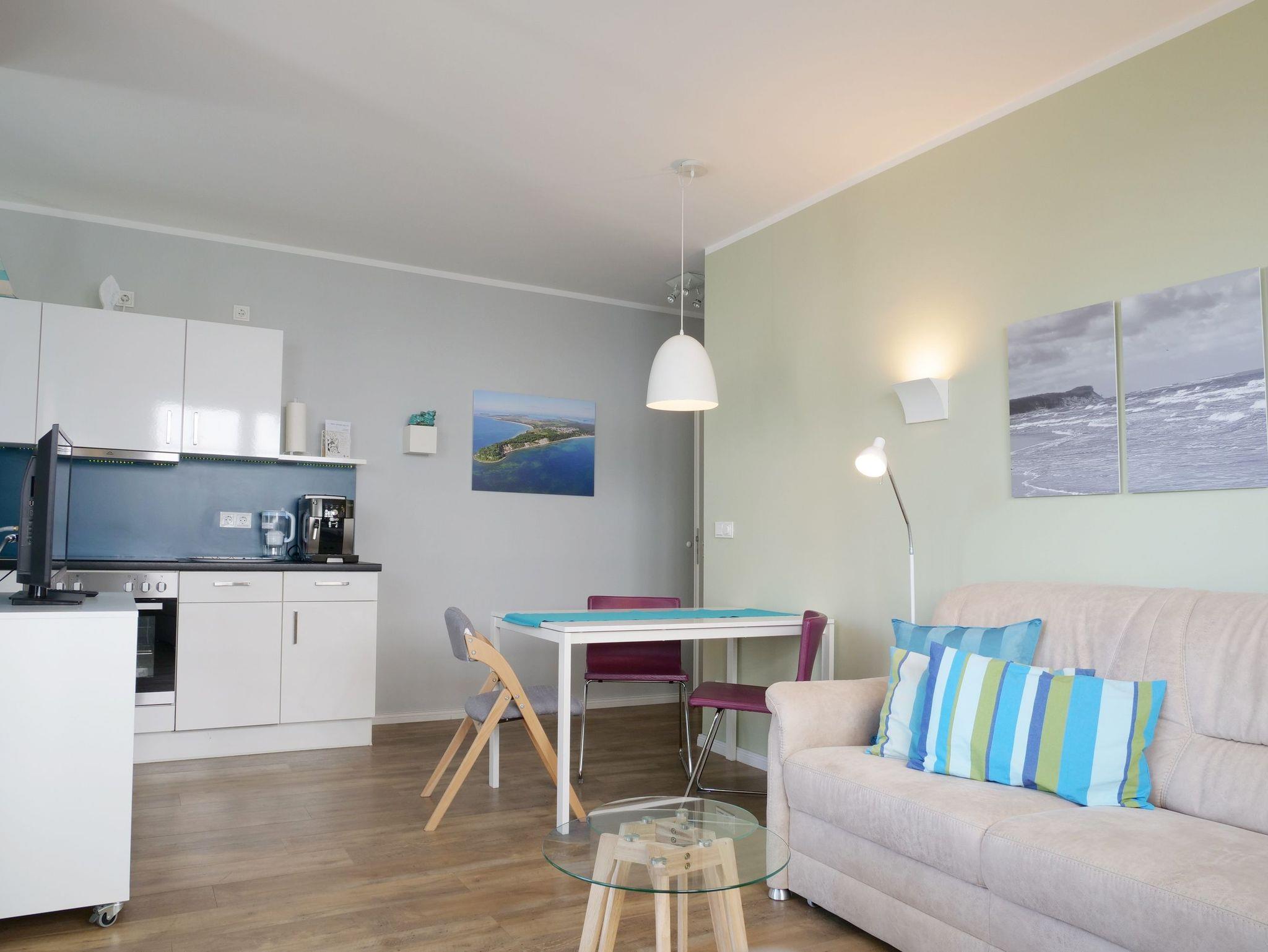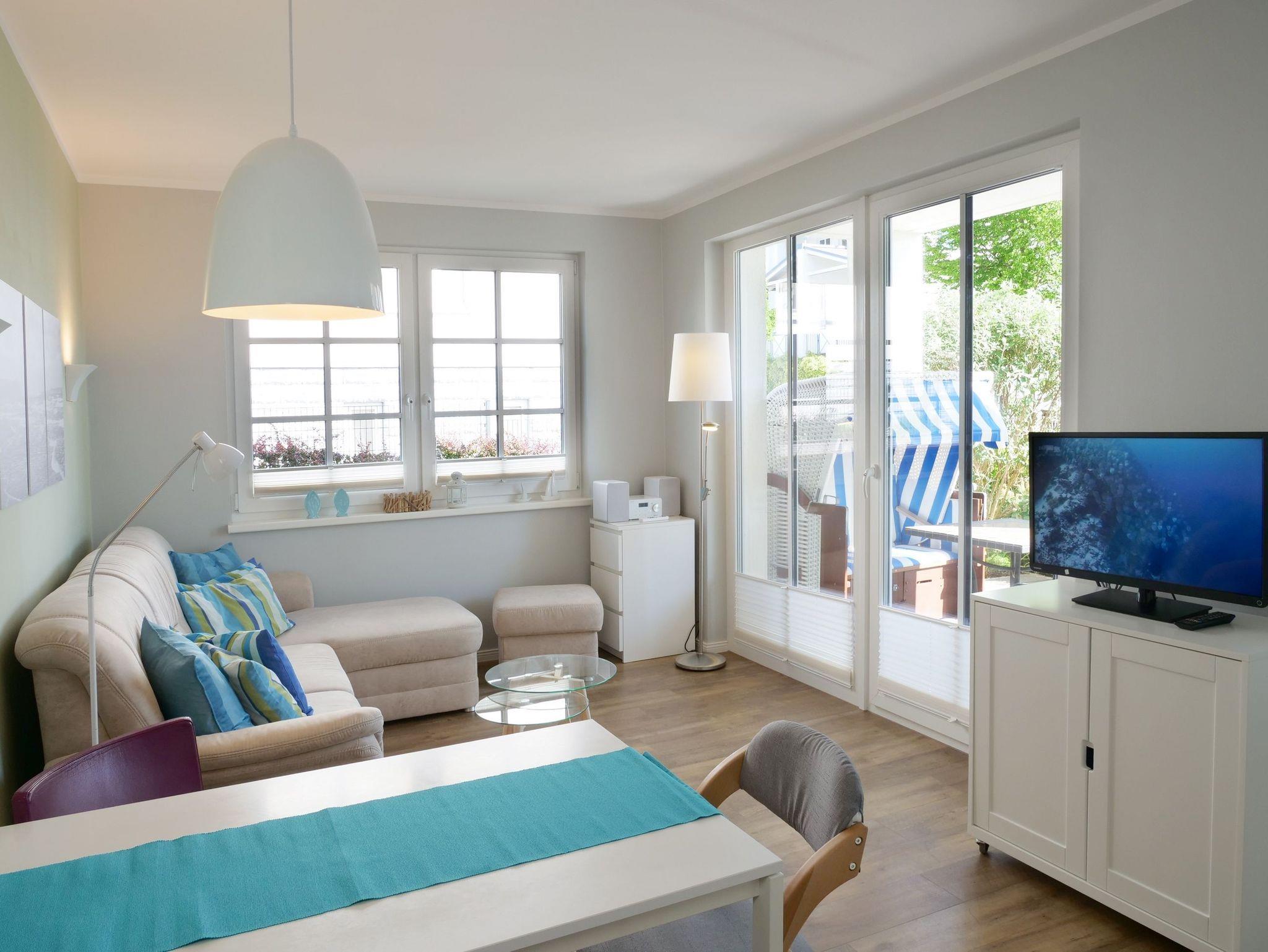 Diese sehr liebevoll und hochwertig eingerichtete 2-Raum-Ferienwohnung befindet sich im Erdgeschoss und verfügt über ca. 50 m² Wohnfläche. Die Nichtraucherwohnung ist ideal für max. 2 - 3 Personen geeignet. Auf der teilweise überdachten Terrasse (Ost) mit einem eigenen Strandkorb kann der Tag mit einem guten Frühstück in der Morgensonne beginnen. Die moderne und gemütliche Einrichtung wird unterstrichen durch eine geschmackvolle Farbgestaltung und erzeugt mit individuellen Rügen-Bildern ein sofortiges Urlaubsfeeling. Schöne Möbel kombiniert mit ansprechender Deko und auch die technische Ausstattung lassen keine Wünsche offen. Im Wohnzimmer sorgen eine gemütliche Couch (Aufbettung 3. Person/ 1,20m x 2,00m), eine Leselampe, der Esstisch und die in den Wohnbereich harmonisch integrierte Küchenzeile für eine angenehme Wohnatmosphäre. In der modern ausgestatteten Einbauküche erwarten Sie ein 4-Zonen-Cerankochfeld mit Backofen, ein Kühlschrank mit 3*-Gefrierfach, ein Toaster, ein Wasserkocher, eine Geschirrspülmaschine, eine Kaffeemaschine mit Thermoskanne sowie ein Delongi Kaffeevollautomat und diverse Küchenutensilien. Im Wohn- sowie im Schlafzimmer stehen Ihnen moderne Flachbildschirm-TV-Geräte zur Verfügung. Ein PEAQ-Micro-Audio-System mit Radio, CD-Player, Speicherkarten/USB-Wiedergabe sowie Bluetooth-Kopplung, ein DVD-Player sowie die kostenfreie Nutzung von WLAN runden das Angebot ab. Im ansprechenden Schlafzimmer sind ein Doppelbett (1,80m x 2,00m), 2 Nachttischkonsolen, Insektenschutzgitter und ein Kleiderschrank vorhanden. Eine Fußbodenheizung sorgt für angenehme Temperaturen bei jeder Jahreszeit. Ein modernes und komfortabel ausgestattetes Bad mit ebenerdiger Dusche, WC, Waschtisch und Fön steht zur Verfügung. Über einen Fahrstuhl ist der zur Wohnung gehörende Tiefgaragenstellplatz Nr. 5 (Einfahrtshöhe 2,00m) im Untergeschoss zu erreichen. Dort befinden sich auch ein gemeinschaftlich genutzter Fahrradabstellraum und ein Waschraum mit Münzwaschmaschine und Münztrockner. Zur Erkundung der Umgebung stehen Ihnen zusätzlich 2 Fahrräder (1 Damen E-Bike und 1 Herren Trekking) zur Verfügung, was kein Vertragsbestandteil ist. Ein Haustier ist gegen eine Gebühr ein gern gesehener Gast. Die Erstausstattung eines Wäschepaketes (komplette Bettwäsche, 1 Duschhandtuch, 2 kleine Handtücher, 2 Geschirrhandtücher) können Sie bis 14 Tage vor Anreise gegen einen Aufpreis dazu buchen oder durch eigene ergänzen.