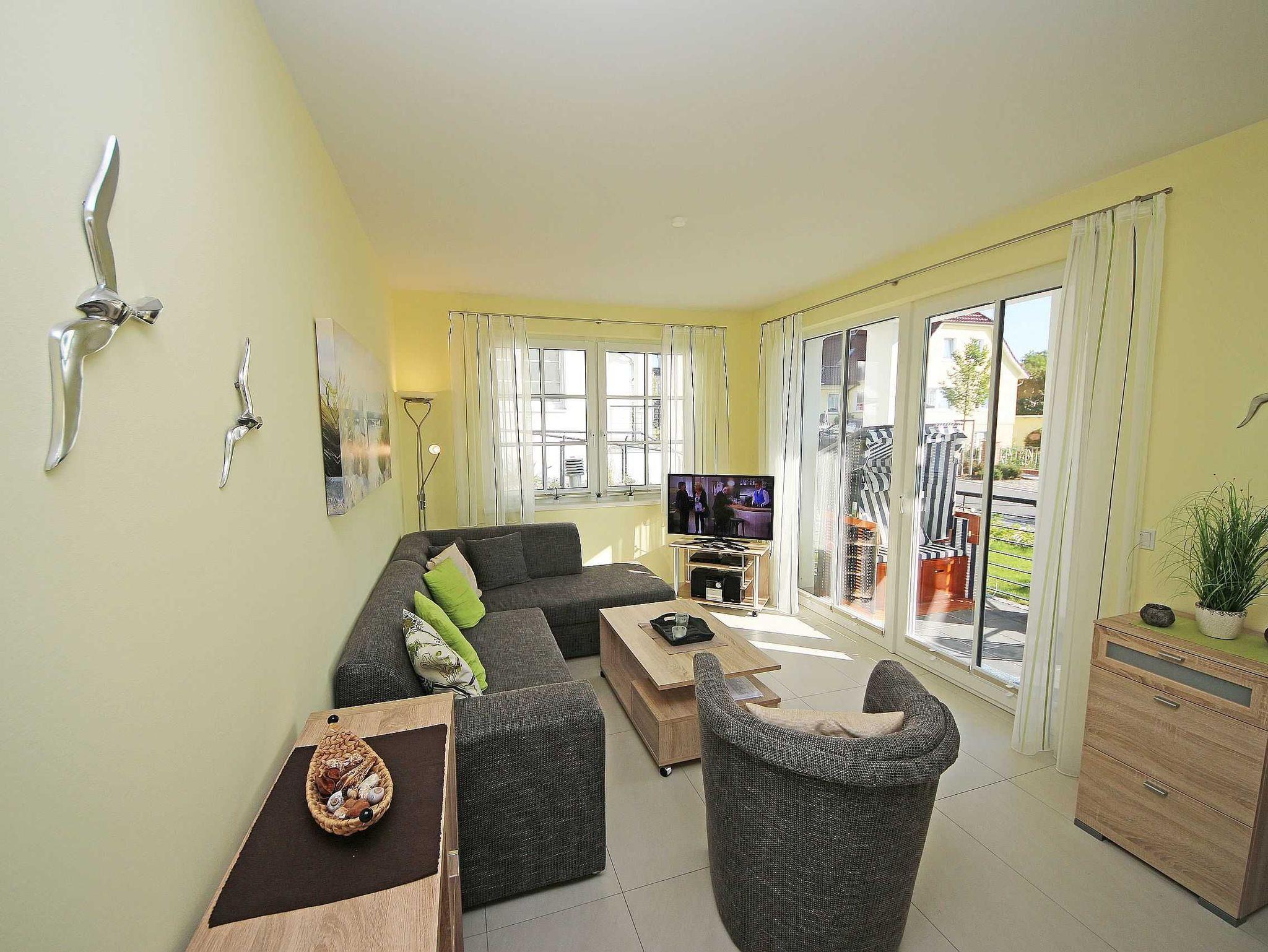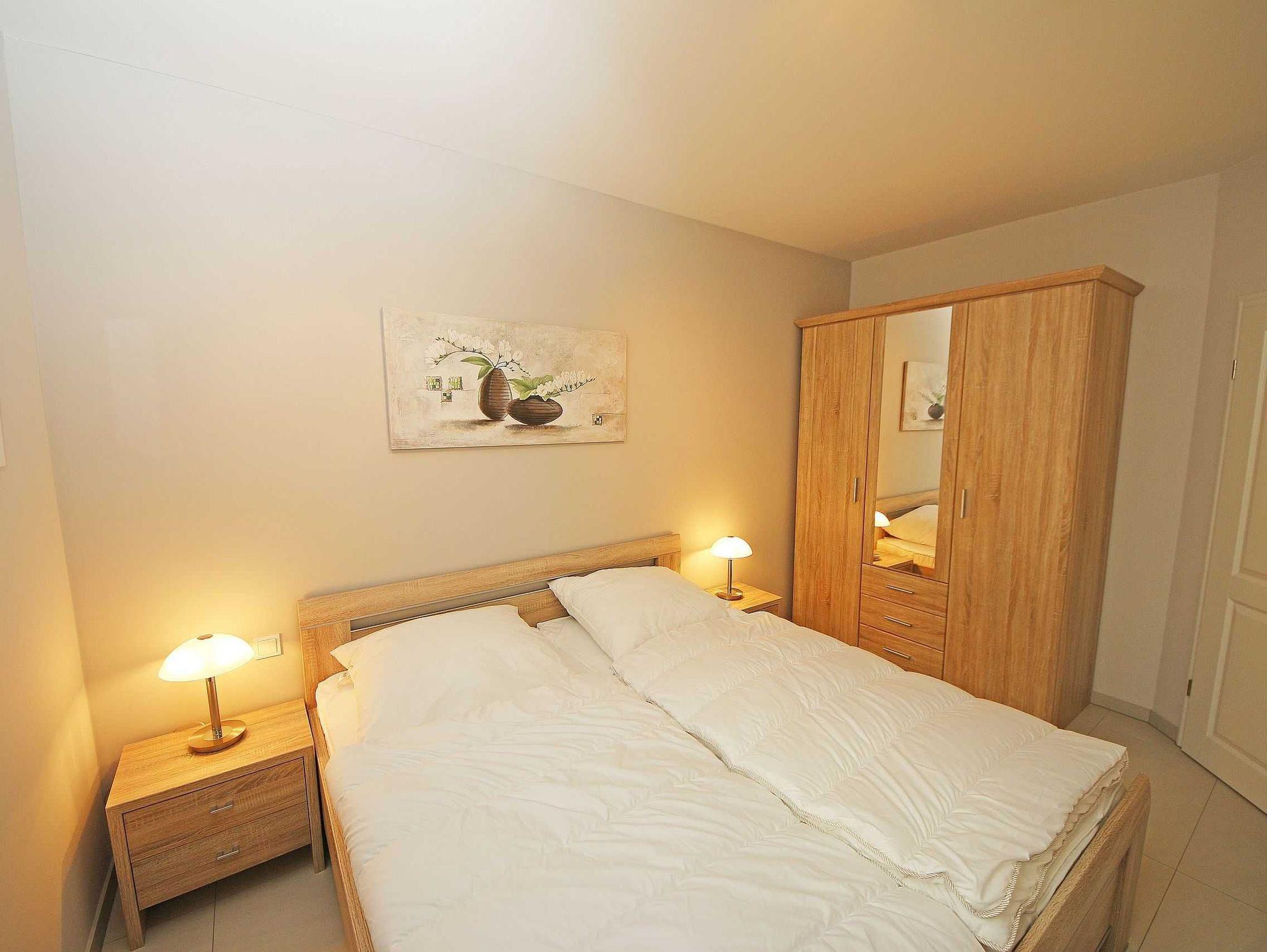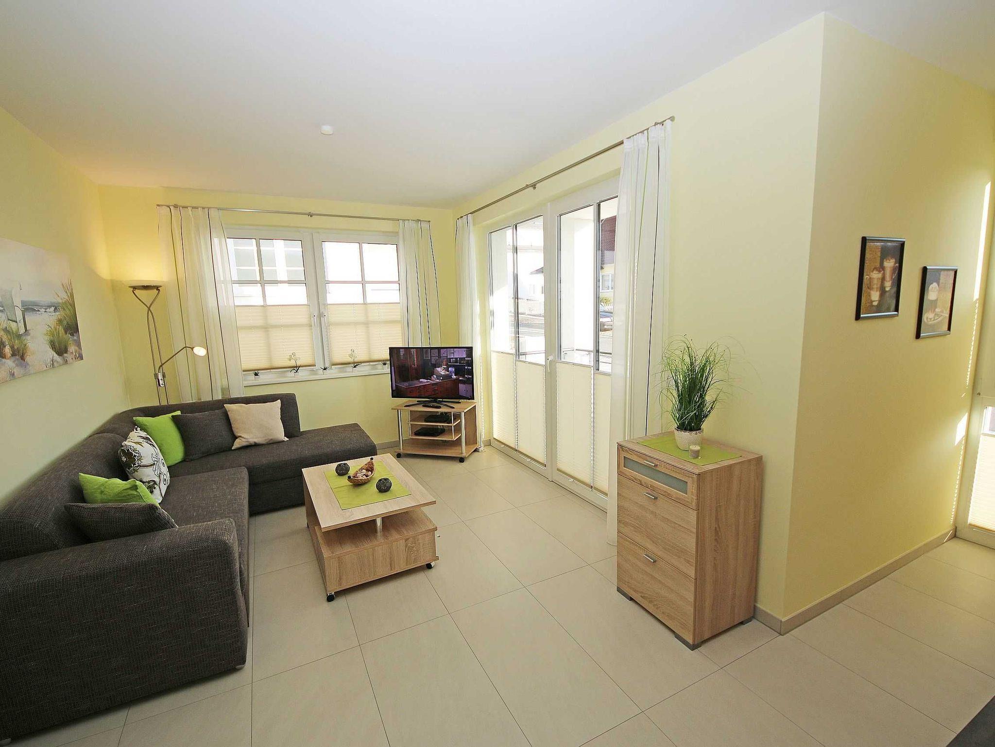 Die geschmackvoll eingerichtete 2-Raumferienwohnung (Nichtraucher) befindet sich im Erdgeschoss der Villa Antje. Durch die hellen, freundlichen Bodenfliesen und der in allen Räumen verlegte Fußbodenheizung ergibt sich eine angenehme Wohnatmosphäre. Der gemütliche Wohnbereich bietet für die 3. Person eine vollwertige Schlafcouch mit Ottomane (1,25m x 2,00m). Zusätzlich haben Sie einen Couchtisch, eine Leselampe sowie ein Smart-TV, Blu Ray Player und Mini-Stereo-Anlage. Das zweiflügelige Fenster im Wohnzimmer ist mit einem Insektenschutzgitter ausgestattet sowie das Fenster im Küchenbereich. Auch im Urlaub brauchen Sie in der Wohnung nicht auf einen Internetanschluss (WLAN) verzichten. Dieser ist für Sie inklusive! Die angrenzende Wohnküche mit Ceranfeld, Geschirrspüler, Kühlschrank mit Gefrierfach, Backofen, Wasserkocher, Kaffeemaschine, Toaster und diverse Küchenutensilien laden zum Kochen ein. Auf die überdachte Terrasse mit Süd-Ost-Ausrichtung, Möblierung und eigenem Strandkorb gelangen Sie durch den Wohnbereich. Das Schlafzimmer verfügt über ein Doppelbett (2 x 0,90 x 2,00m) mit Nachttischkonsolen, verstellbare Lattenroste, einen Kleiderschrank sowie Verdunklungsplissee. Im Schlafzimmer ist kein Platz für ein Kinderbett. Der komfortable Sanitärbereich wird durch einen ebenerdige Dusche, Handtuchheizkörper, Waschtisch, WC und Fön abgerundet. Das Schlafzimmer und das Duschbad verfügen jeweils über ein Insektenschutzgitter. Ein kleiner Abstellraum gehört zusätzlich zur Wohnung dazu. Über einen Fahrstuhl ist der zur Wohnung gehörende Tiefgaragenstellplatz (Nr. 3, Einfahrtshöhe 2,00m) im Untergeschoss zu erreichen. Ein allgemeiner Waschraum mit Waschmaschine und Trockner gegen Gebühr kann von allen Hausgästen genutzt werden sowie ein gemeinschaftlicher Fahrradabstellraum. Haustiere sind in der Wohnung nicht erlaubt. Die Erstausstattung von Bettwäsche ist pro Person inklusive. Ein Handtuchpaket ( 1 Duschhandtuch, 2 kleine Händehandtücher, sowie 2 Geschirrhandtücher) können Sie bis 14 Tage vor Anreise gegen einen Aufpreis dazu buchen bzw. durch Eigenmitnahme ergänzen.