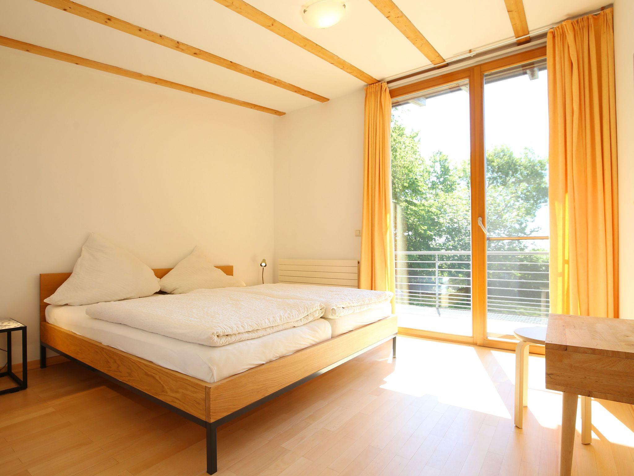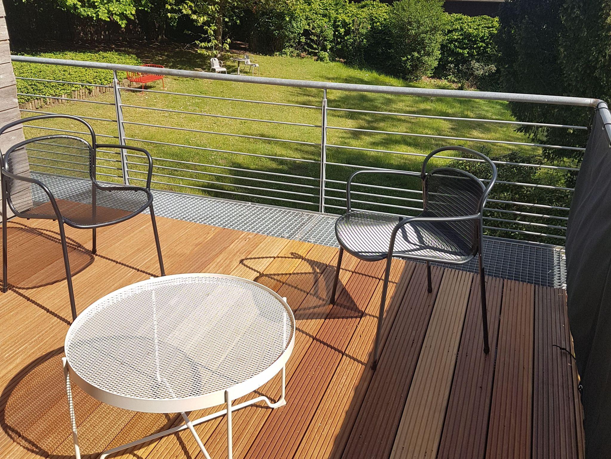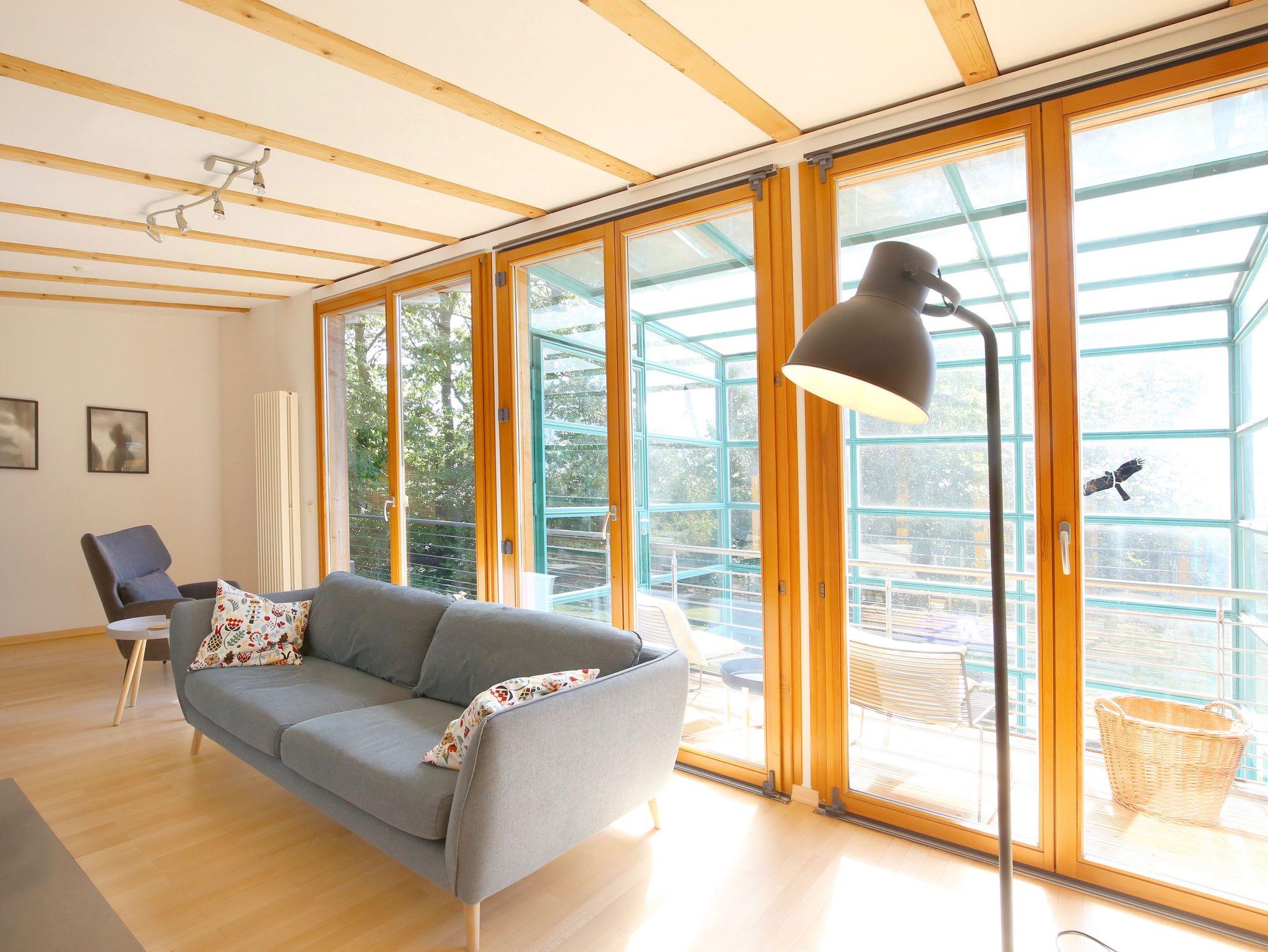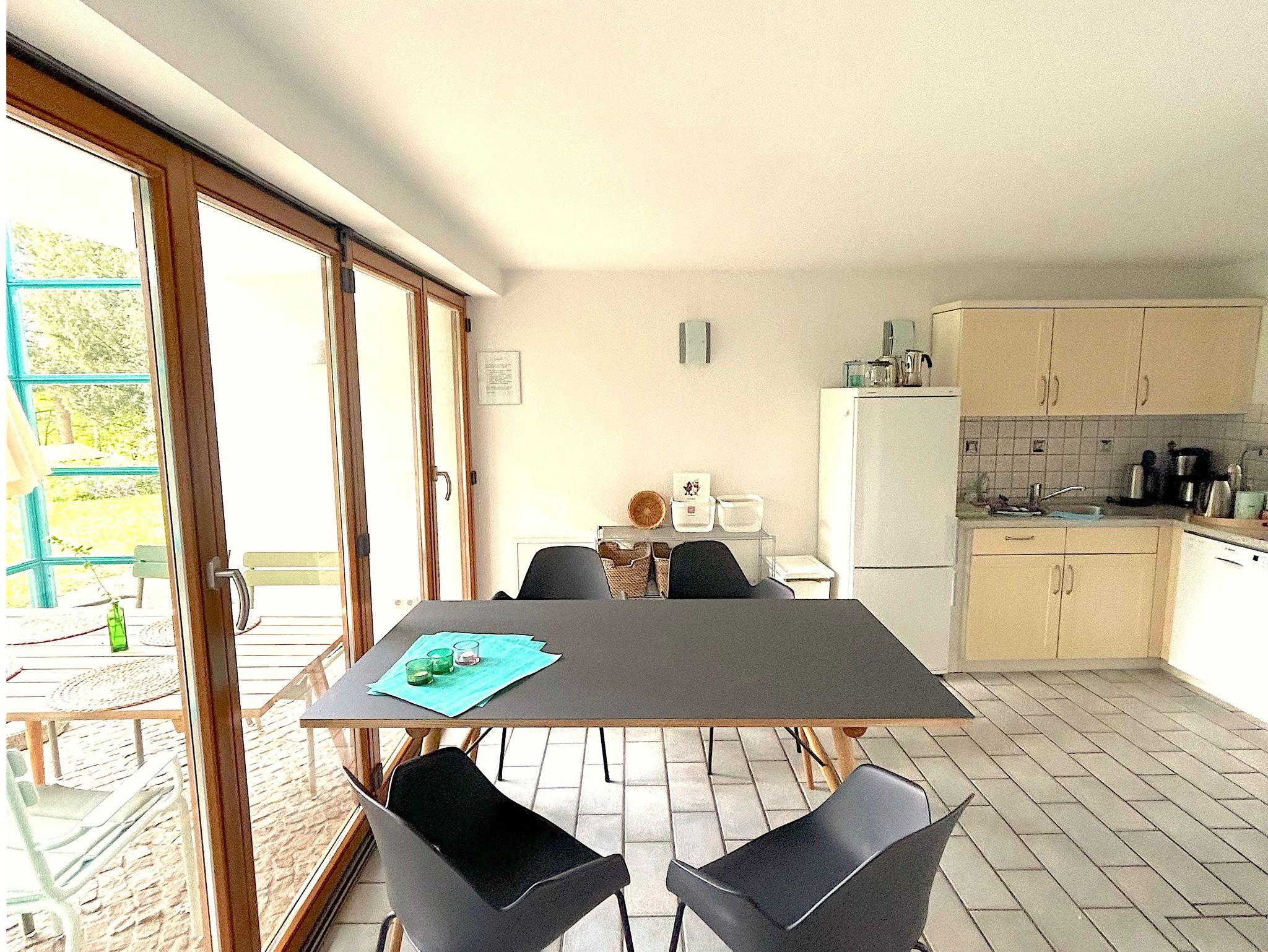 Im Erdgeschoß liegt die komplett eingerichtete Küche mit Geschirrspüler, Mikrowelle, Backofen und Kombikühlschrank sowie ein Gäste-WC. Hier befindet sich auch der Essbereich und weiterhin eine Sitzgelegenheit im Wintergarten, welcher durch die Glasschiebetüren betreten werden kann. Die Küche wird mit einer Fußbodenheizung beheizt. Von hier aus geht es hinaus auf die kleine Terrasse und die große Wiese davor. Sonnenliegen, Sonnenschirm, Grillmöglichkeit und PKW-Stellplatz sind vorhanden. Bettwäsche und Handtücher (exklusive Saunahandtücher) sind mit der Wohnung zu mieten.
