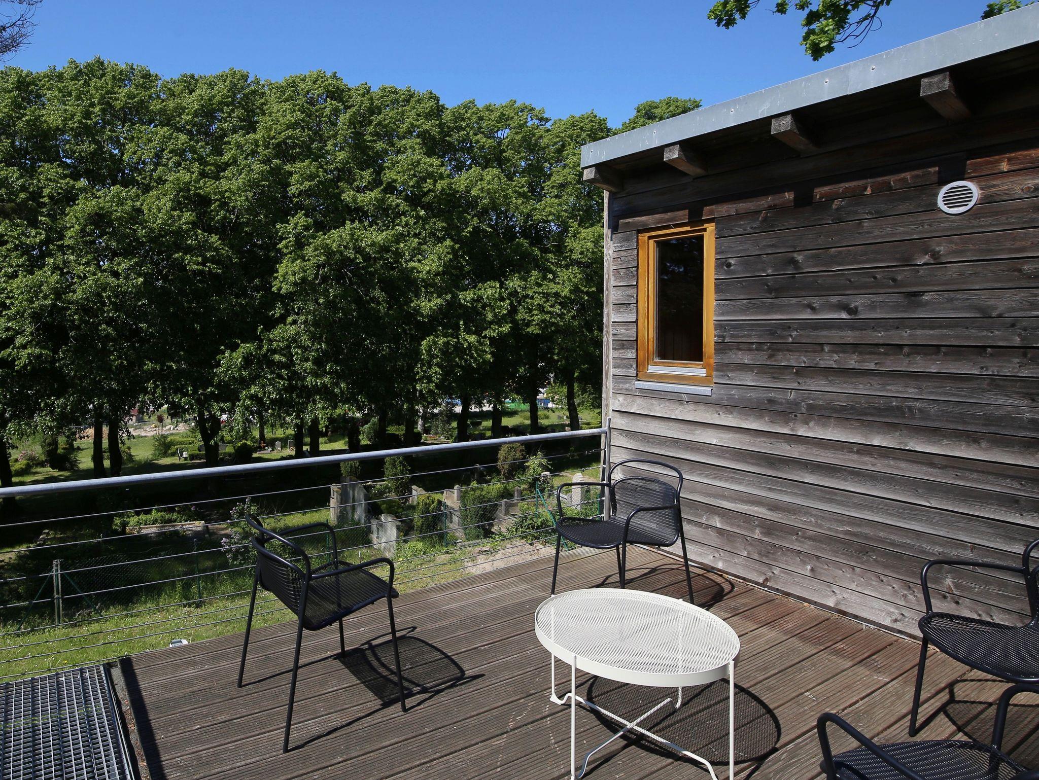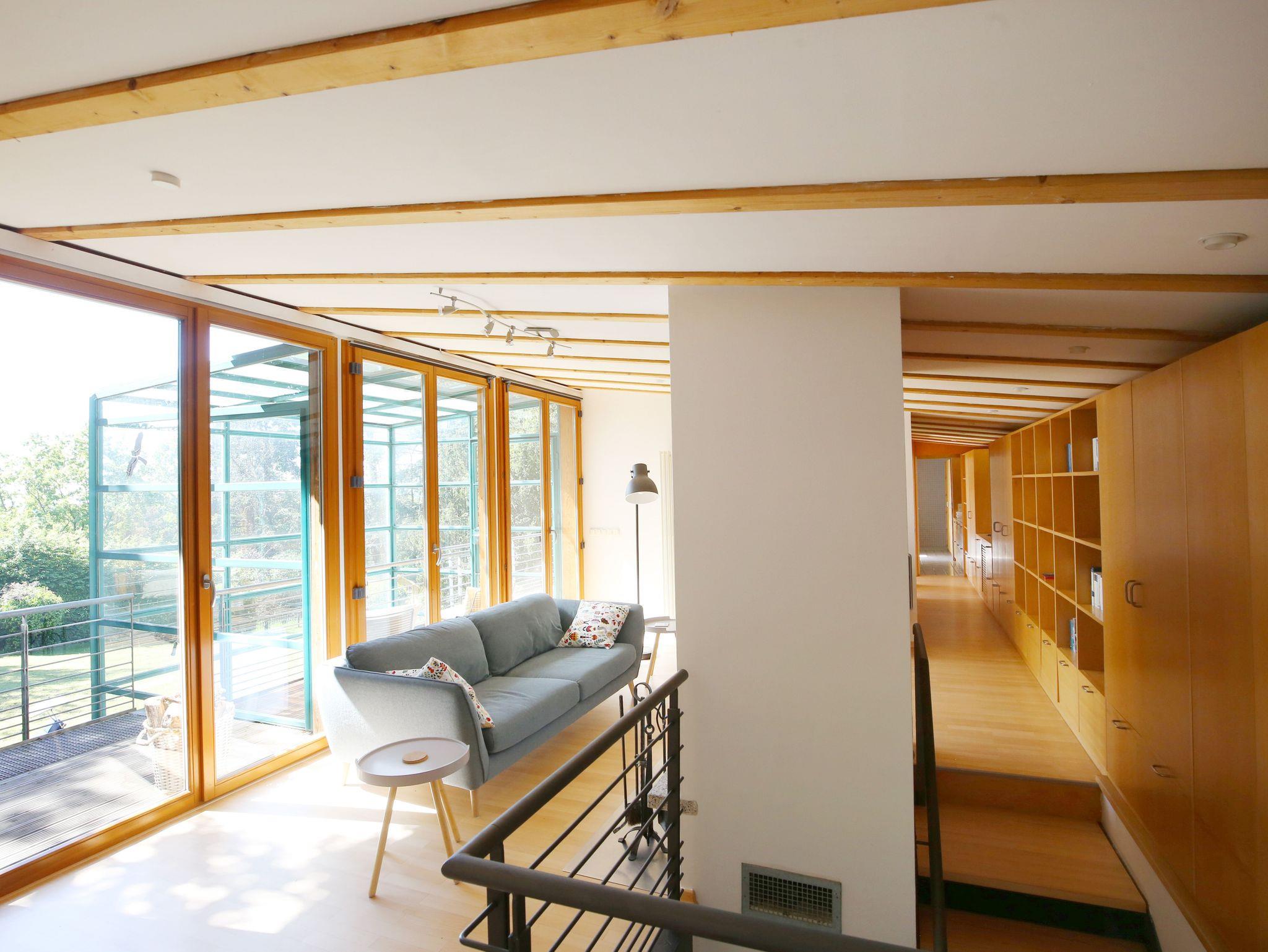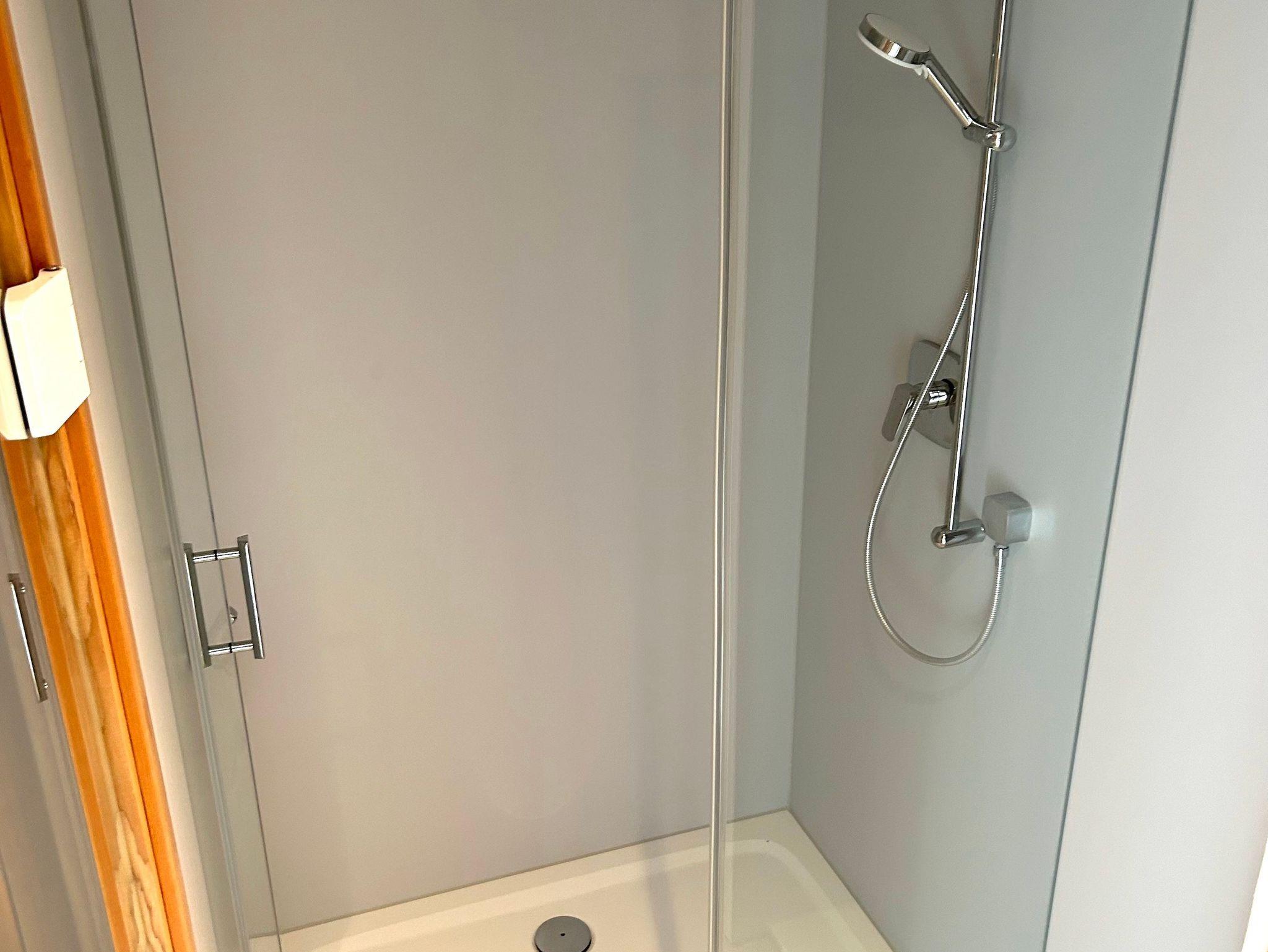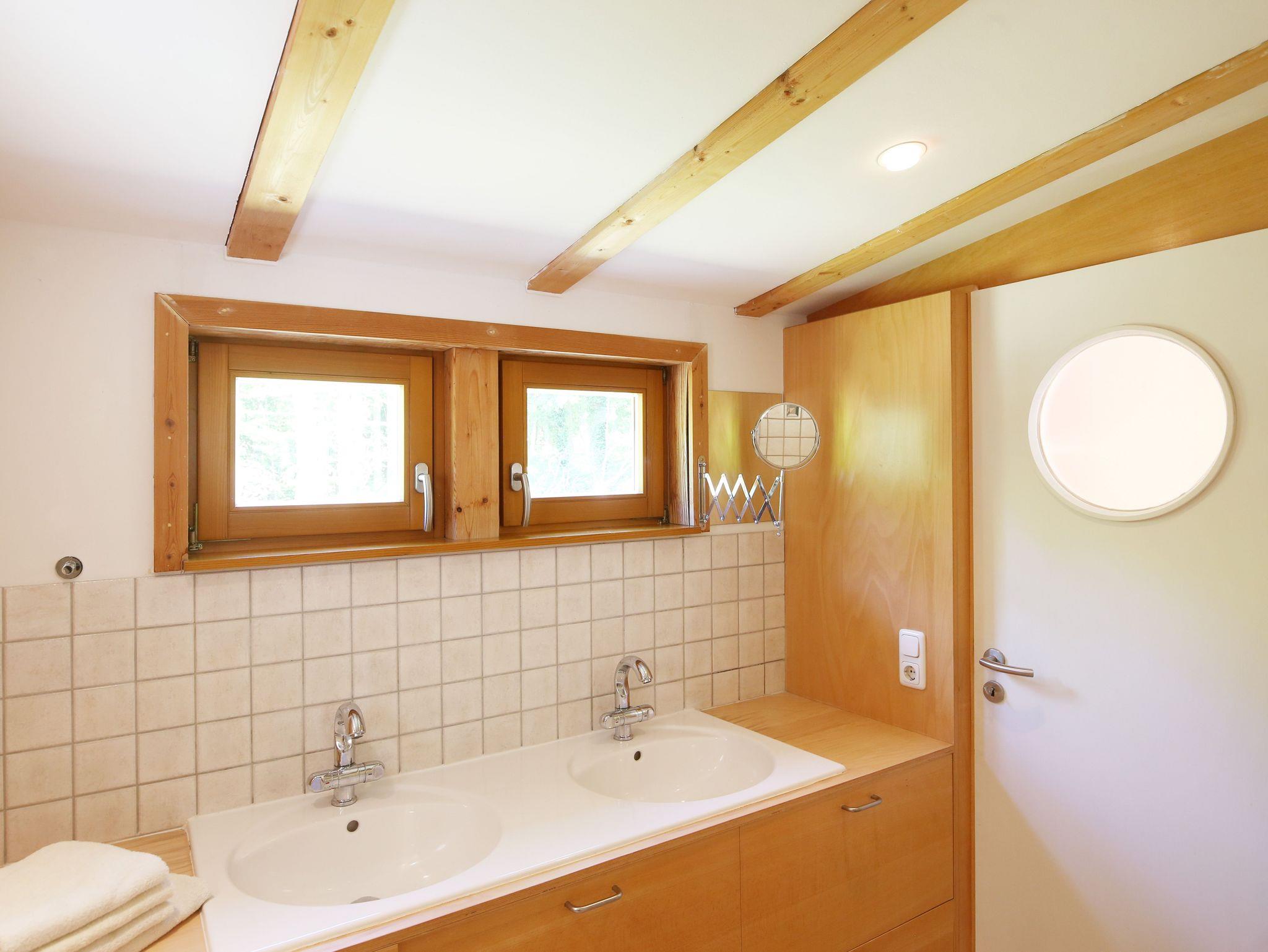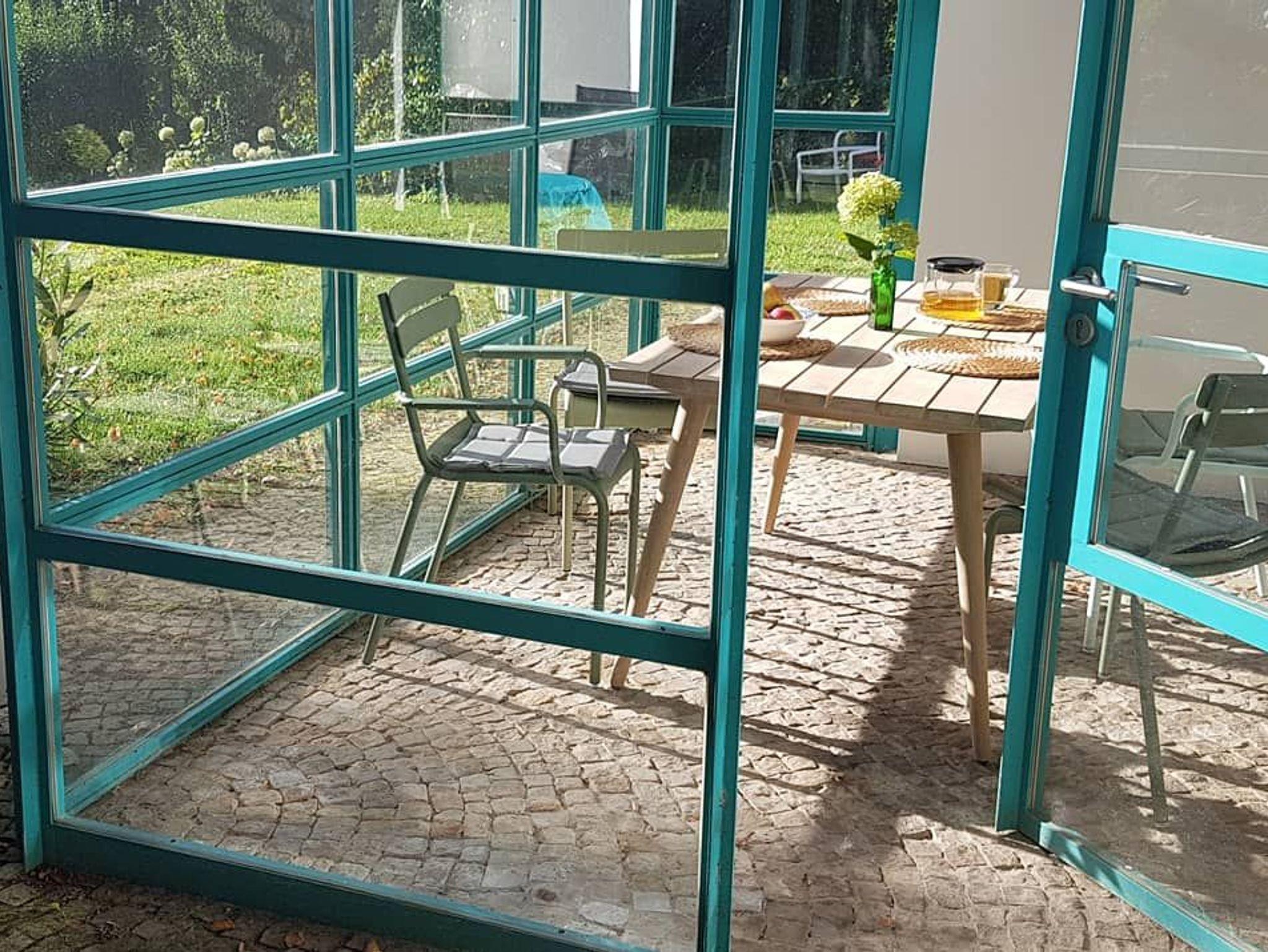 Im Erdgeschoß liegt die komplett eingerichtete Küche mit Geschirrspüler, Mikrowelle, Backofen und Kombikühlschrank sowie ein Gäste-WC. Hier befindet sich auch der Essbereich und weiterhin eine Sitzgelegenheit im Wintergarten, welcher durch die Glasschiebetüren betreten werden kann. Die Küche wird mit einer Fußbodenheizung beheizt. Von hier aus geht es hinaus auf die kleine Terrasse und die große Wiese davor. Sonnenliegen, Sonnenschirm, Grillmöglichkeit und PKW-Stellplatz sind vorhanden. Bettwäsche und Handtücher (exklusive Saunahandtücher) sind mit der Wohnung zu mieten.