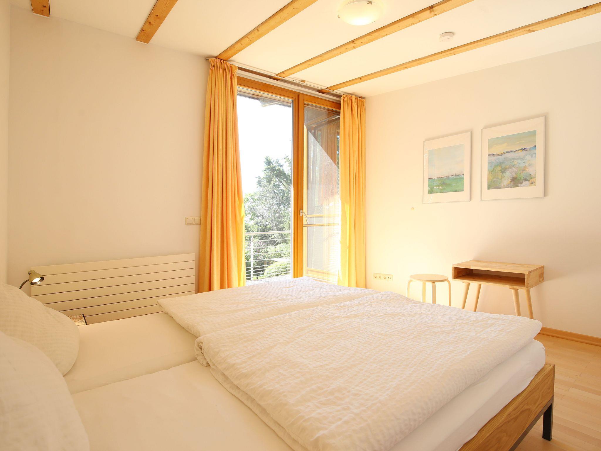 Die vier-Sterne Maisonette-Ferienwohnung ist ca. 120 qm groß und für maximal vier Personen ausgelegt. Die beiden Schlafräume, ausgestattet mit je einem Doppelbett (180cm Liegefläche), der große Wohnraum, möbliert mit Couch, Lesesessel, kleinem Schreibtisch sowie Fernseher, und ein Kamin befinden sich in der oberen Etage. Das Badezimmer im Obergeschoß besitzt eine Badewanne mit Sprudelfunktion, WC und Dusche. Außerdem ist eine separate Dusche direkt neben der Sauna vorhanden. Die Sauna kann gegen Aufpreis genutzt werden - Saunatücher sind bitte mitzubringen. Eine Außengalerie im Obergeschoß verläuft entlang der gesamten Hausfront, kann von allen Wohn-/Schlafräumen durch bodentiefe Glastüren betreten werden und bietet Fern-/Meerblick Richtung Südstrand. Der Wintergarten in der oberen Etage kann vom Wohnraum aus durch die Glasschiebetüren betreten werden. Außer im Spätherbst/Winter ist die Außengalerie auch mit Draußenmöbeln zum Sitzen und Entspannen versehen.