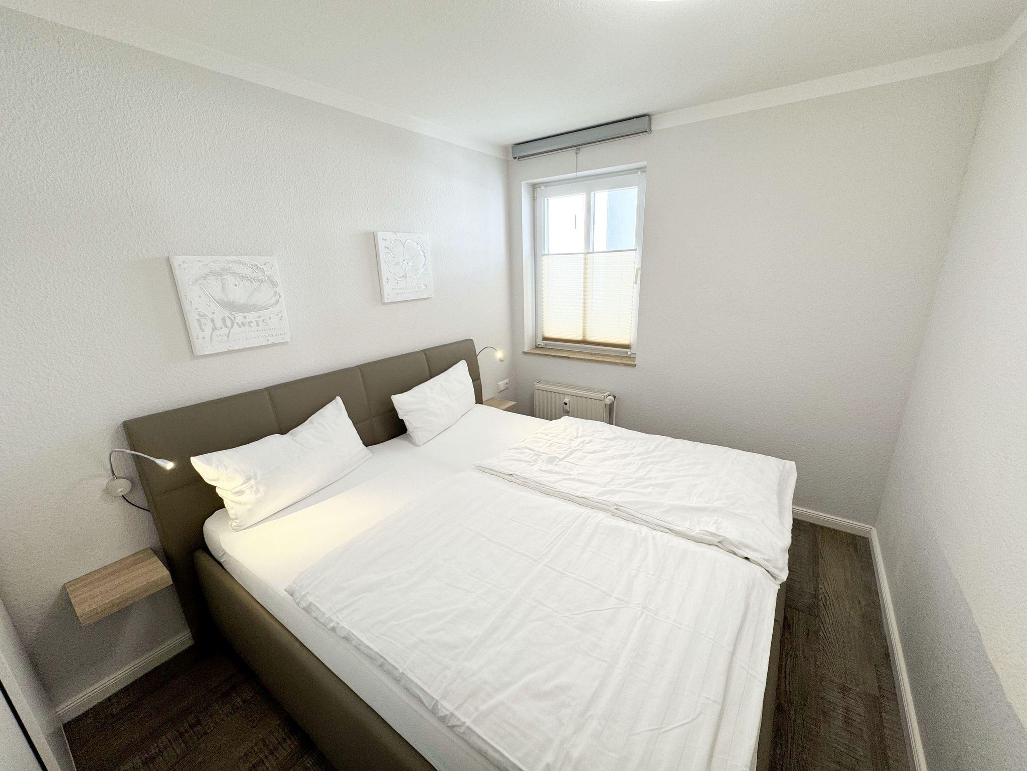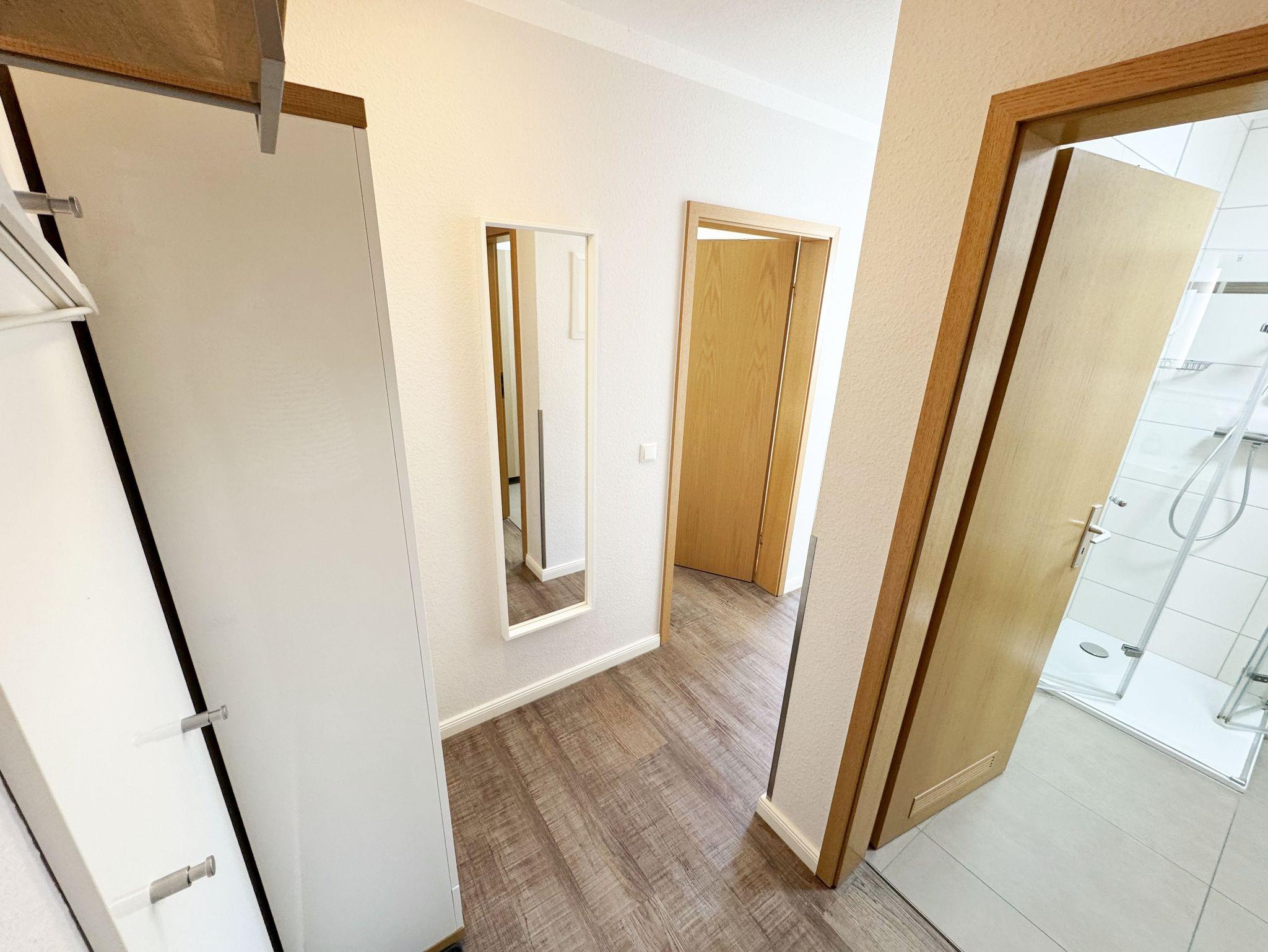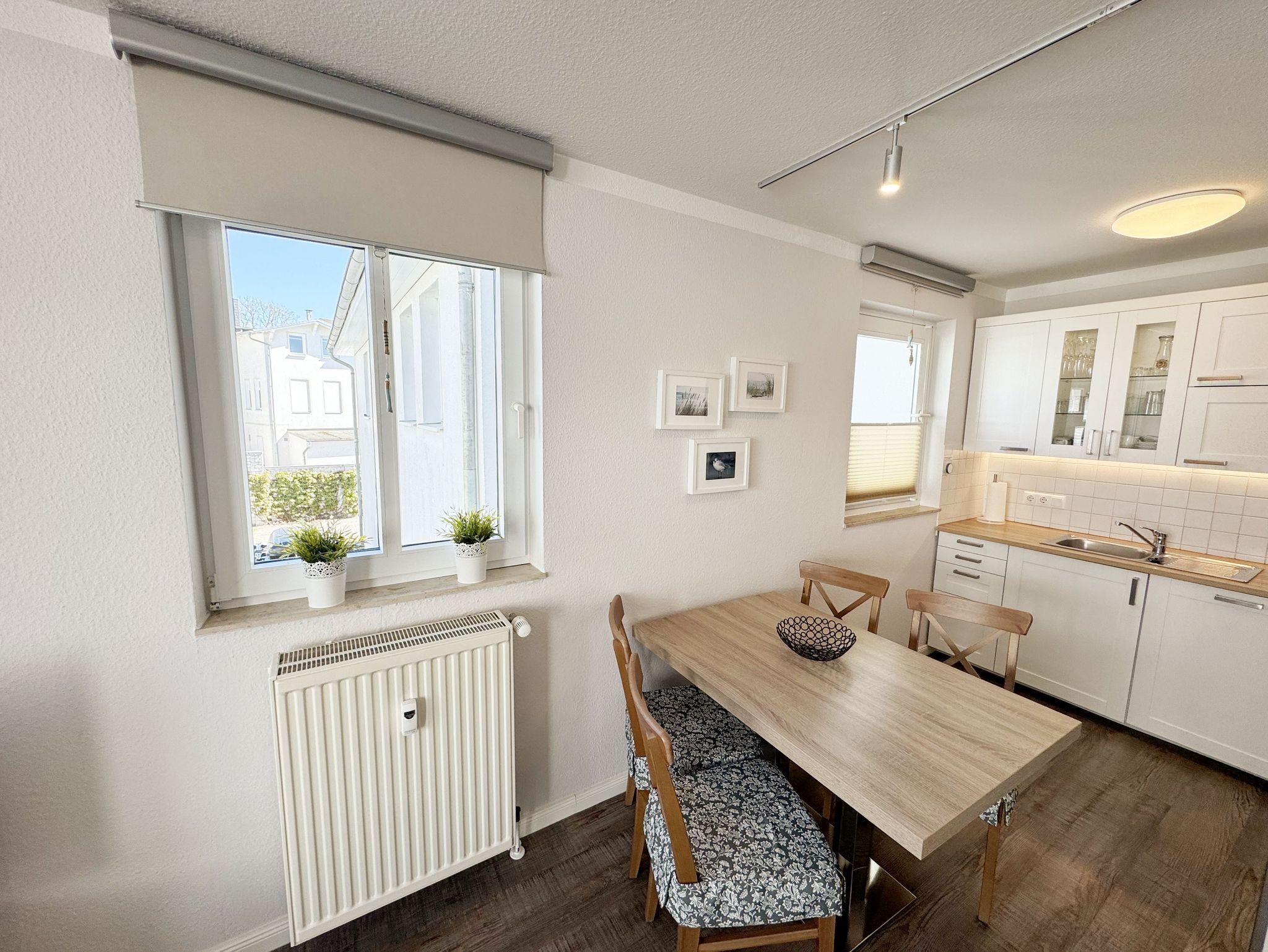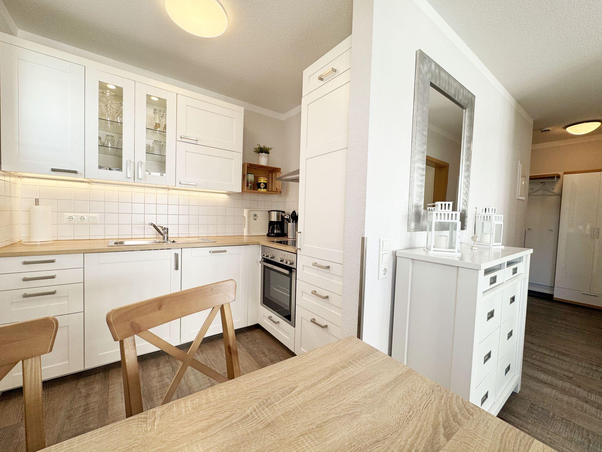 Die Nichtraucherferienwohnung mit ca. 42 qm befindet sich im 1. Obergeschoss der Villa Karola. Zu der Wohnung, die für 2 bis max. 4 Personen ausgelegt ist, gehört ein großer und bestuhlter Balkon mit Vormittagssonne den Sie durch den Wohnbereich erreichen können. Im Wohnbereich gibt es ein gemütliches Ledersofa mit Lattenrahmen und Burtexmatratze, das zu einem Doppelbett von 1,60m x 2,00m, für die 3. und 4. Person umgebaut werden kann. Ein Sessel und Tische sind ebenfalls vorhanden, die man als Beistelltische verwenden kann. Der Wohnraum wird durch einen Essplatz mit Tisch und 4 Stühlen, eine Leselampe sowie eine Anrichte komplettiert. Ein LCD-Smart TV und eine kleine Audiosystemanlage mit CD/DVD Player, USB-Anschluss, Bluetooth, Airplay und WLAN-Anschluss sorgen für Ihre Unterhaltung. Die offene Küche ist mit einer Küchenzeile mit Edelstahl Umluft Herd und Ceranfeld, Geschirrspüler, Mikrowelle, Kühlschrank mit Eisfach, Kaffeemaschine, Tassimo-Maschine, Wasserkocher, Toaster und diversen Küchenutensilien, die man zum alltäglichen Leben braucht ausgestattet. Im Schlafzimmer befindet sich ein Polsterbett aus Kunstleder mit Comfort-Taschenfederkernmatratzen in H2 und H3 mit einer Liegefläche von 1,80m x 2,00m und zwei kleinen Nachttischen und geräumigen Kleiderschrank. Für einen ruhigen Schlaf sorgen Verdunklungsvorhänge. In der Diele stehen die Garderobenschränke und eine separate Garderobe, in denen man ausreichend Stauraum zum Hängen und Legen findet. Das geflieste Badezimmer wird durch eine Dusche, Waschbecken, Fön, WC, einen großen LED beleuchteten Spiegel und einen weißen Hochglanzhängeschrank abgerundet. Die Wohnung verfügt über einen eigenen abschließbaren Fahrradkeller. Ein immer verfügbarer Parkplatz Nr. 10 ist für Sie in der Schulstrasse Nr. 03 reserviert und ist in knapp 3 Minuten leicht zu Fuß erreichbar. 1 Hund (keine Katzen) ist gegen eine Gebühr ein gern gesehener Gast. Die Erstausstattung eines Wäschepaketes (komplette Bettwäsche, 1 Duschhandtuch, 1 kleines Handtuch) können Sie bis 14 Tage vor Anreise gegen einen Aufpreis dazu buchen oder durch eigene ergänzen. Ab 2 gebuchten Paketen erhalten Sie einmalig 1 Geschirrhandtuch und 1 Duschvorleger hinzu.