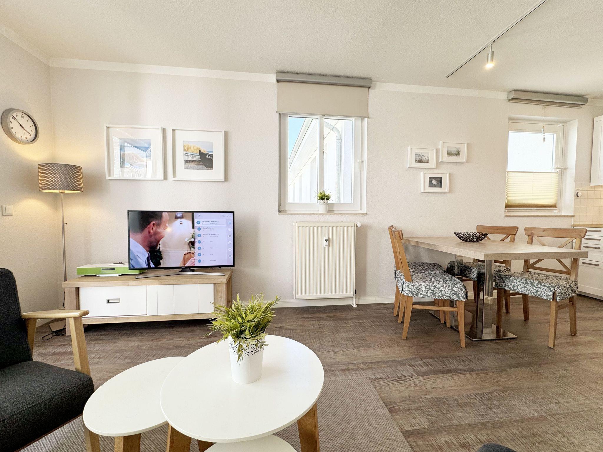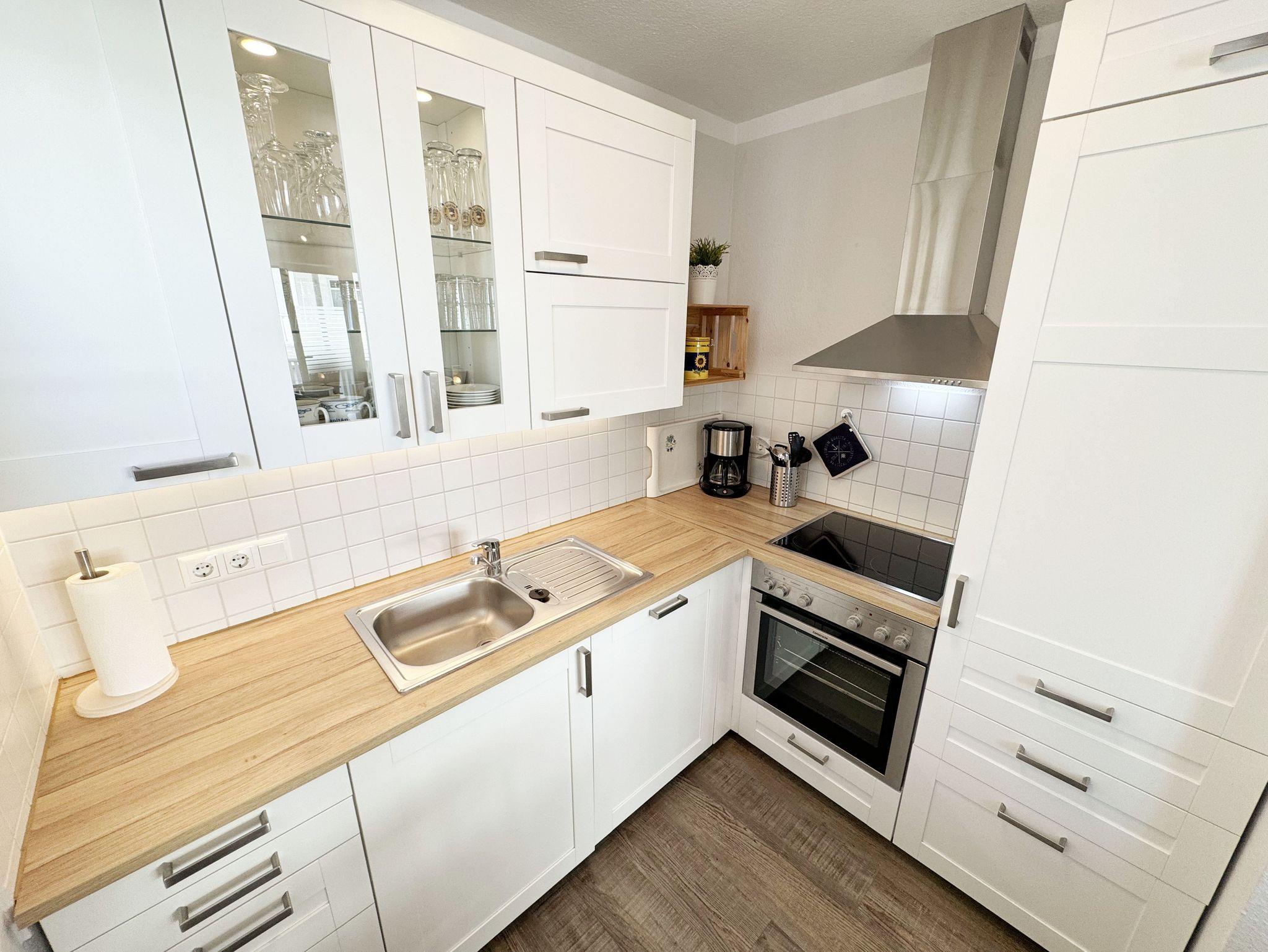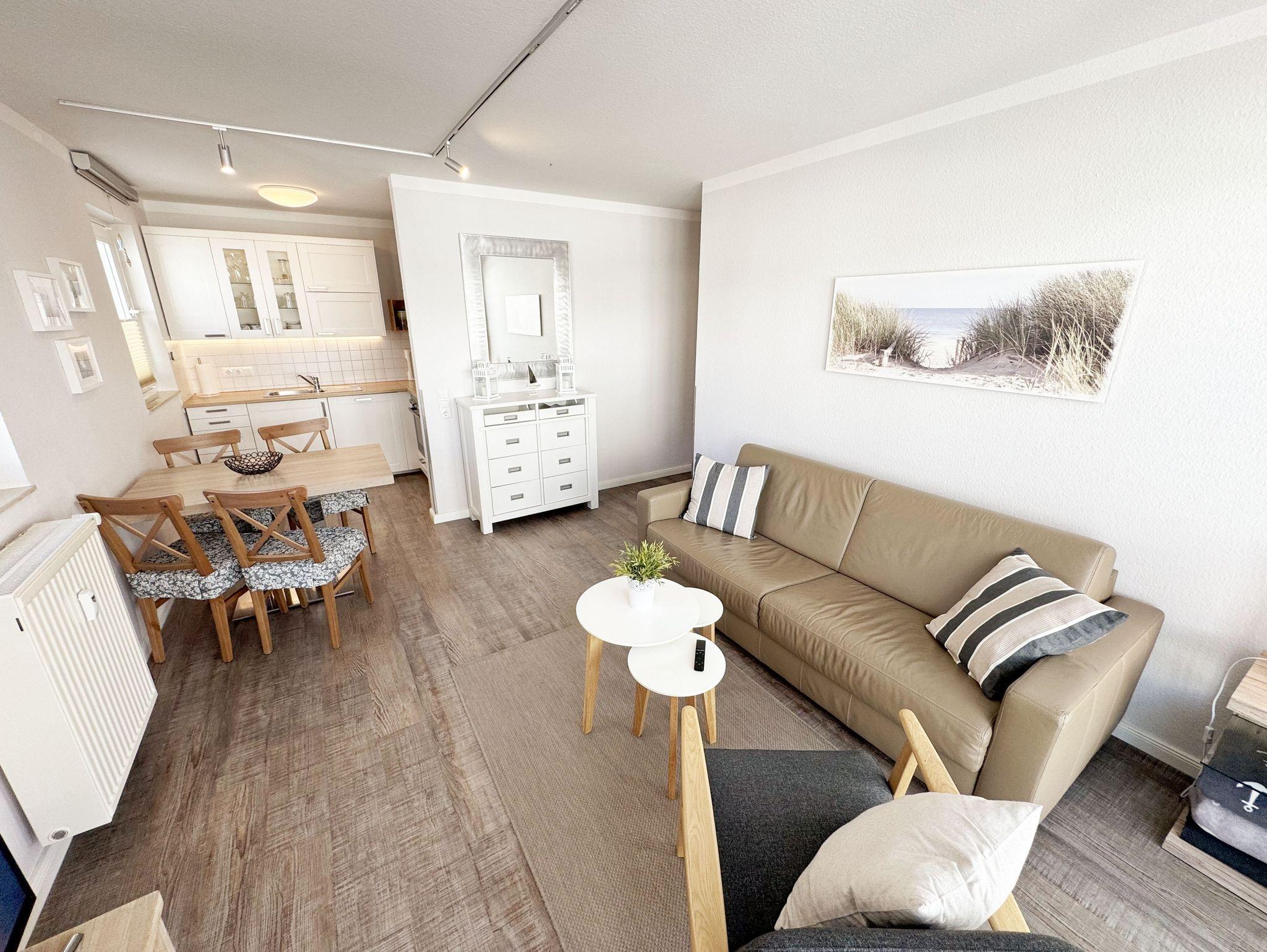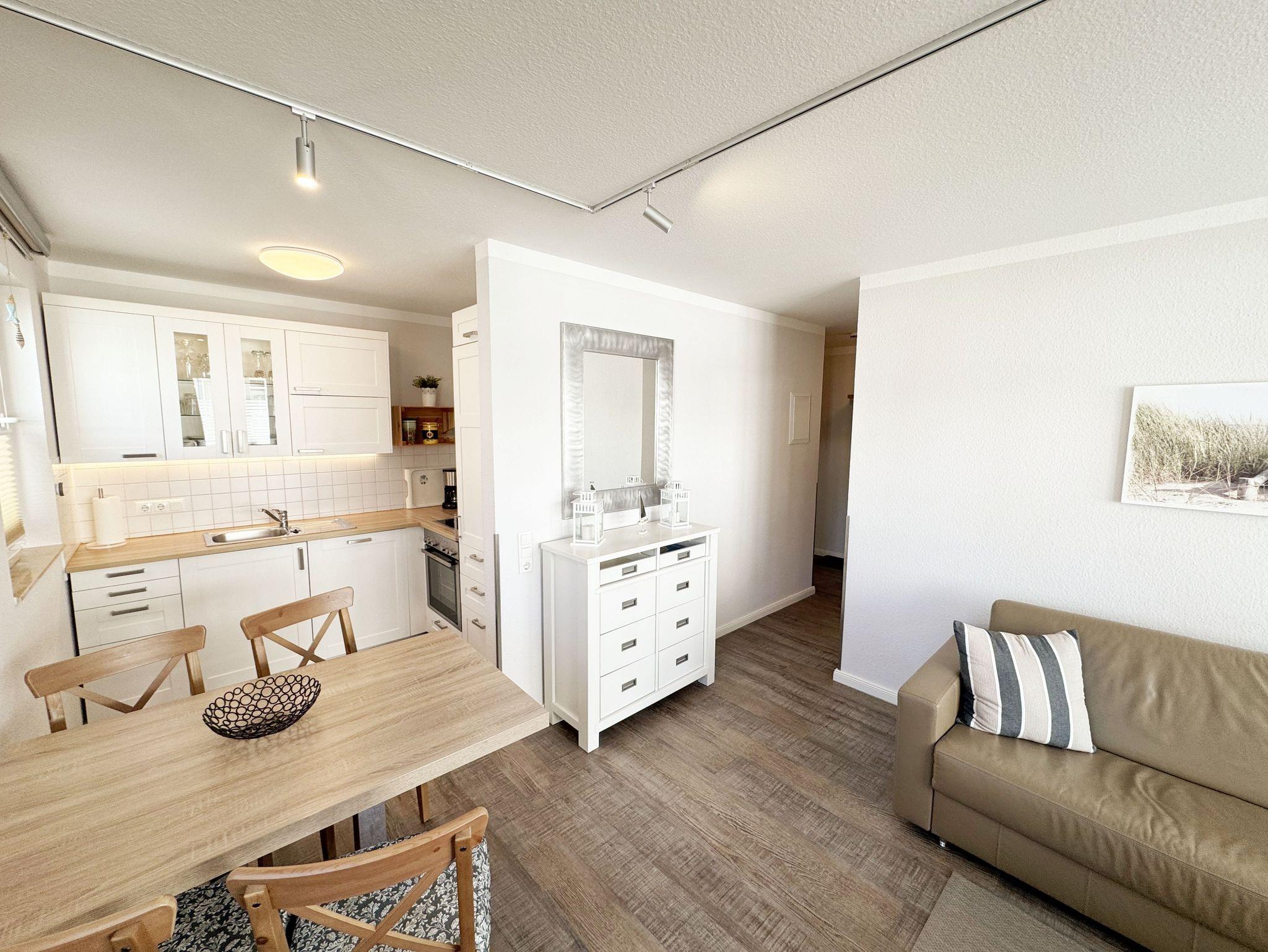 Die Nichtraucherferienwohnung mit ca. 42 qm befindet sich im 1. Obergeschoss der Villa Karola. Zu der Wohnung, die für 2 bis max. 4 Personen ausgelegt ist, gehört ein großer und bestuhlter Balkon mit Vormittagssonne den Sie durch den Wohnbereich erreichen können. Im Wohnbereich gibt es ein gemütliches Ledersofa mit Lattenrahmen und Burtexmatratze, das zu einem Doppelbett von 1,60m x 2,00m, für die 3. und 4. Person umgebaut werden kann. Ein Sessel und Tische sind ebenfalls vorhanden, die man als Beistelltische verwenden kann. Der Wohnraum wird durch einen Essplatz mit Tisch und 4 Stühlen, eine Leselampe sowie eine Anrichte komplettiert. Ein LCD-Smart TV und eine kleine Audiosystemanlage mit CD/DVD Player, USB-Anschluss, Bluetooth, Airplay und WLAN-Anschluss sorgen für Ihre Unterhaltung. Die offene Küche ist mit einer Küchenzeile mit Edelstahl Umluft Herd und Ceranfeld, Geschirrspüler, Mikrowelle, Kühlschrank mit Eisfach, Kaffeemaschine, Tassimo-Maschine, Wasserkocher, Toaster und diversen Küchenutensilien, die man zum alltäglichen Leben braucht ausgestattet. Im Schlafzimmer befindet sich ein Polsterbett aus Kunstleder mit Comfort-Taschenfederkernmatratzen in H2 und H3 mit einer Liegefläche von 1,80m x 2,00m und zwei kleinen Nachttischen und geräumigen Kleiderschrank. Für einen ruhigen Schlaf sorgen Verdunklungsvorhänge. In der Diele stehen die Garderobenschränke und eine separate Garderobe, in denen man ausreichend Stauraum zum Hängen und Legen findet. Das geflieste Badezimmer wird durch eine Dusche, Waschbecken, Fön, WC, einen großen LED beleuchteten Spiegel und einen weißen Hochglanzhängeschrank abgerundet. Die Wohnung verfügt über einen eigenen abschließbaren Fahrradkeller. Ein immer verfügbarer Parkplatz Nr. 10 ist für Sie in der Schulstrasse Nr. 03 reserviert und ist in knapp 3 Minuten leicht zu Fuß erreichbar. 1 Hund (keine Katzen) ist gegen eine Gebühr ein gern gesehener Gast. Die Erstausstattung eines Wäschepaketes (komplette Bettwäsche, 1 Duschhandtuch, 1 kleines Handtuch) können Sie bis 14 Tage vor Anreise gegen einen Aufpreis dazu buchen oder durch eigene ergänzen. Ab 2 gebuchten Paketen erhalten Sie einmalig 1 Geschirrhandtuch und 1 Duschvorleger hinzu.