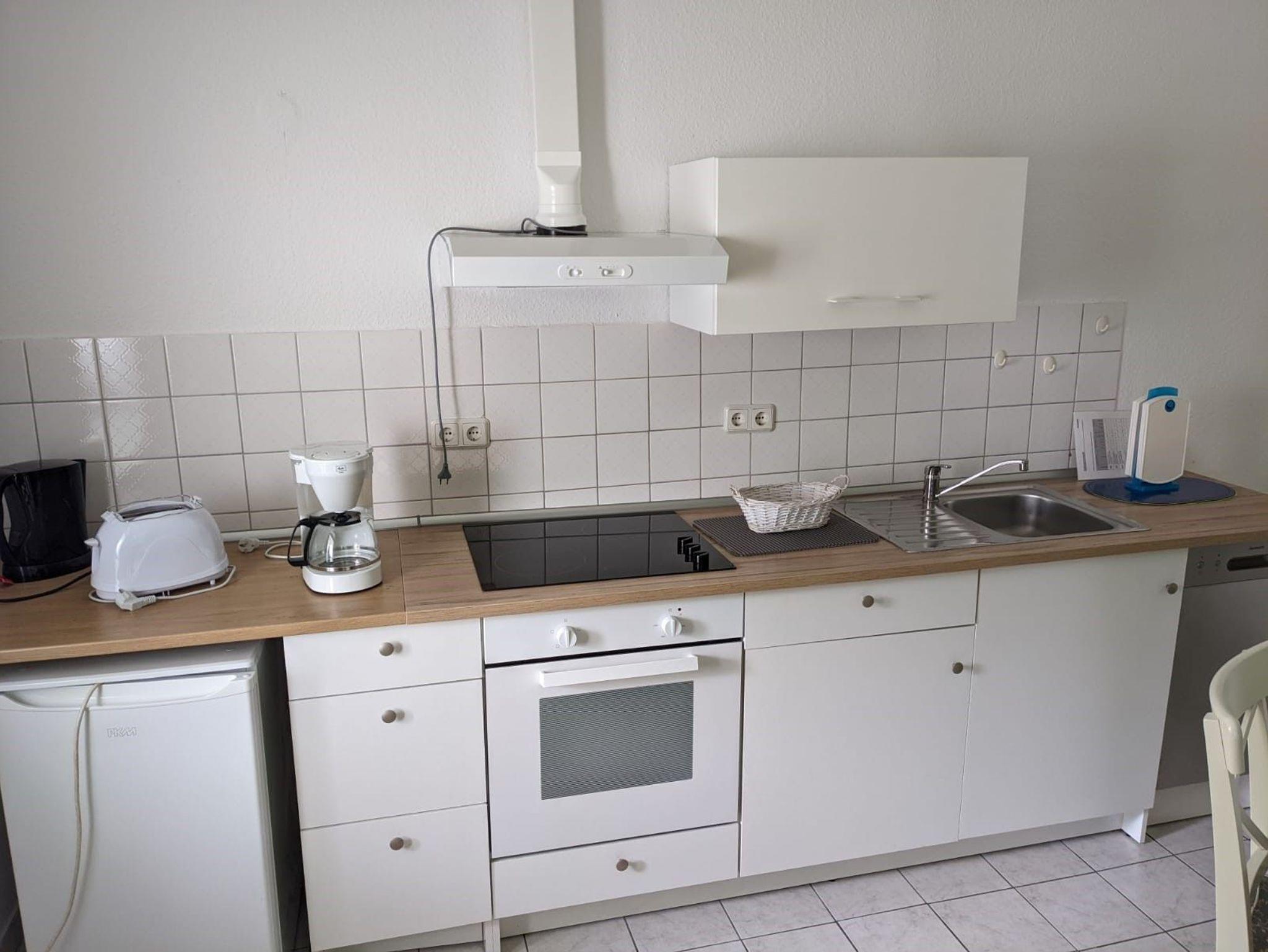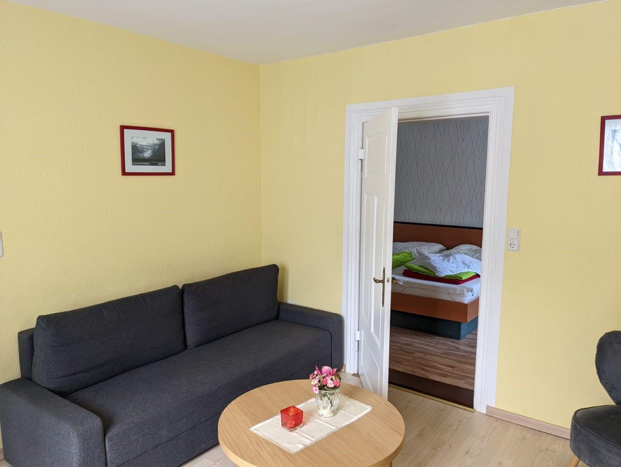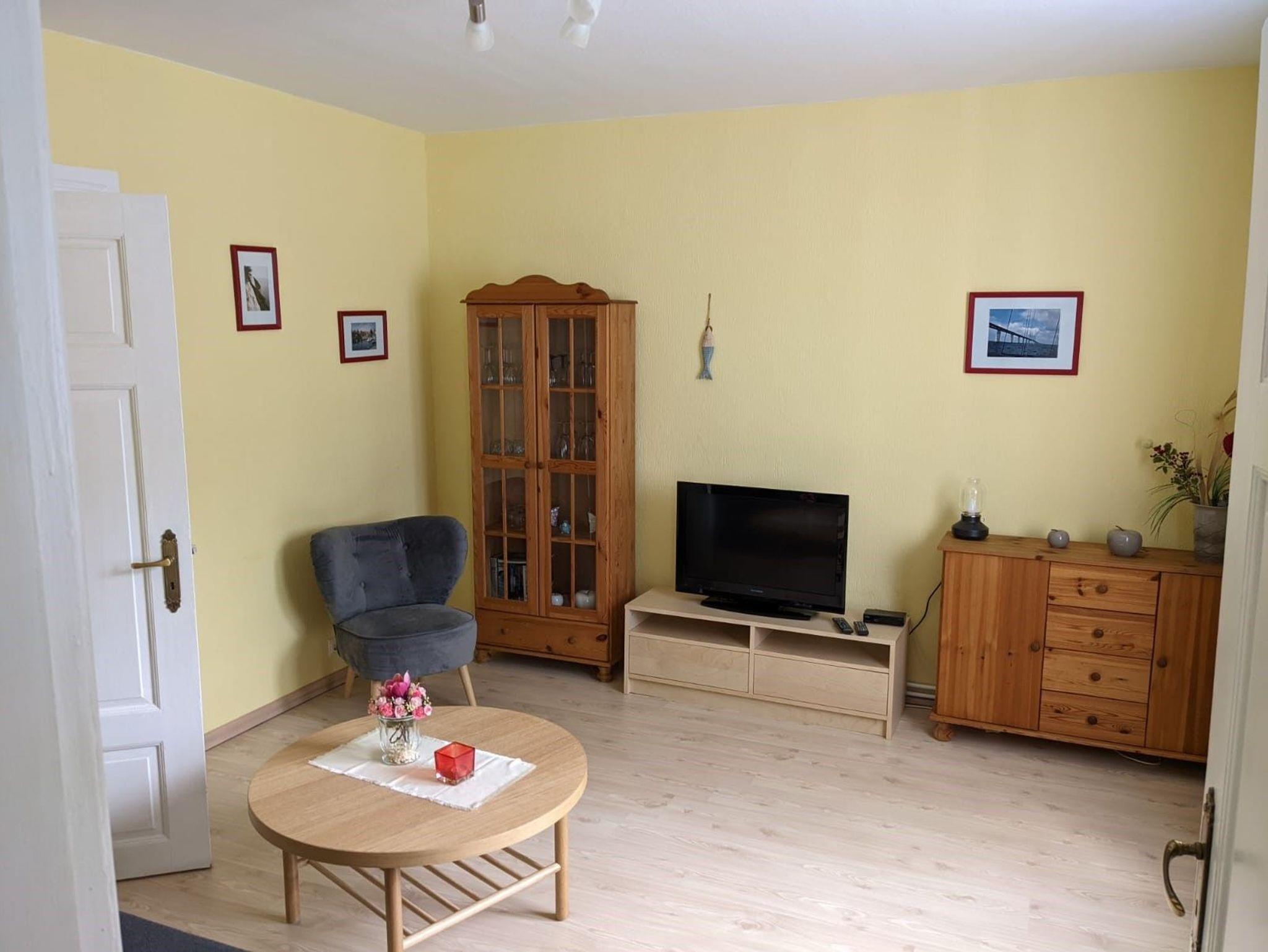 Die 2 Raum-Ferienwohnung befindet sich im Erdgeschoß und besteht aus einem Schlafzimmer mit Doppelbett und Aufbettung, einem Wohnzimmer mit Sitzecke und TV (auch hier ist eine Aufbettung möglich), abgeschlossener - komplett eingerichteter Küche ( Kaffeemaschine, Wasserkocher, Toaster, Geschirrspüler und Herd mit Backofen und Ceranfeld) und Dusche/WC. Im Garten gibt es Sitz- und Grillmöglichkeit.
