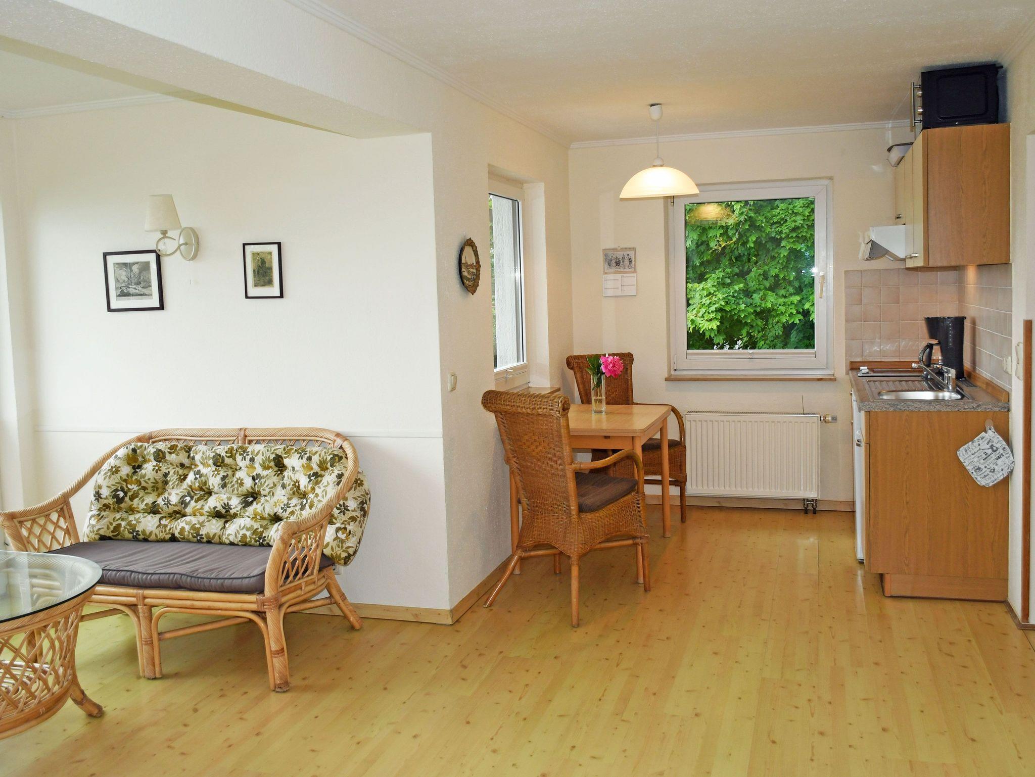 * Wohnbereich mit heller Couchgarnitur und 2 Sesseln mit Couchtisch, TV mit Radio und Esstisch mit 4 Stühlen
