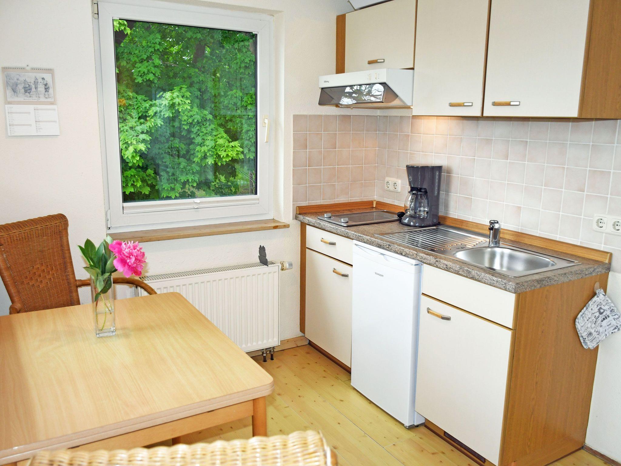 * separate Einbauküche mit 2- Platten-Kochfeld, Backofen, Kühlschrank mit Gefrierfach, Toaster, Kaffeemaschine,