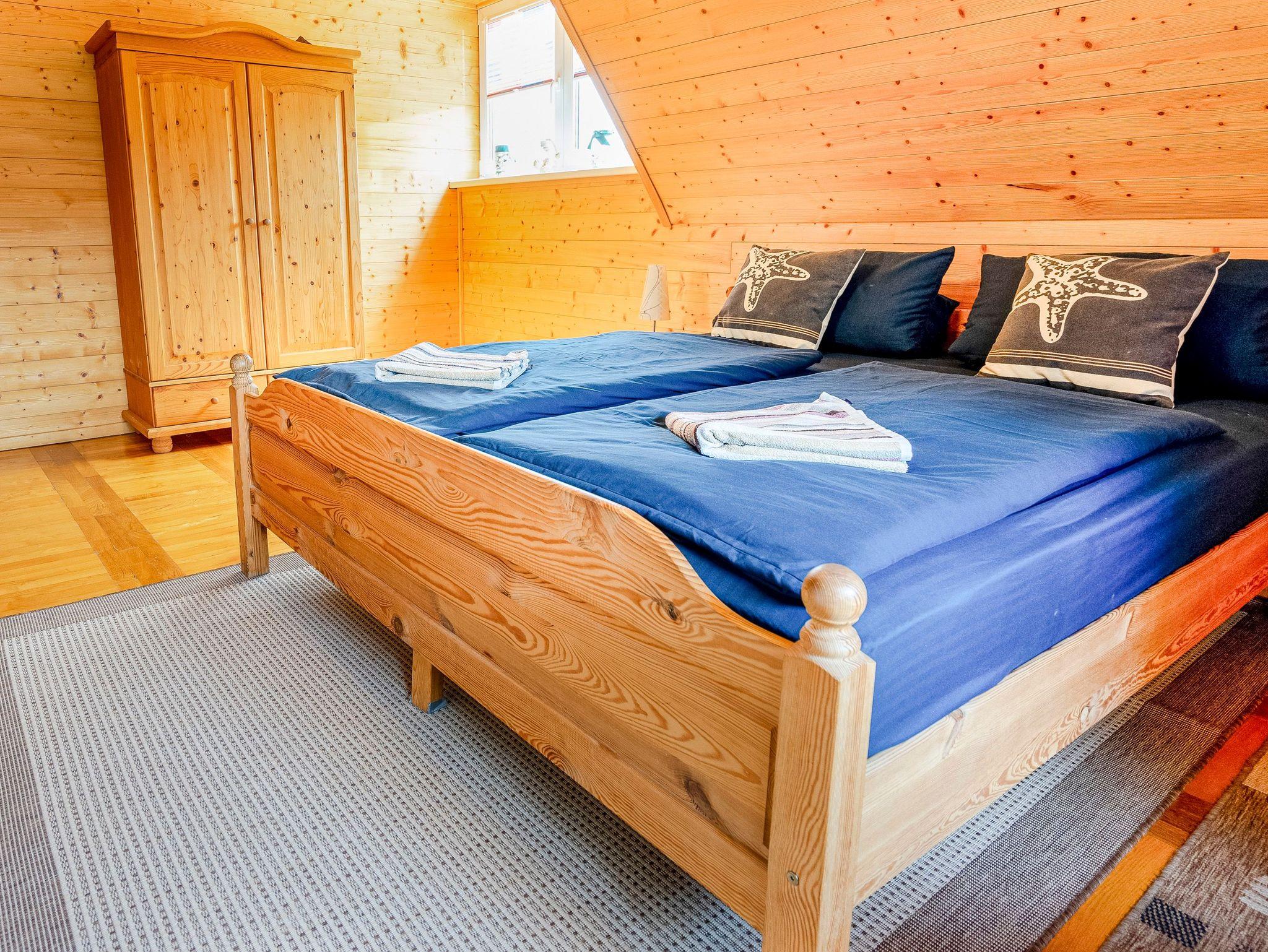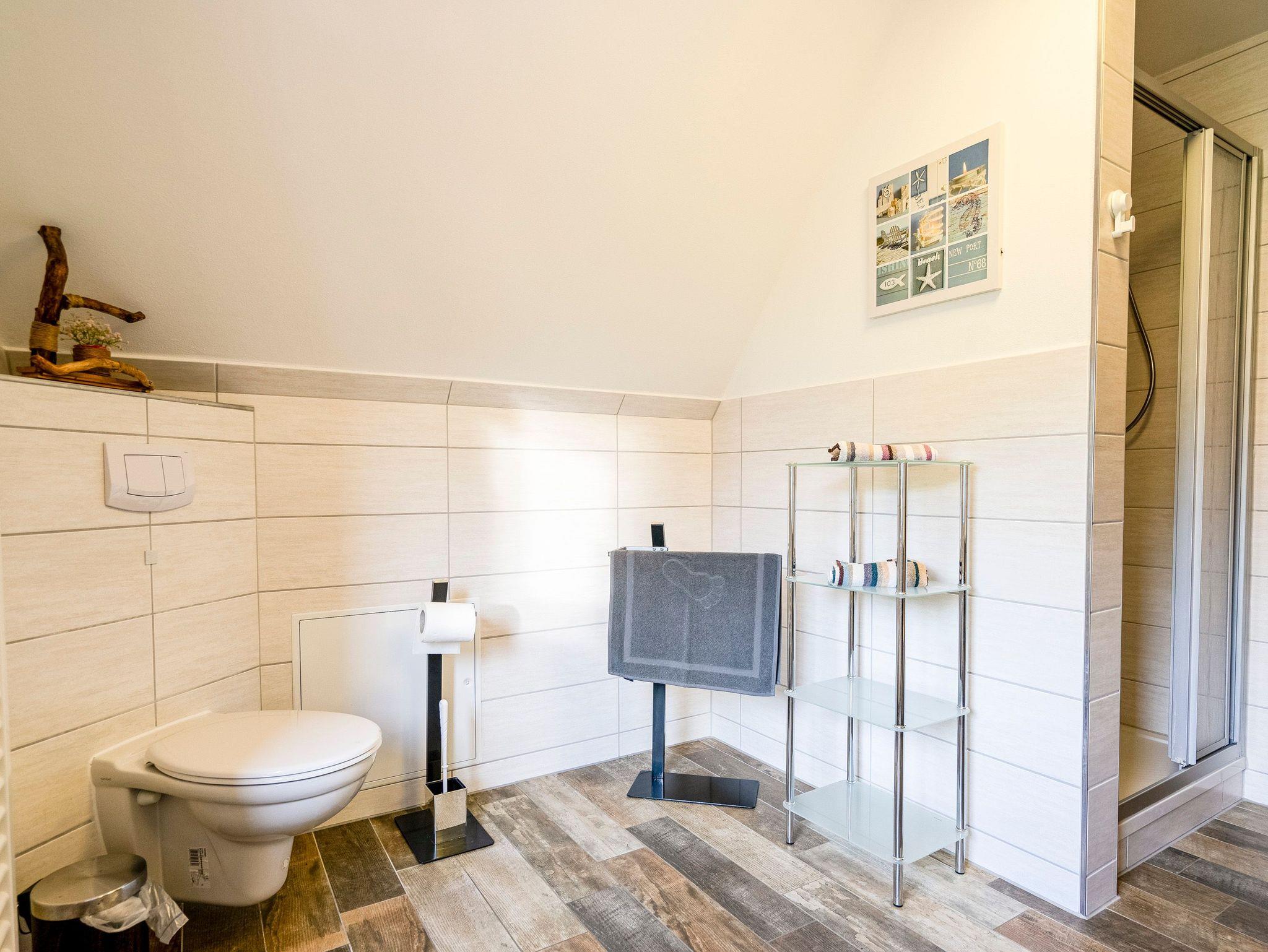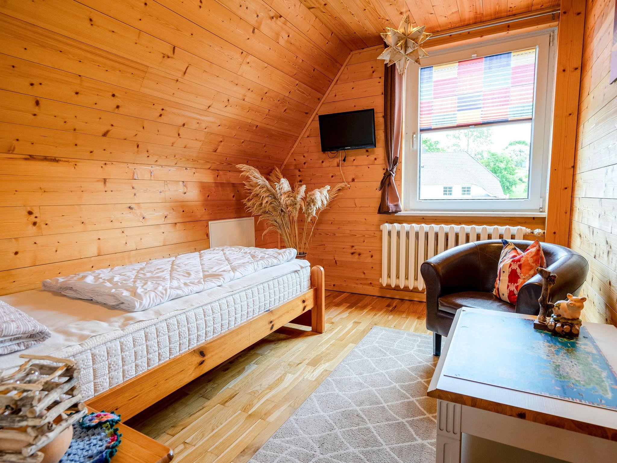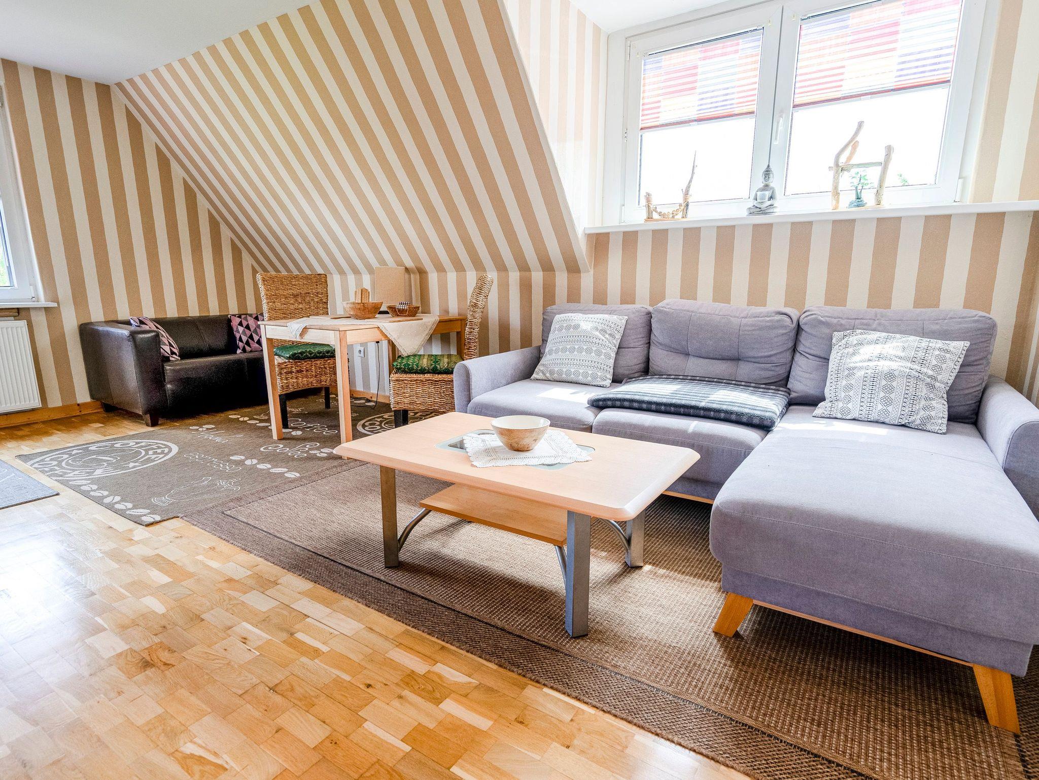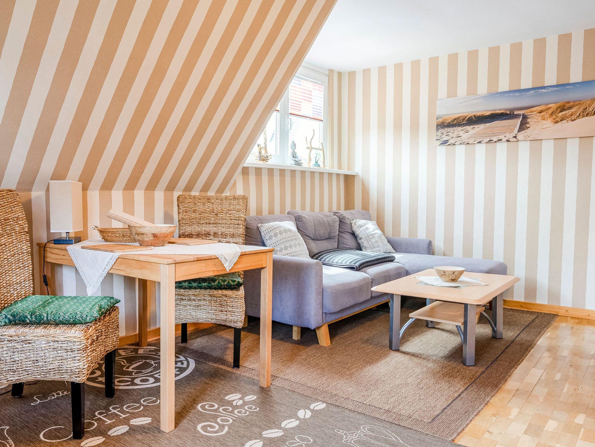 Die 65m² Ferienwohnung für 2 Personen befindet sich im Dachgeschoss des Reetdachhauses. Die Ferienwohnung besteht aus einem Wohnzimmer mit Couch, TV, Essbereich mit Esstisch und einer Küchenzeile (2 Kochplatten, Backofen, Kaffeemaschine, Wasserkocher, Toaster). Weiterhin befinden sich in der Ferienwohnung ein separates Schlafzimmer mit Doppelbett, Kleiderschrank und TV, ein weiteres Schlafzimmer mit Einzelbett, Kommode und TV sowie ein Badezimmer mit Dusche und WC. Die einzelnen Räume sind über den offenen Flur zu erreichen. Ein Parkplatz steht auf dem Hinterhof kostenfrei zur Verfügung. Internet-WLAN ist kostenfrei vorhanden.
