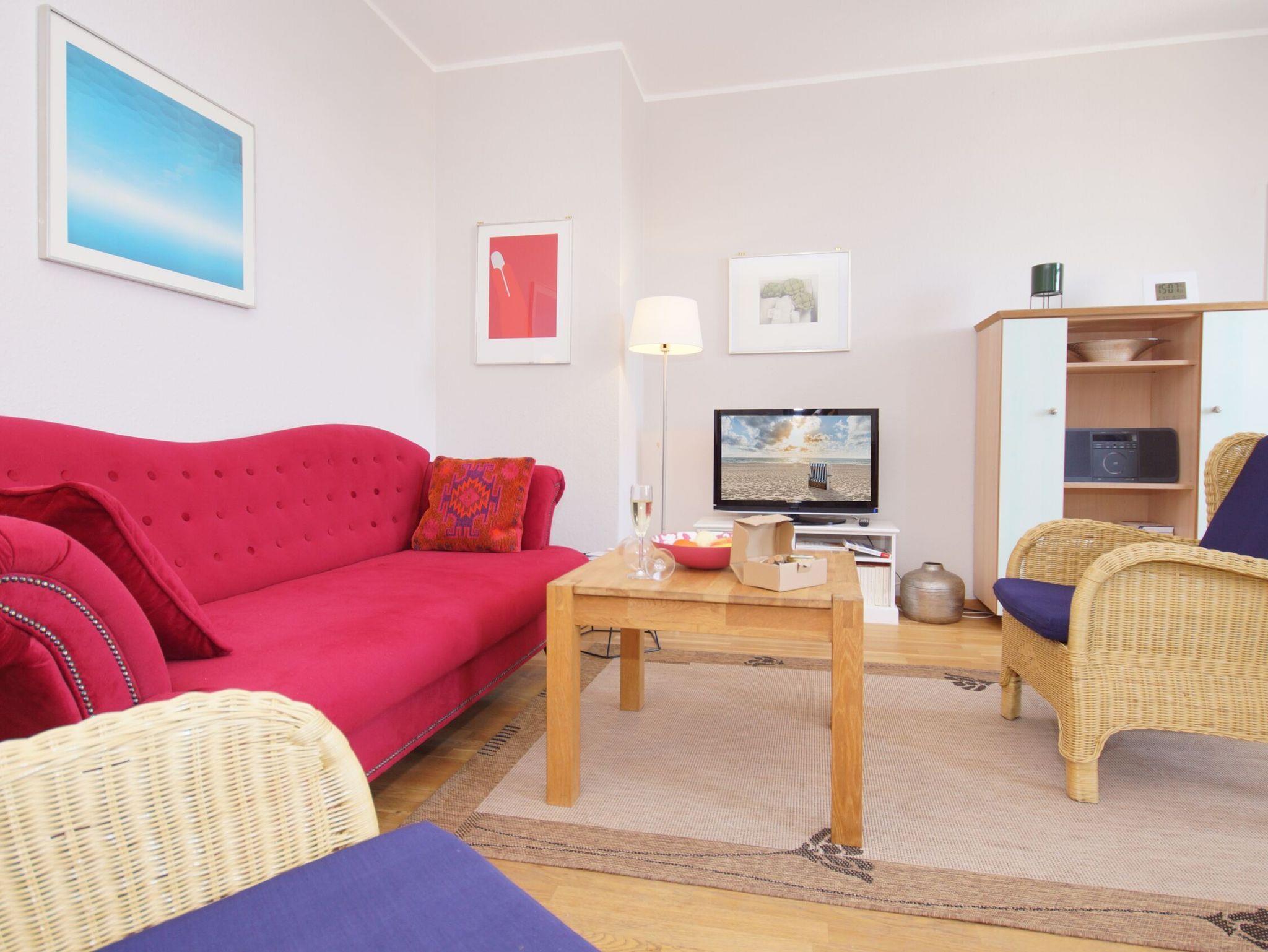 Der freundliche Wohnbereich bietet einen gemütlichen Ort zum Ausklingen der erlebnisreichen Tage auf Rügen. Hier befindet sich neben einem modernen Flachbild-TV auch eine komfortable Couchgarnitur. Vom Wohnbereich aus können Sie auch ein einen tollen Ausblick auf die Göhrener Ostsee genießen!