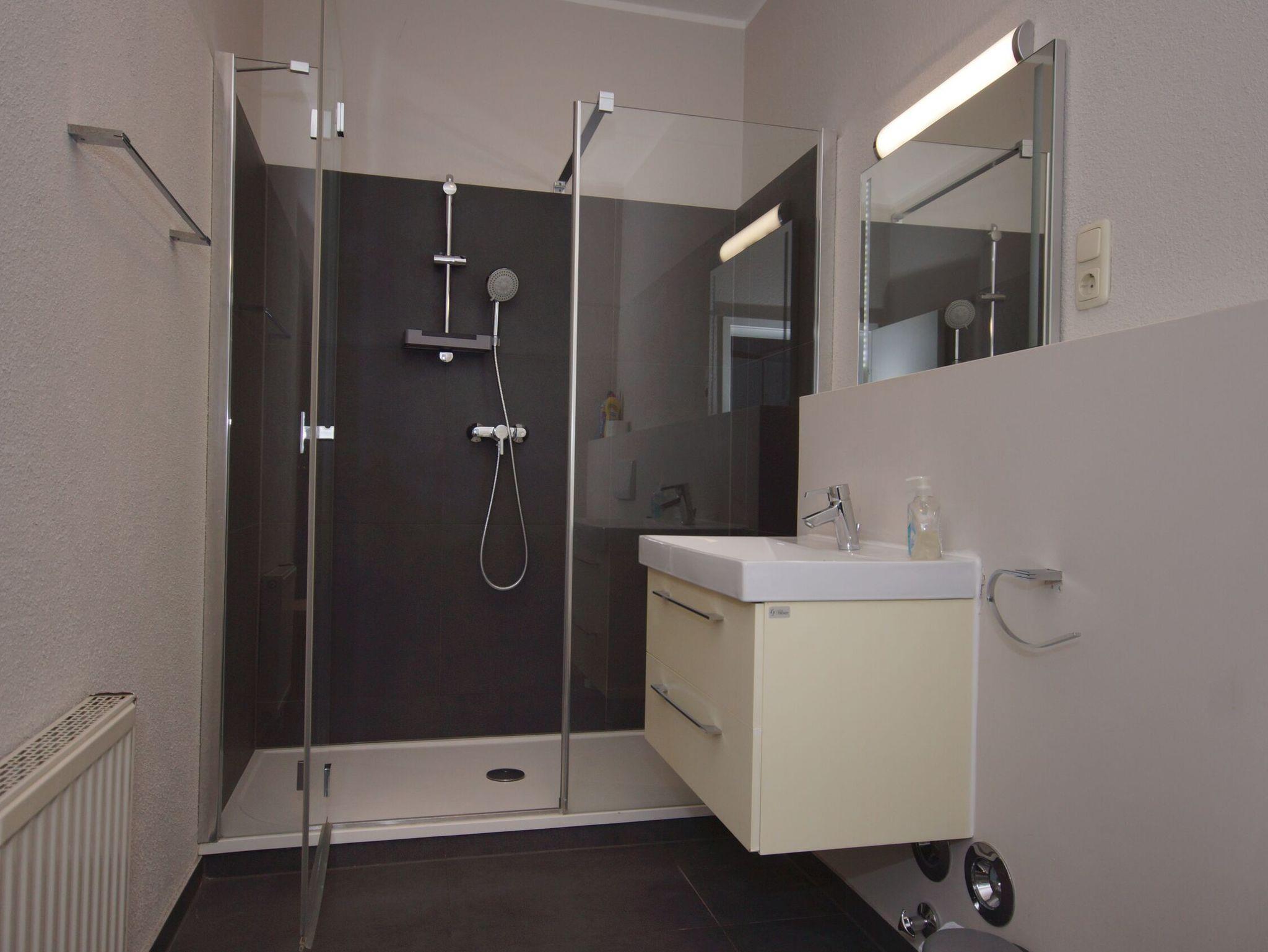 Das hell erleuchtete Badezimmer verfügt über eine Dusche, WC und einen Waschtisch mit Spiegel.