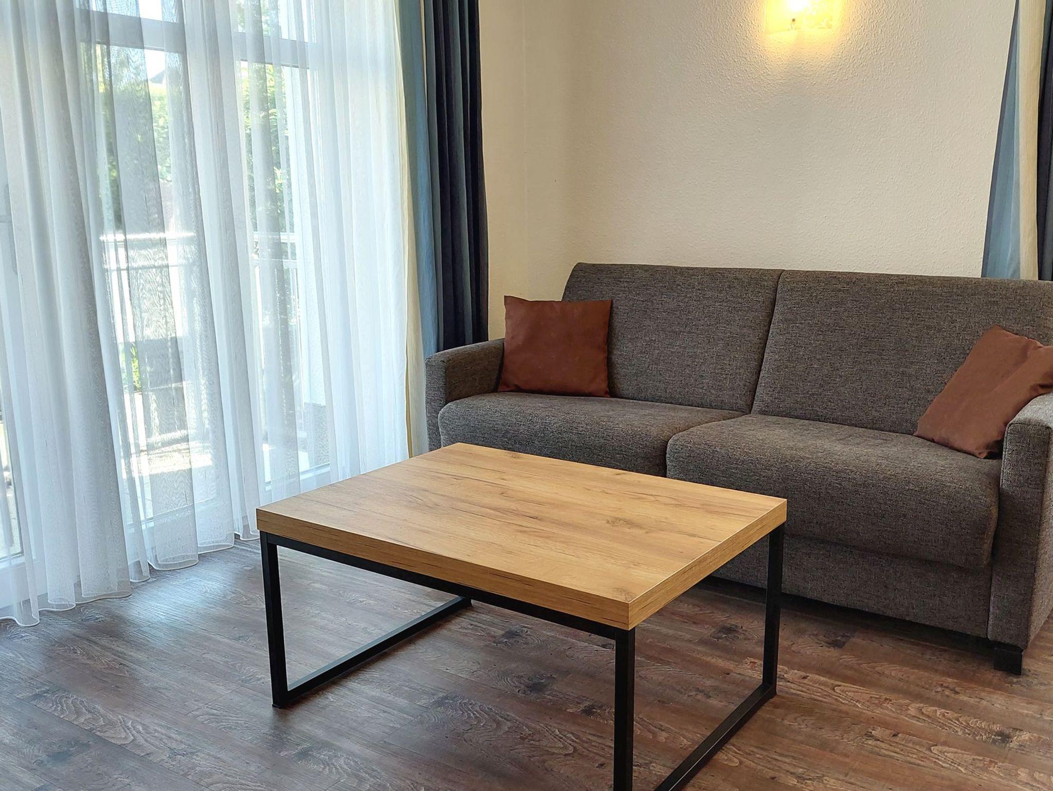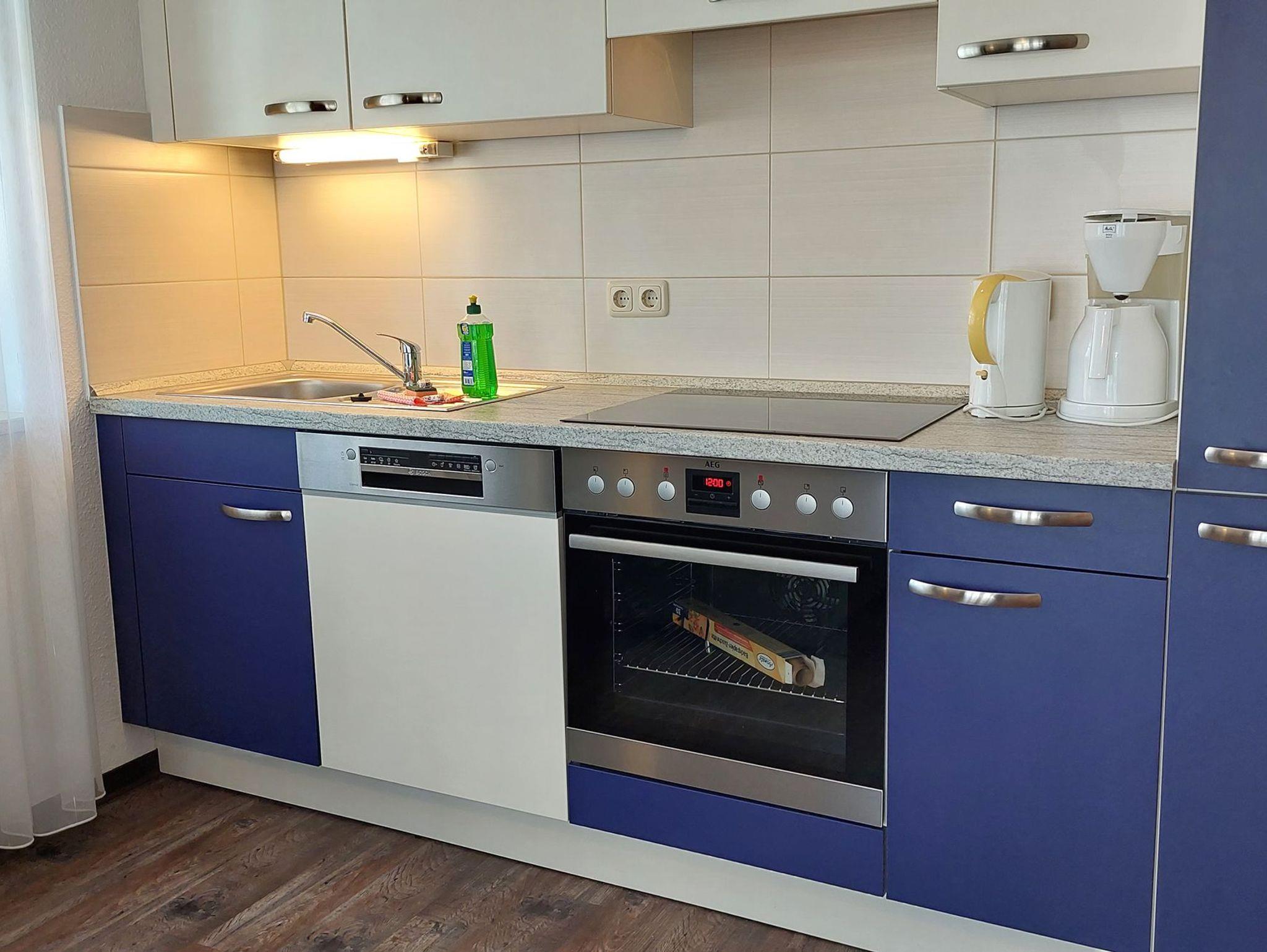 Diese freundliche Wohnung ist aufgeteilt in einen Wohnraum mit kleiner Terrasse und integrierter Küchenzeile, ein Schlafzimmer und ein Duschbad mit Waschtisch und WC. Das Wohnzimmer begrüßt Sie mit einem Schlafsofa und Sessel sowie Flachbild-TV. Das Schlafzimmer verfügt über ein Doppelbett (1,80m x 2m) sowie einen Kleiderschrank. Die Küchenzeile ist mit Backofen, Geschirrspüler, Cerankochfeld, Kühlschrank mit kleinem Gefrierfach, Cerankochfeld, Mikrowelle, Kaffeemaschine, Wasserkocher und Toaster ausgestattet. Highlights: Kostenfreies WLAN sowie ein frei wählbarer PKW-Stellplatz direkt am Haus. Haustiere sind in dieser Wohnung herzlich willkommen.