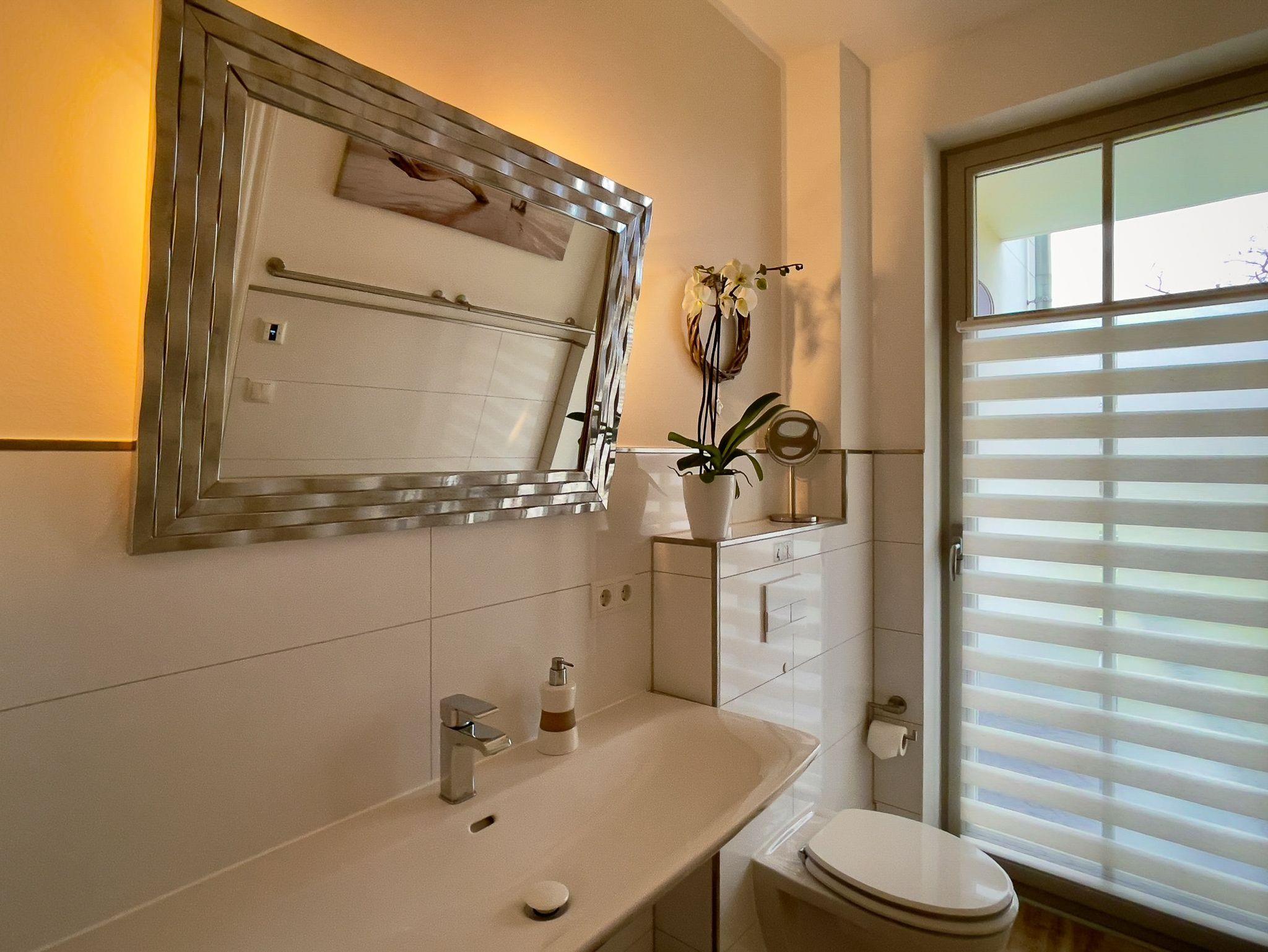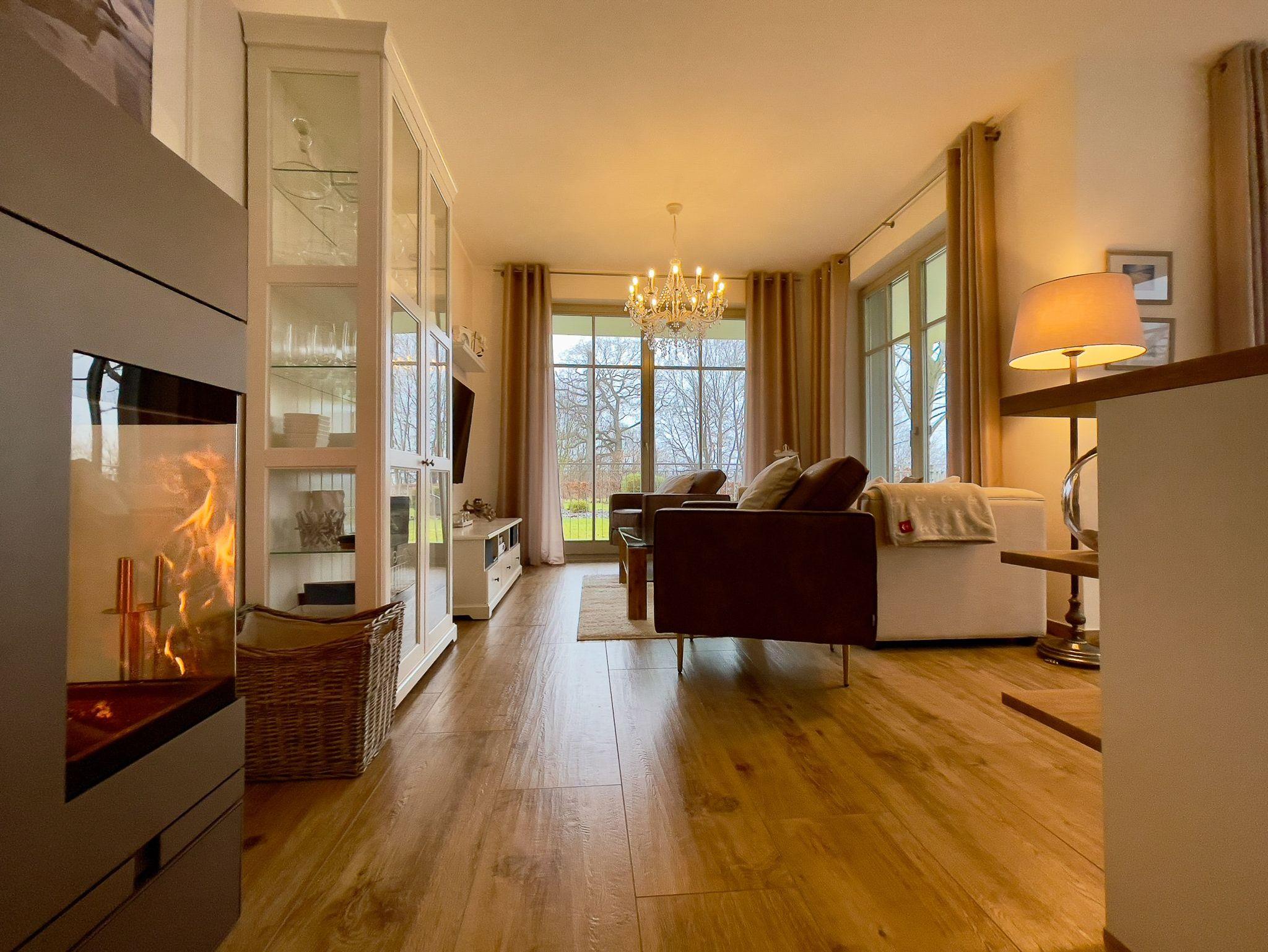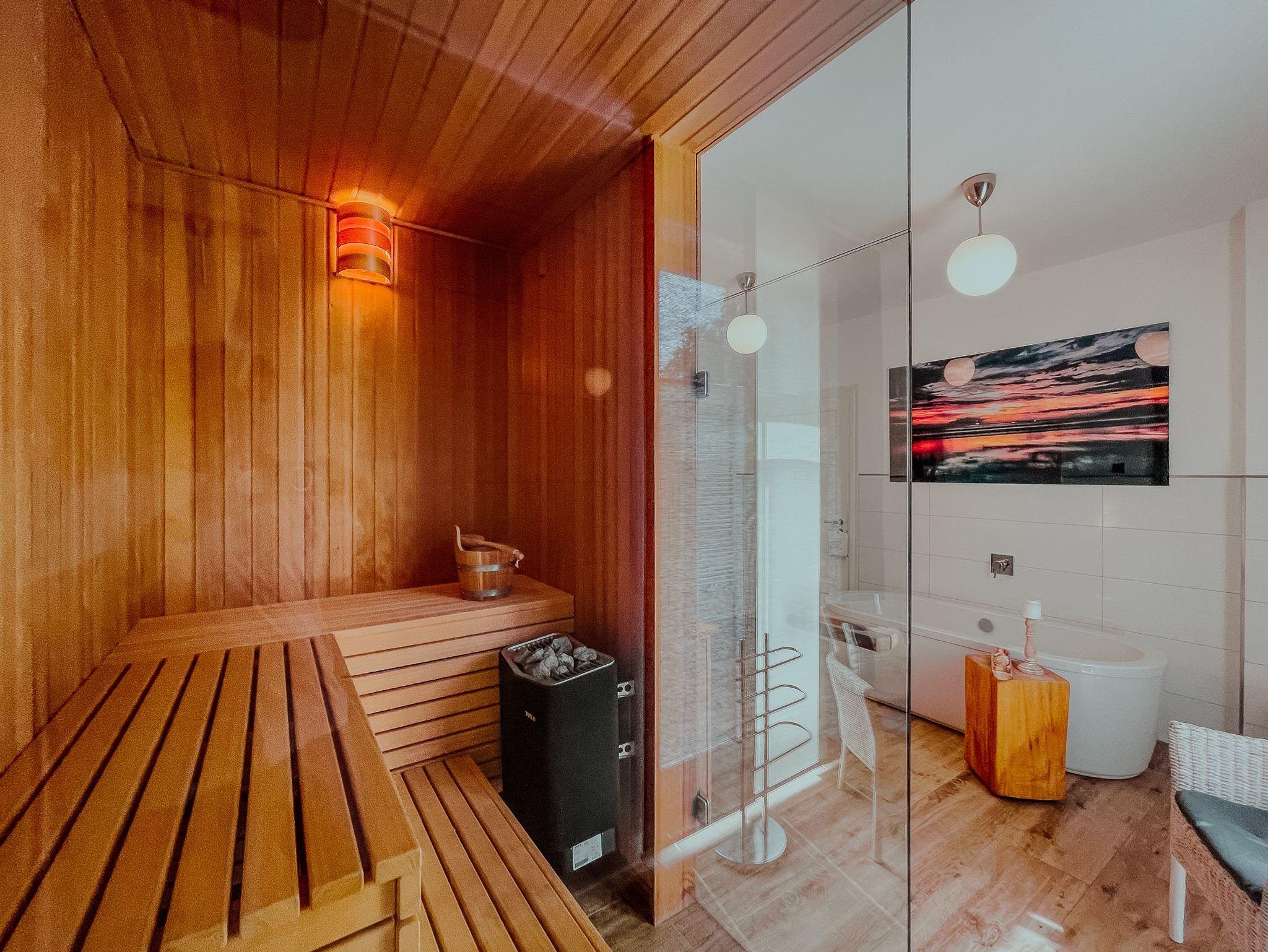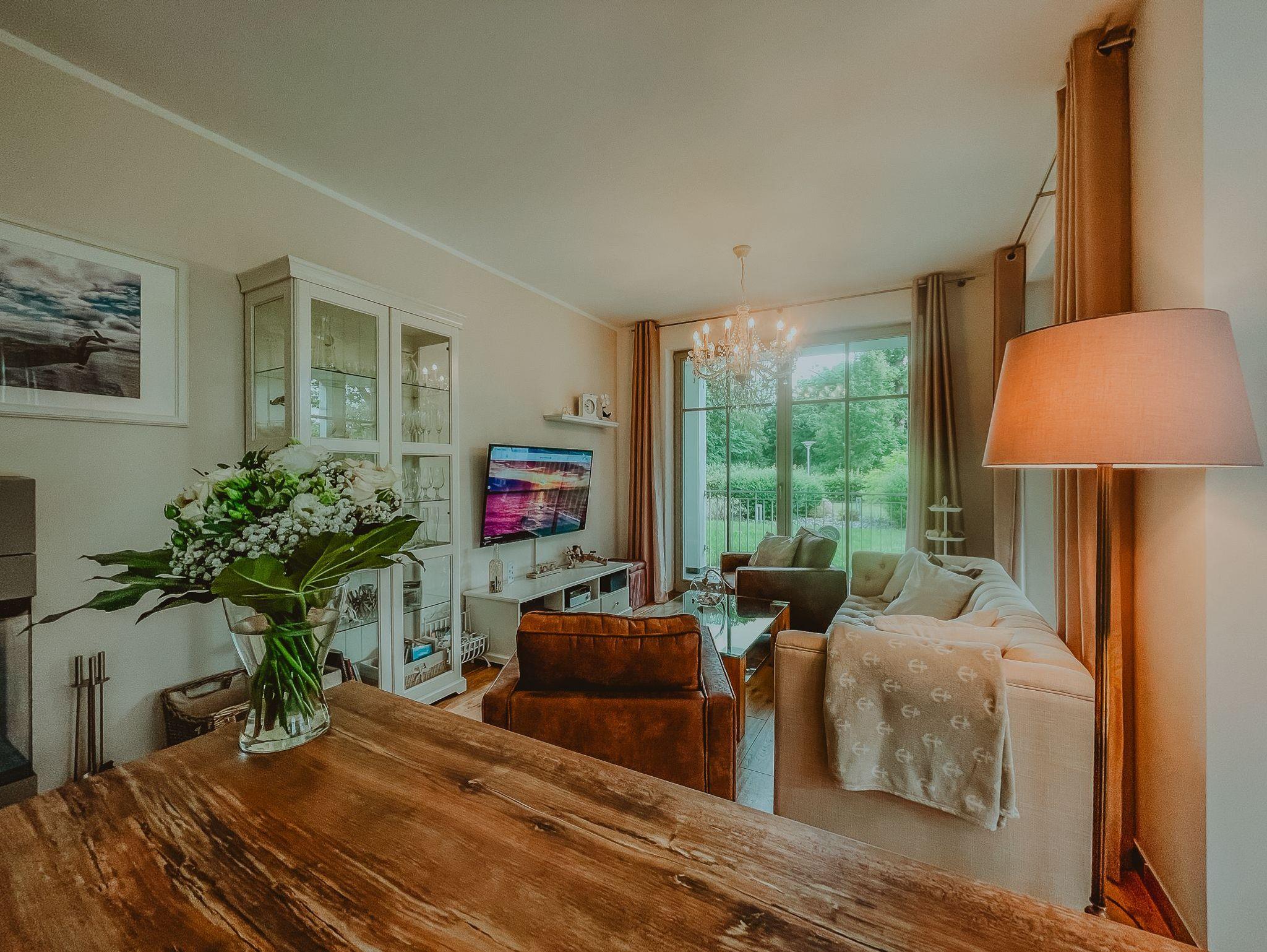 Die exklusive Ausstattung der FeWo Strand-Idyll mit eigener Sauna, Badewanne, großen Wellness- und Regenduschen, W-LAN mit Smart-TV's und vielen anderen Ausstattungsmerkmalen eignet sich auf Grund der zwei Schlafzimmer mit je einem separaten Bad besonders für Familien (auch mit großem Kind und Schwiegerkind), zwei befreundeten Pärchen (2 Parkplätze vorhanden) oder Familien mit Personen, die es vom Auto bis in die Wohnung bequem haben wollen (ebenerdig/ breite Türen). Sie können zwei Terrassen nutzen. Auf Grund der Fußbodenheizung, der Sauna, dem Kamin und der freistehenden Badewanne eignet sich diese Wohnung auch für einen entspannten Urlaub in der Neben- oder Wintersaison. Die Wohnung liegt auf der ruhigen Seite einer Ostseearchitektur-Villa mit Blick auf den Küstenwald. Das Rauschen der Ostseewellen und das Singen der Vögel wird Sie entspannen?