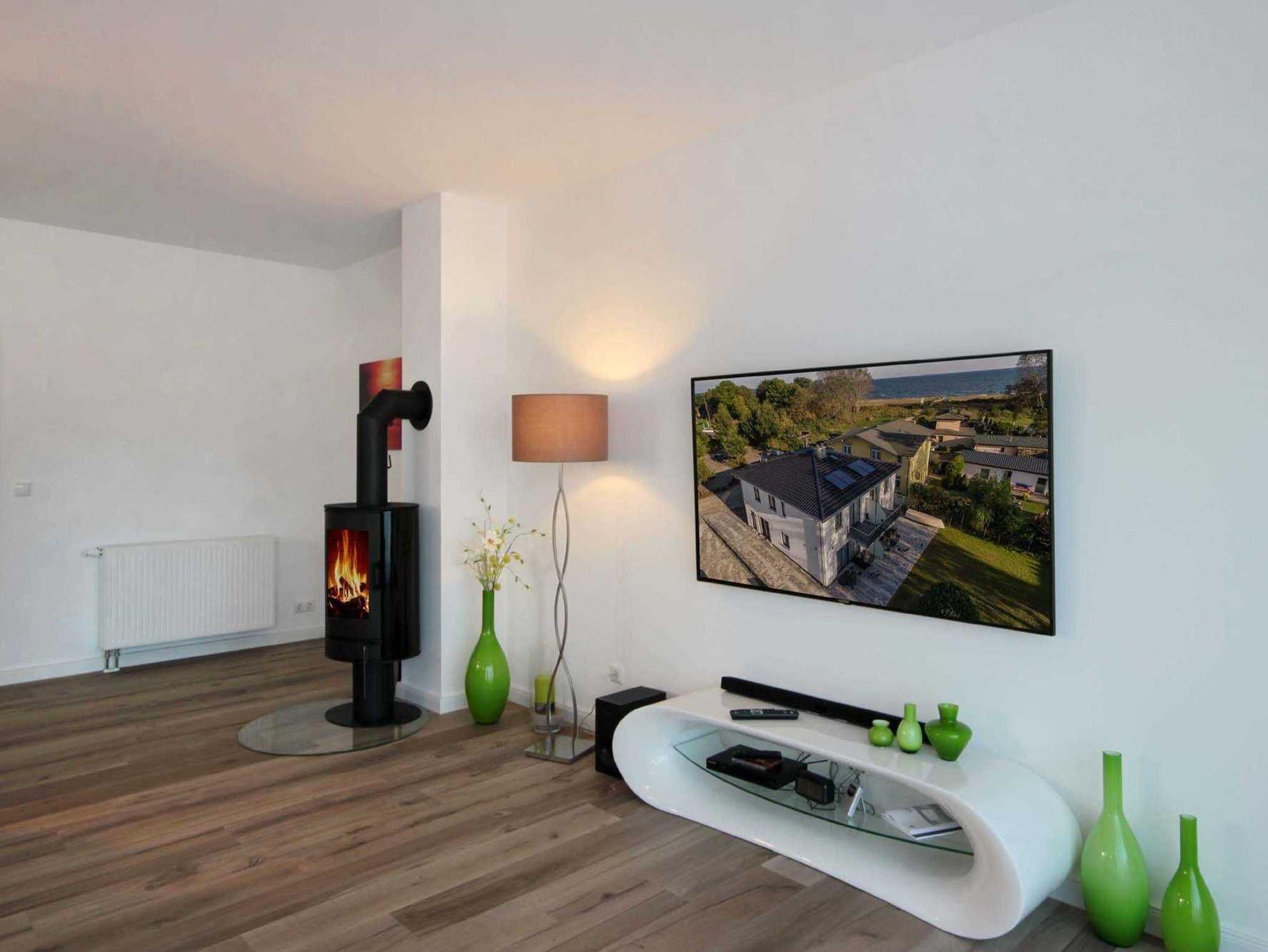 Im EG befindet sich der Wohnbereich mit einer großzügigen Sitzgruppe, Kamin sowie die moderne Küche und der Essbereich. Zur technischen Ausstattung im Wohnraum zählt ein Flachbildfernseher (65-Zoll) und der kostenfreie Internetzugang. Die Küche ist mit Backofen, Cerankochfeld, Mikrowelle, Geschirrspülmaschine, Kühl-/Gefrierkombination, Kaffeevollautomat, Wasserkocher, Toaster und diversen anderen Küchenhelfern komplett ausgestattet. Darüber hinaus gibt es Tageslicht-Duschbad mit Waschtisch, Waschmaschine und WC.