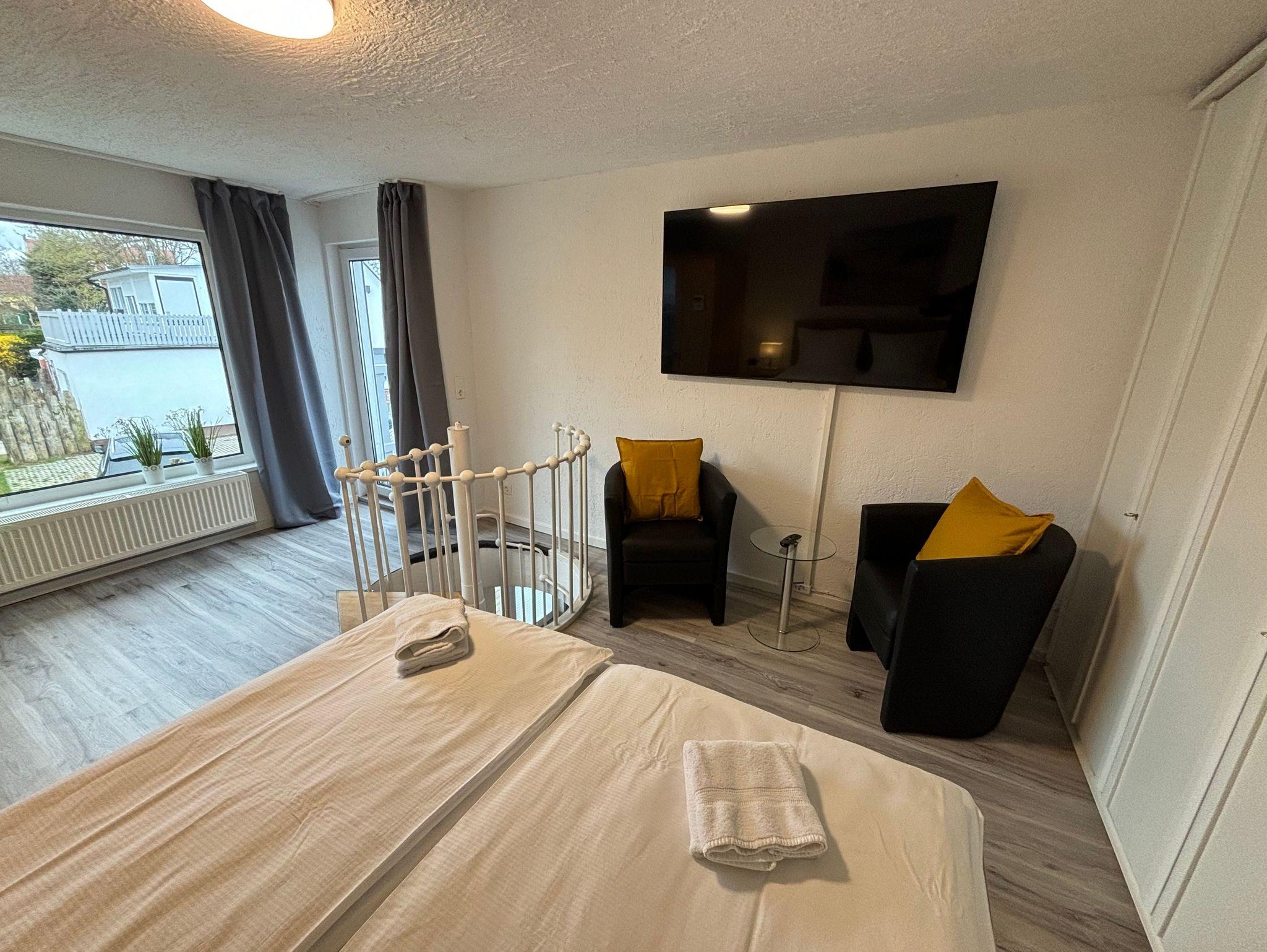 Obergeschoss: Schlafzimmer mit Doppelbett und Einzelbett, große Dachterrasse