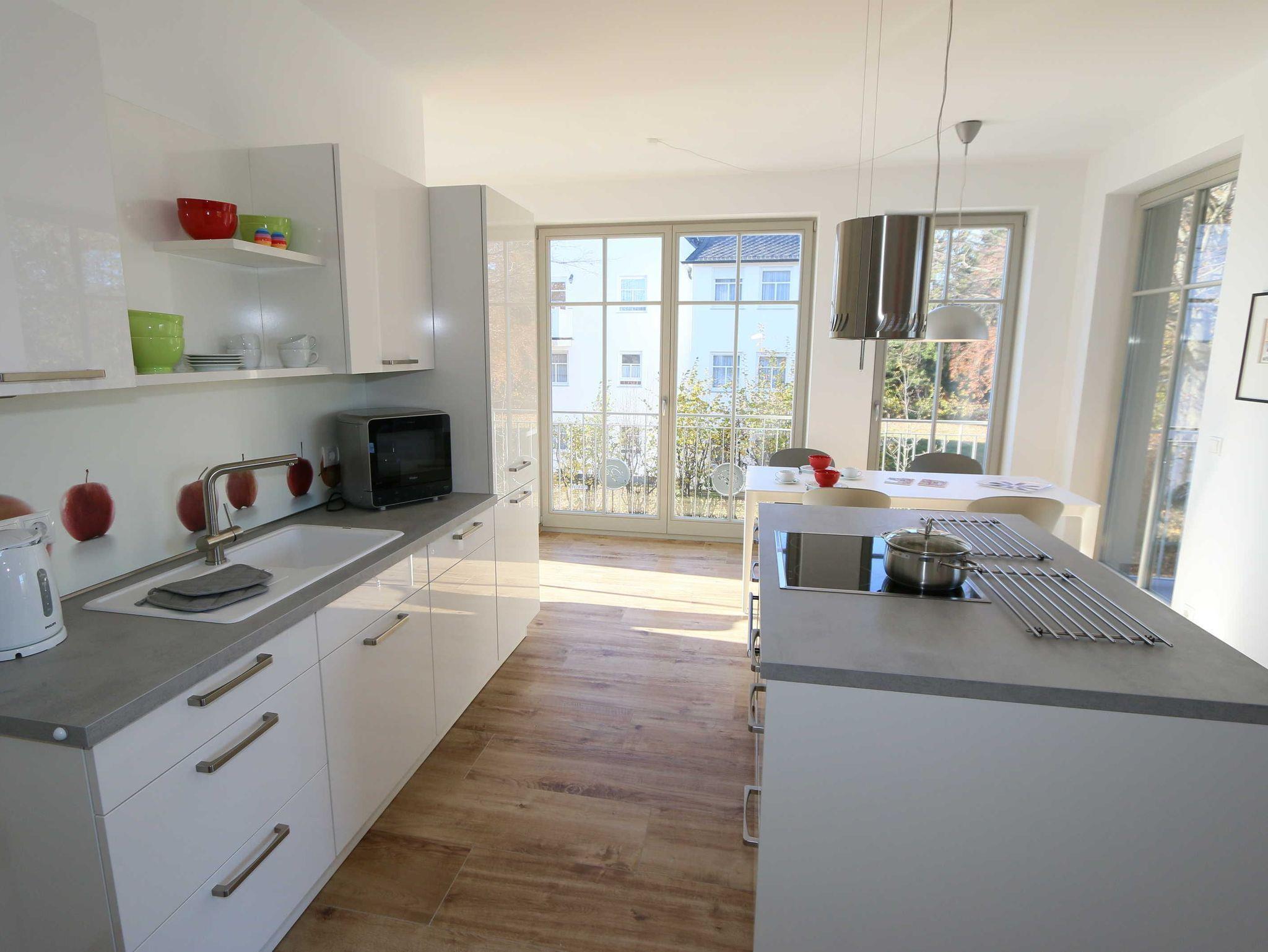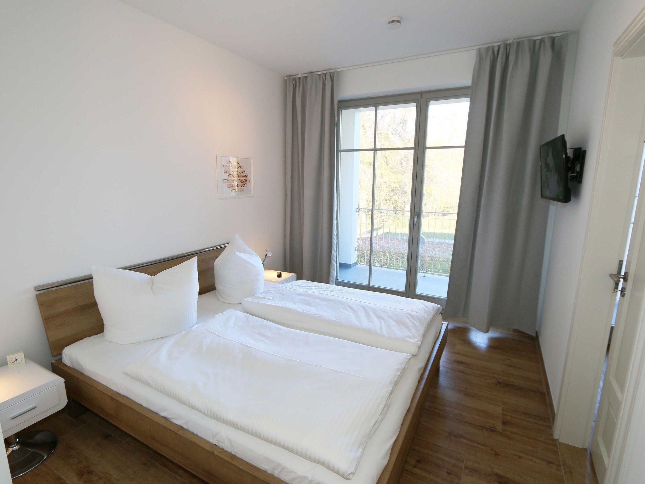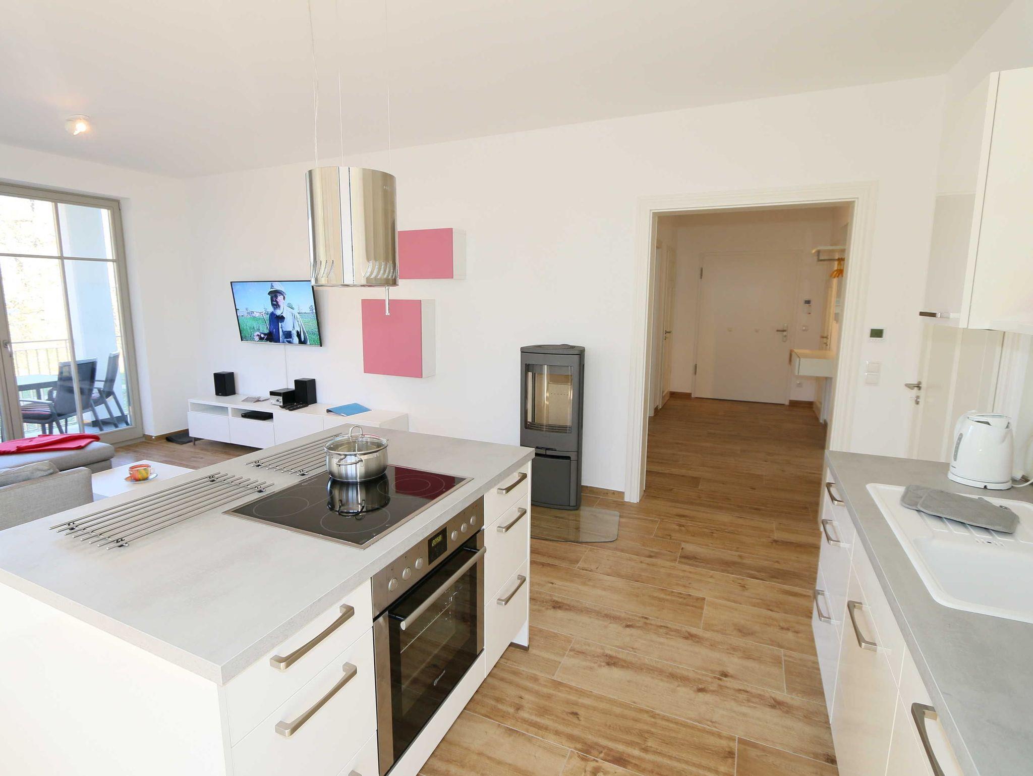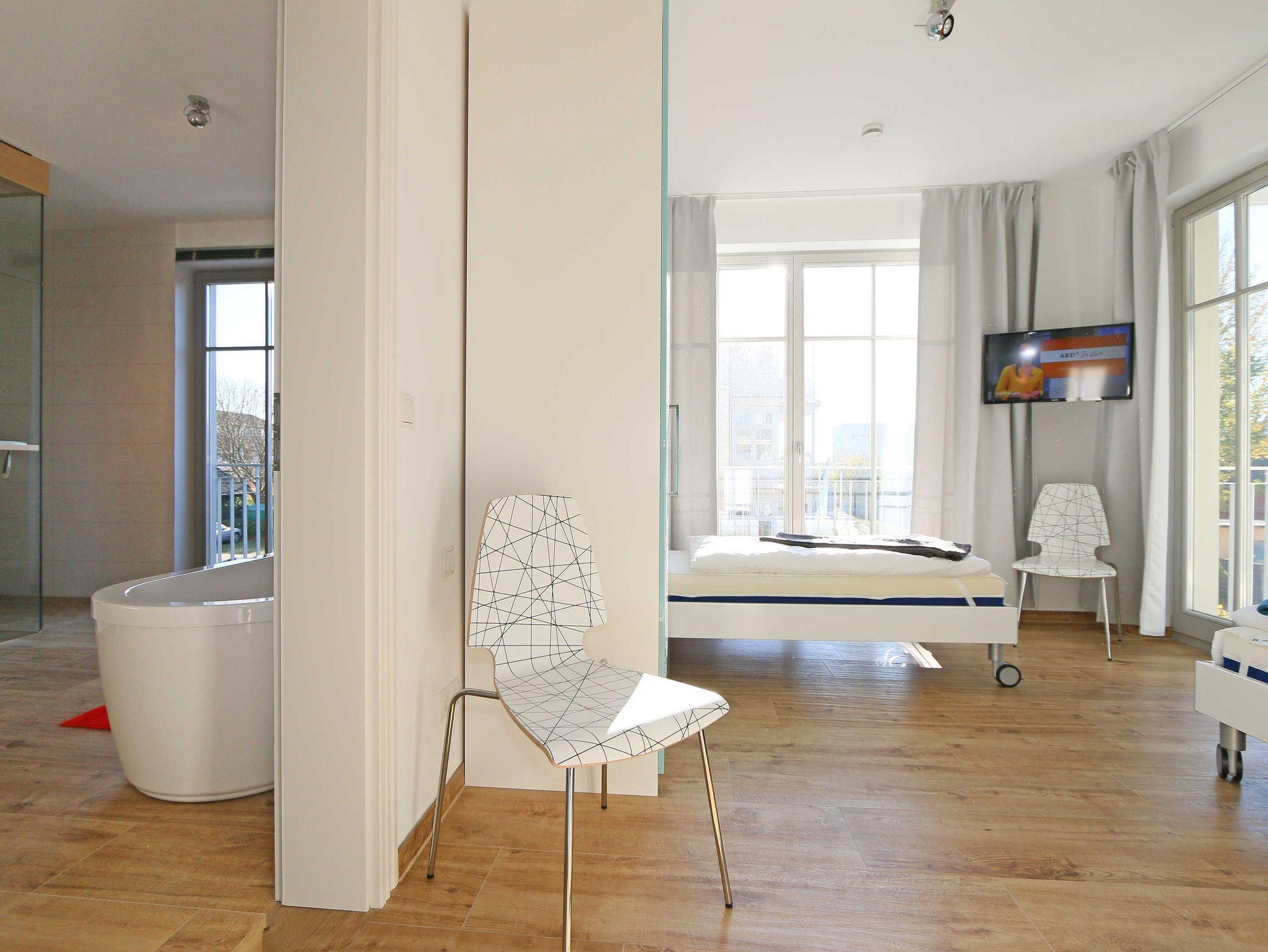 Die Ferienwohnung (Nichtraucher) hat eine Wohnfläche von ca. 92 m² zuzüglich 28 m² überdachtem Balkon. Die Wohnung ist optimal für max. 4 Erwachsene und 2 Kleinkinder bis zu 3 Jahren im Kinderreisebett ausgestattet. 1x Hochstuhl und 1x Kinderreisebett mit zusätzlicher Matratze ohne Bettinlett stehen Ihnen inklusive zur Verfügung. Die verwendeten Materialien der Wohnung sind exklusiv. Ökologische Gesichtspunkte wurden berücksichtigt, so versorgt Sie die Solartherme mit warmem Wasser und die dreifach verglasten Fenster vermindern den Verbrauch an Wärmeenergie. Die Schallschutz-Eingangstür und der private Vorflur schirmen Sie von den anderen Wohnungen ab. Die Möblierung der Wohnung haben wir der Lage und Architektur angepasst: hell, luftig, offen, modern: genießen Sie die Weite und Leichtigkeit auch im Inneren der Wohnung. Der Wohn-/Essbereich ist überwiegend in dänischem Design gestaltet. Technisch ist das Wohnzimmer mit einem Smart-TV, einem Blu-Ray-Player, einer Stereoanlage mit Anschlussmöglichkeit für Android oder I-Phone via Bluetooth sowie DAB-Radio und einem Internetanschluss (WLAN) ausgestattet. In der kalten Jahreszeit sorgt ein Kamin (mit Seitenscheiben für Rundumblick auf die Flammen) für eine angenehme Atmosphäre. Ein Schreibtisch, ein Lesesessel, eine Leselampe und eine komfortable Couchecke runden den Wohnbereich ab. Die helle Küche mit Kochinsel, offen zum Wohnbereich, ist vollwertig ausgestattet mit Geschirrspüler, Kühlschrank, Gefrierschrank, Backofen, 4-Zonen-Cerankochfeld, Mikrowelle, Kaffeemaschine, Toaster, Wasserkocher, Nespresso-Maschine, Mixer und French Press. Ein großer Esstisch lädt zum gemeinsamen Essen ein. Für den erholsamen Schlaf erwarten Sie im en-suite Schlafzimmer ein bequemes Komfort-Doppelbett (1,80 m x 2,00 m) mit hochwertigen Matratzen und verstellbaren Lattenrosten, ein Kleiderschrank, Nachttische und Wecker. Das 2.Schlafzimmer ist identisch ausgestattet, mit dem Unterschied, dass zwei Einzelbetten (je 0,90 m x 2,00 m) Ihrem geruhsamen Schlaf dienen. Die Betten sind leicht beweglich und können zusammen oder getrennt gestellt werden. Beide Schlafzimmer können bei Bedarf vollständig verdunkelt werden und verfügen zusätzlich über je einen Smart-TV. Auf die Balkone gelangen Sie vom Wohn-/Essbereich sowie beiden Schlafzimmern. Die Balkone (Nord/West & Süd/West) sind mit hochwertigem Esstisch und Stühlen sowie Liegestühlen ausgestattet, ergänzt durch eine Lounge-Ecke. Das große Wellness-Bad mit Sauna, freistehender Badewanne, bodengleicher Dusche, WC, Waschtisch, Kosmetikspiegel, elektrisch beheizbarem Handtuchhalter, Smart-TV und Fön lässt keine Wünsche offen. Das kleine Bad verfügt über eine bodengleiche Dusche, WC und Waschtisch. In den beiden Abstellräumen finden Sie eine Waschmaschine, einen Trockner, sowie Bügeleisen und -brett. Die Fußbodenheizung ist pro Raum individuell regelbar. Im abschließbaren Nebengebäude können Sie Ihre Fahrräder sicher unterstellen. Der PKW kann auf den kostenfreien Stellplatz Nr. 05 direkt vor dem Haus geparkt werden. Haustiere sind nicht erlaubt. Die Erstausstattung eines Wäschepaketes (komplette Bettwäsche, 1 Duschhandtuch, 2 kleine Handtücher) können Sie bis 14 Tage vor Anreise gegen einen Aufpreis dazu buchen oder durch eigene ergänzen. Ab 2 gebuchten Paketen erhalten Sie einmalig 1 Geschirrhandtuch und 1 Duschvorleger hinzu.