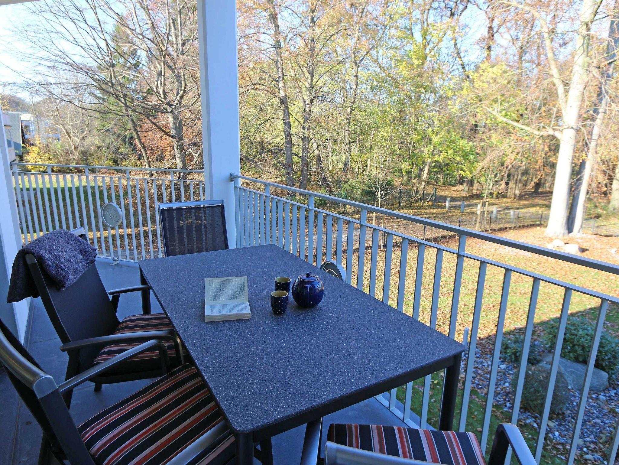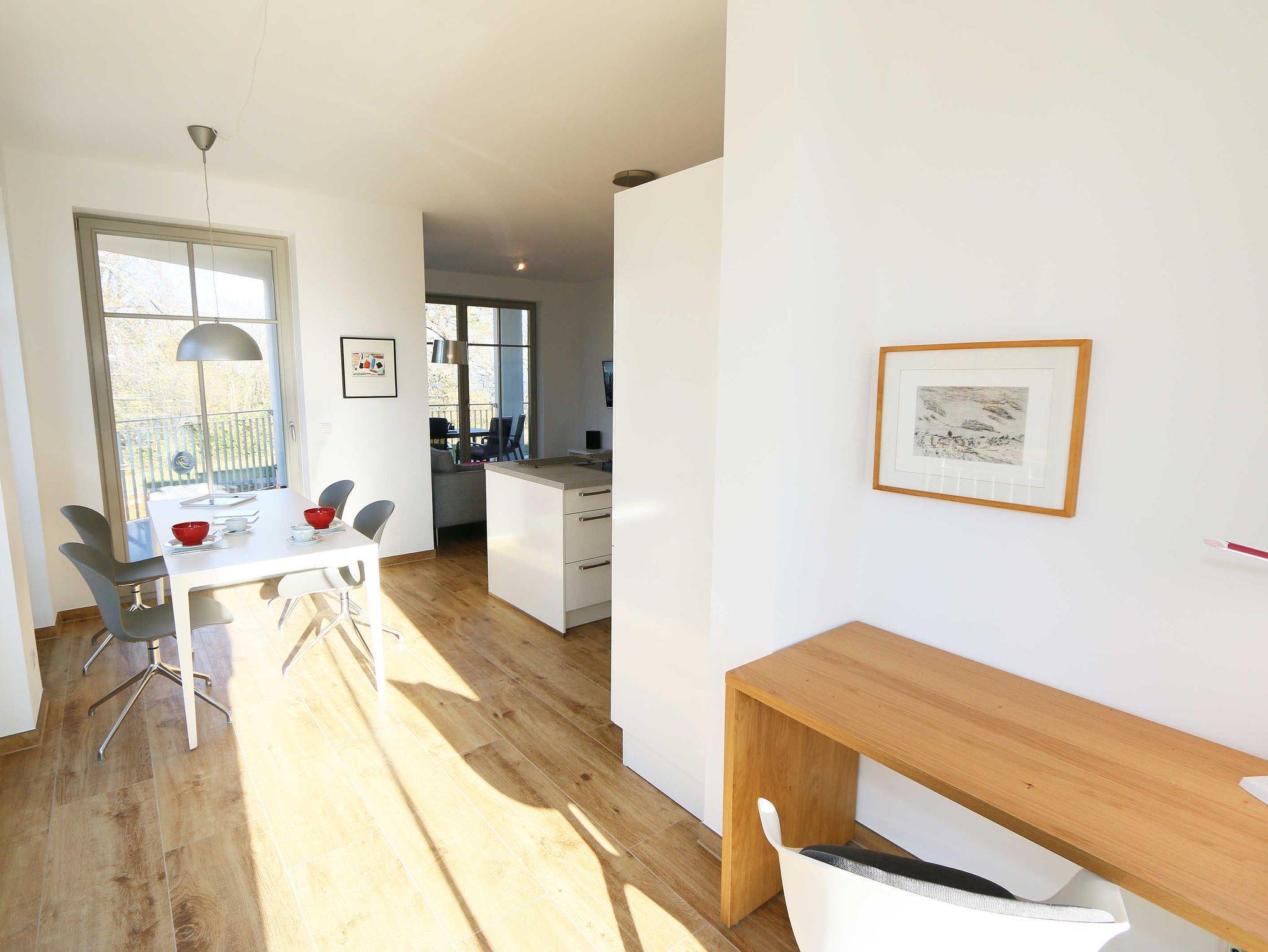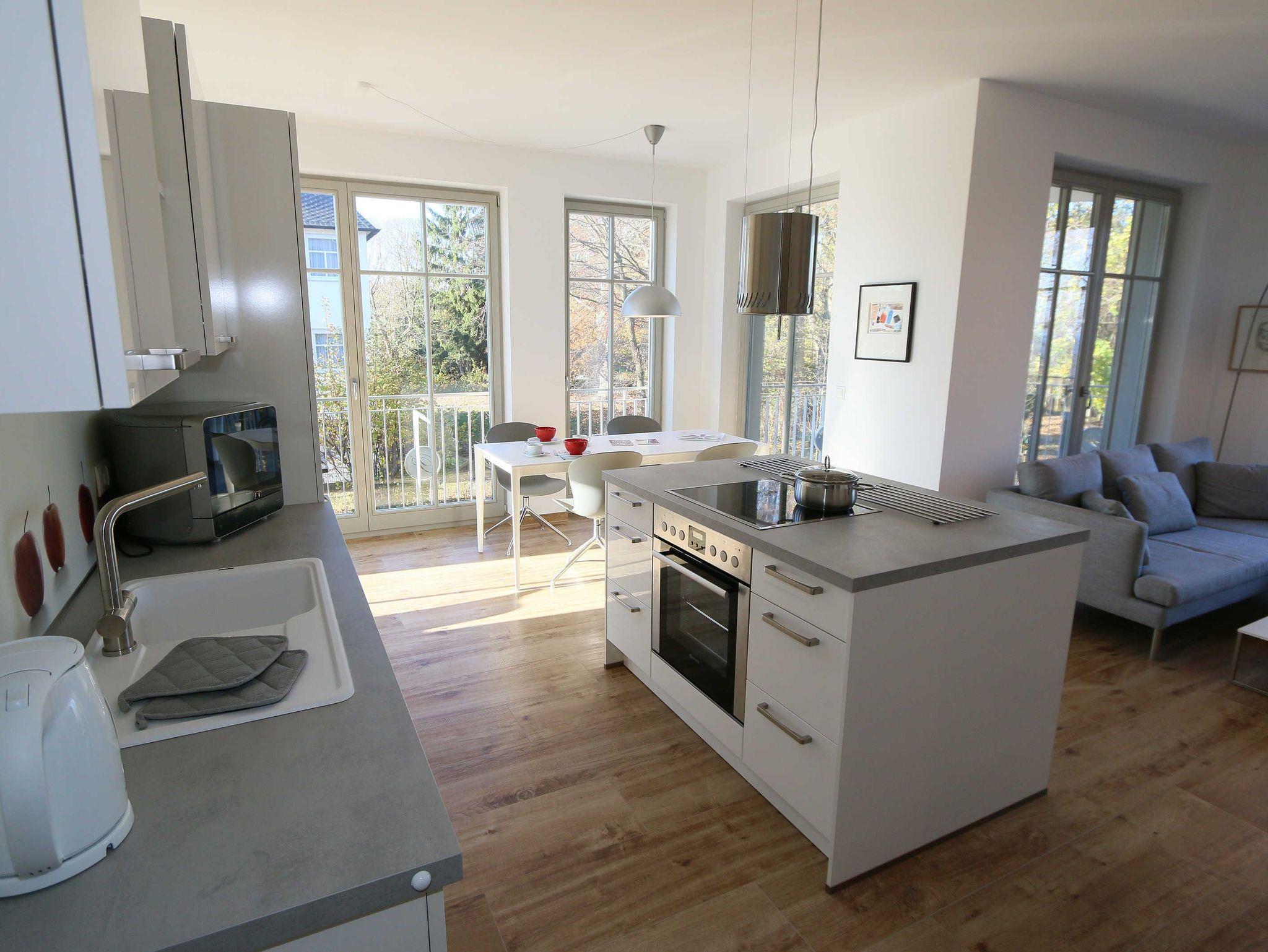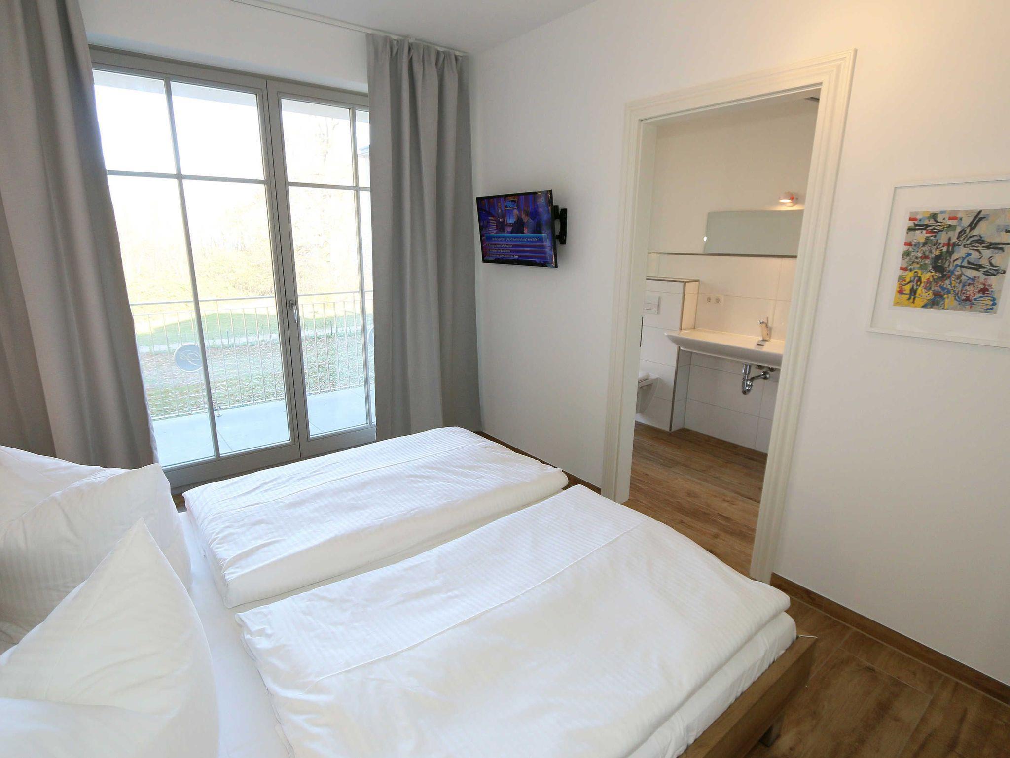 Die Ferienwohnung (Nichtraucher) hat eine Wohnfläche von ca. 92 m² zuzüglich 28 m² überdachtem Balkon. Die Wohnung ist optimal für max. 4 Erwachsene und 2 Kleinkinder bis zu 3 Jahren im Kinderreisebett ausgestattet. 1x Hochstuhl und 1x Kinderreisebett mit zusätzlicher Matratze ohne Bettinlett stehen Ihnen inklusive zur Verfügung. Die verwendeten Materialien der Wohnung sind exklusiv. Ökologische Gesichtspunkte wurden berücksichtigt, so versorgt Sie die Solartherme mit warmem Wasser und die dreifach verglasten Fenster vermindern den Verbrauch an Wärmeenergie. Die Schallschutz-Eingangstür und der private Vorflur schirmen Sie von den anderen Wohnungen ab. Die Möblierung der Wohnung haben wir der Lage und Architektur angepasst: hell, luftig, offen, modern: genießen Sie die Weite und Leichtigkeit auch im Inneren der Wohnung. Der Wohn-/Essbereich ist überwiegend in dänischem Design gestaltet. Technisch ist das Wohnzimmer mit einem Smart-TV, einem Blu-Ray-Player, einer Stereoanlage mit Anschlussmöglichkeit für Android oder I-Phone via Bluetooth sowie DAB-Radio und einem Internetanschluss (WLAN) ausgestattet. In der kalten Jahreszeit sorgt ein Kamin (mit Seitenscheiben für Rundumblick auf die Flammen) für eine angenehme Atmosphäre. Ein Schreibtisch, ein Lesesessel, eine Leselampe und eine komfortable Couchecke runden den Wohnbereich ab. Die helle Küche mit Kochinsel, offen zum Wohnbereich, ist vollwertig ausgestattet mit Geschirrspüler, Kühlschrank, Gefrierschrank, Backofen, 4-Zonen-Cerankochfeld, Mikrowelle, Kaffeemaschine, Toaster, Wasserkocher, Nespresso-Maschine, Mixer und French Press. Ein großer Esstisch lädt zum gemeinsamen Essen ein. Für den erholsamen Schlaf erwarten Sie im en-suite Schlafzimmer ein bequemes Komfort-Doppelbett (1,80 m x 2,00 m) mit hochwertigen Matratzen und verstellbaren Lattenrosten, ein Kleiderschrank, Nachttische und Wecker. Das 2.Schlafzimmer ist identisch ausgestattet, mit dem Unterschied, dass zwei Einzelbetten (je 0,90 m x 2,00 m) Ihrem geruhsamen Schlaf dienen. Die Betten sind leicht beweglich und können zusammen oder getrennt gestellt werden. Beide Schlafzimmer können bei Bedarf vollständig verdunkelt werden und verfügen zusätzlich über je einen Smart-TV. Auf die Balkone gelangen Sie vom Wohn-/Essbereich sowie beiden Schlafzimmern. Die Balkone (Nord/West & Süd/West) sind mit hochwertigem Esstisch und Stühlen sowie Liegestühlen ausgestattet, ergänzt durch eine Lounge-Ecke. Das große Wellness-Bad mit Sauna, freistehender Badewanne, bodengleicher Dusche, WC, Waschtisch, Kosmetikspiegel, elektrisch beheizbarem Handtuchhalter, Smart-TV und Fön lässt keine Wünsche offen. Das kleine Bad verfügt über eine bodengleiche Dusche, WC und Waschtisch. In den beiden Abstellräumen finden Sie eine Waschmaschine, einen Trockner, sowie Bügeleisen und -brett. Die Fußbodenheizung ist pro Raum individuell regelbar. Im abschließbaren Nebengebäude können Sie Ihre Fahrräder sicher unterstellen. Der PKW kann auf den kostenfreien Stellplatz Nr. 05 direkt vor dem Haus geparkt werden. Haustiere sind nicht erlaubt. Die Erstausstattung eines Wäschepaketes (komplette Bettwäsche, 1 Duschhandtuch, 2 kleine Handtücher) können Sie bis 14 Tage vor Anreise gegen einen Aufpreis dazu buchen oder durch eigene ergänzen. Ab 2 gebuchten Paketen erhalten Sie einmalig 1 Geschirrhandtuch und 1 Duschvorleger hinzu.