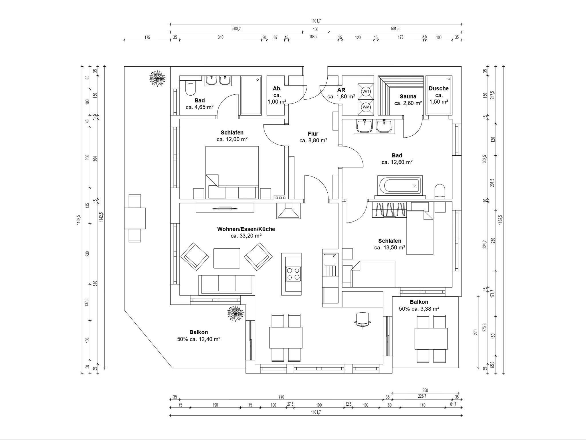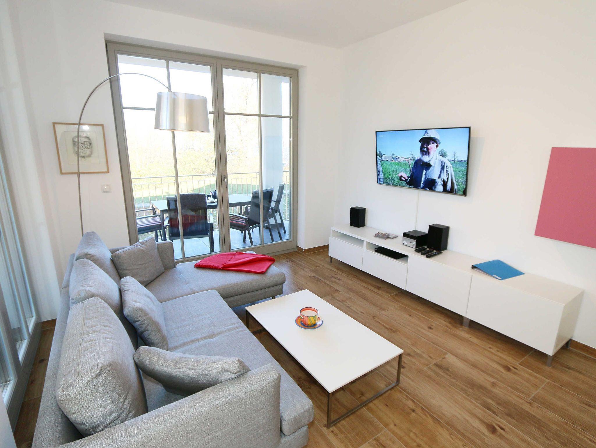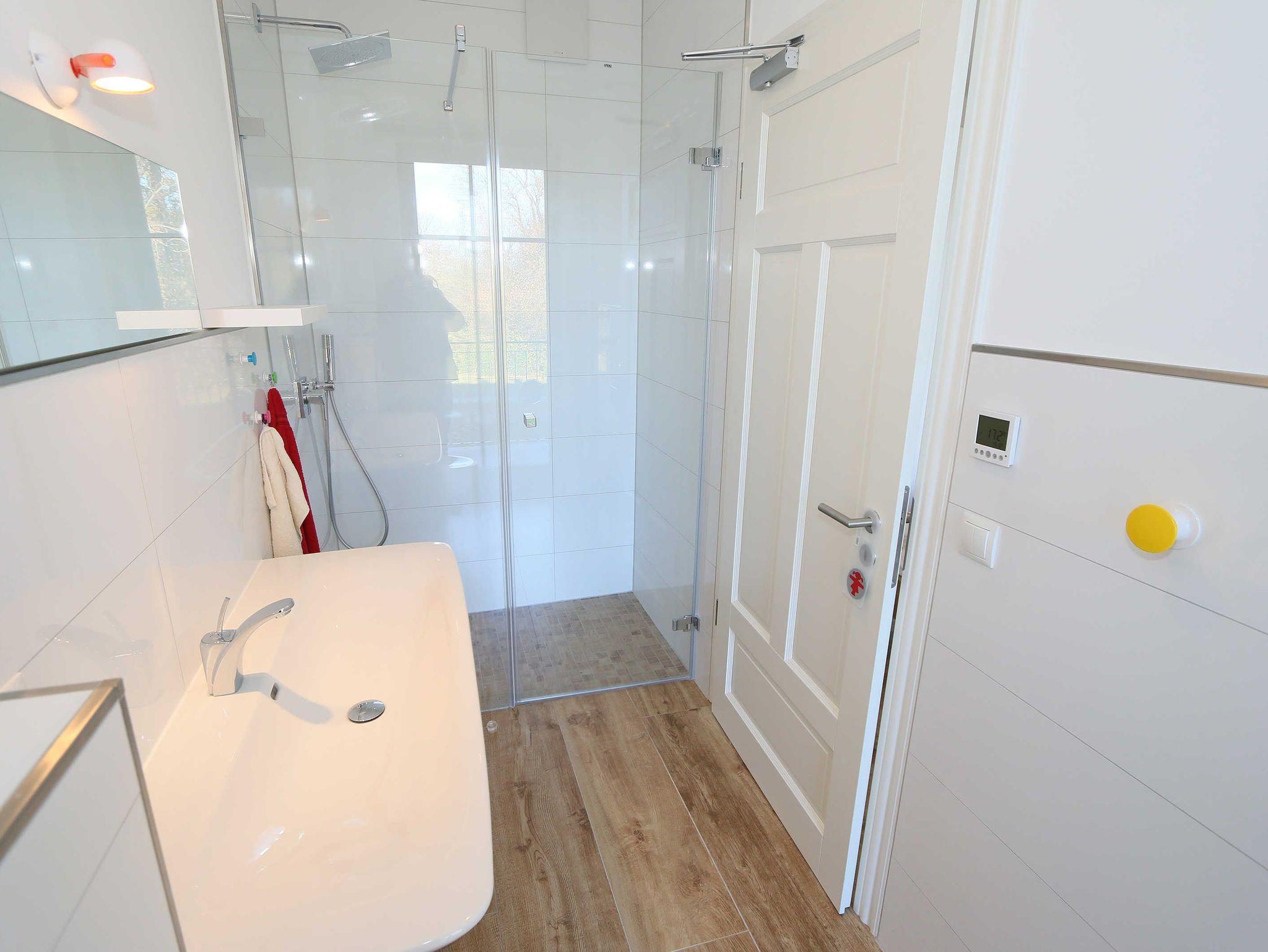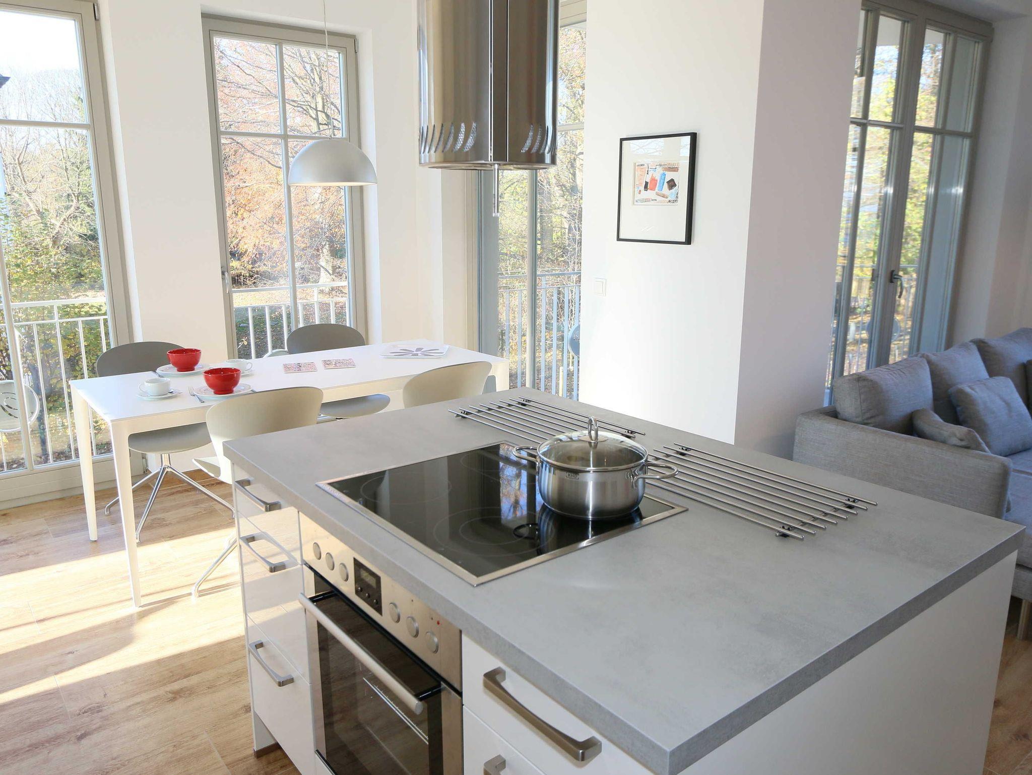 Die Ferienwohnung (Nichtraucher) hat eine Wohnfläche von ca. 92 m² zuzüglich 28 m² überdachtem Balkon. Die Wohnung ist optimal für max. 4 Erwachsene und 2 Kleinkinder bis zu 3 Jahren im Kinderreisebett ausgestattet. 1x Hochstuhl und 1x Kinderreisebett mit zusätzlicher Matratze ohne Bettinlett stehen Ihnen inklusive zur Verfügung. Die verwendeten Materialien der Wohnung sind exklusiv. Ökologische Gesichtspunkte wurden berücksichtigt, so versorgt Sie die Solartherme mit warmem Wasser und die dreifach verglasten Fenster vermindern den Verbrauch an Wärmeenergie. Die Schallschutz-Eingangstür und der private Vorflur schirmen Sie von den anderen Wohnungen ab. Die Möblierung der Wohnung haben wir der Lage und Architektur angepasst: hell, luftig, offen, modern: genießen Sie die Weite und Leichtigkeit auch im Inneren der Wohnung. Der Wohn-/Essbereich ist überwiegend in dänischem Design gestaltet. Technisch ist das Wohnzimmer mit einem Smart-TV, einem Blu-Ray-Player, einer Stereoanlage mit Anschlussmöglichkeit für Android oder I-Phone via Bluetooth sowie DAB-Radio und einem Internetanschluss (WLAN) ausgestattet. In der kalten Jahreszeit sorgt ein Kamin (mit Seitenscheiben für Rundumblick auf die Flammen) für eine angenehme Atmosphäre. Ein Schreibtisch, ein Lesesessel, eine Leselampe und eine komfortable Couchecke runden den Wohnbereich ab. Die helle Küche mit Kochinsel, offen zum Wohnbereich, ist vollwertig ausgestattet mit Geschirrspüler, Kühlschrank, Gefrierschrank, Backofen, 4-Zonen-Cerankochfeld, Mikrowelle, Kaffeemaschine, Toaster, Wasserkocher, Nespresso-Maschine, Mixer und French Press. Ein großer Esstisch lädt zum gemeinsamen Essen ein. Für den erholsamen Schlaf erwarten Sie im en-suite Schlafzimmer ein bequemes Komfort-Doppelbett (1,80 m x 2,00 m) mit hochwertigen Matratzen und verstellbaren Lattenrosten, ein Kleiderschrank, Nachttische und Wecker. Das 2.Schlafzimmer ist identisch ausgestattet, mit dem Unterschied, dass zwei Einzelbetten (je 0,90 m x 2,00 m) Ihrem geruhsamen Schlaf dienen. Die Betten sind leicht beweglich und können zusammen oder getrennt gestellt werden. Beide Schlafzimmer können bei Bedarf vollständig verdunkelt werden und verfügen zusätzlich über je einen Smart-TV. Auf die Balkone gelangen Sie vom Wohn-/Essbereich sowie beiden Schlafzimmern. Die Balkone (Nord/West & Süd/West) sind mit hochwertigem Esstisch und Stühlen sowie Liegestühlen ausgestattet, ergänzt durch eine Lounge-Ecke. Das große Wellness-Bad mit Sauna, freistehender Badewanne, bodengleicher Dusche, WC, Waschtisch, Kosmetikspiegel, elektrisch beheizbarem Handtuchhalter, Smart-TV und Fön lässt keine Wünsche offen. Das kleine Bad verfügt über eine bodengleiche Dusche, WC und Waschtisch. In den beiden Abstellräumen finden Sie eine Waschmaschine, einen Trockner, sowie Bügeleisen und -brett. Die Fußbodenheizung ist pro Raum individuell regelbar. Im abschließbaren Nebengebäude können Sie Ihre Fahrräder sicher unterstellen. Der PKW kann auf den kostenfreien Stellplatz Nr. 05 direkt vor dem Haus geparkt werden. Haustiere sind nicht erlaubt. Die Erstausstattung eines Wäschepaketes (komplette Bettwäsche, 1 Duschhandtuch, 2 kleine Handtücher) können Sie bis 14 Tage vor Anreise gegen einen Aufpreis dazu buchen oder durch eigene ergänzen. Ab 2 gebuchten Paketen erhalten Sie einmalig 1 Geschirrhandtuch und 1 Duschvorleger hinzu.