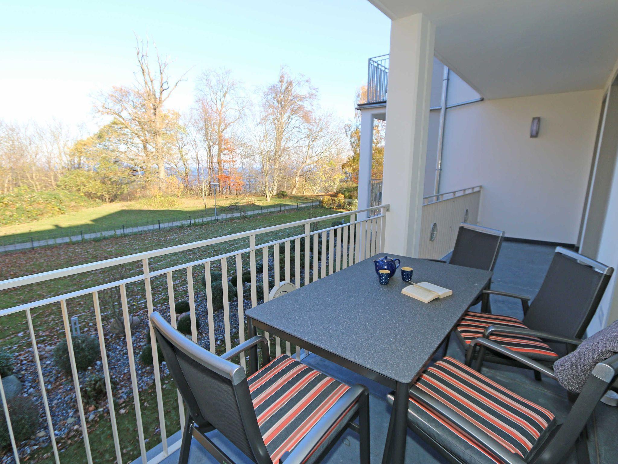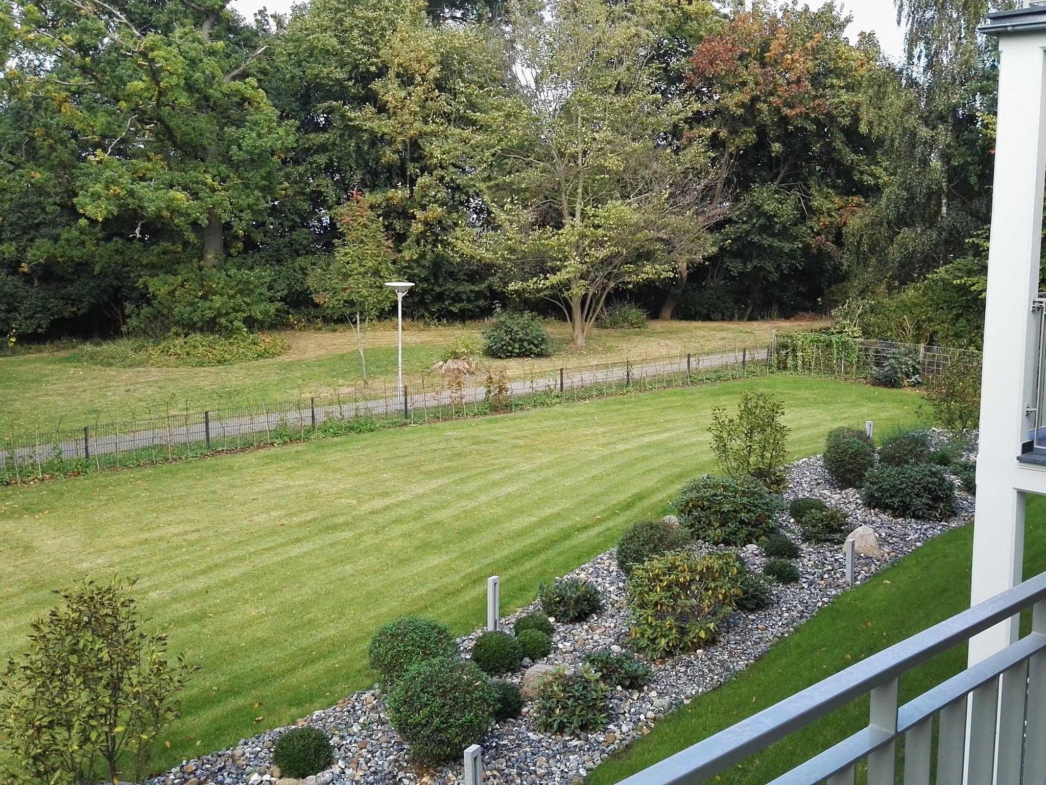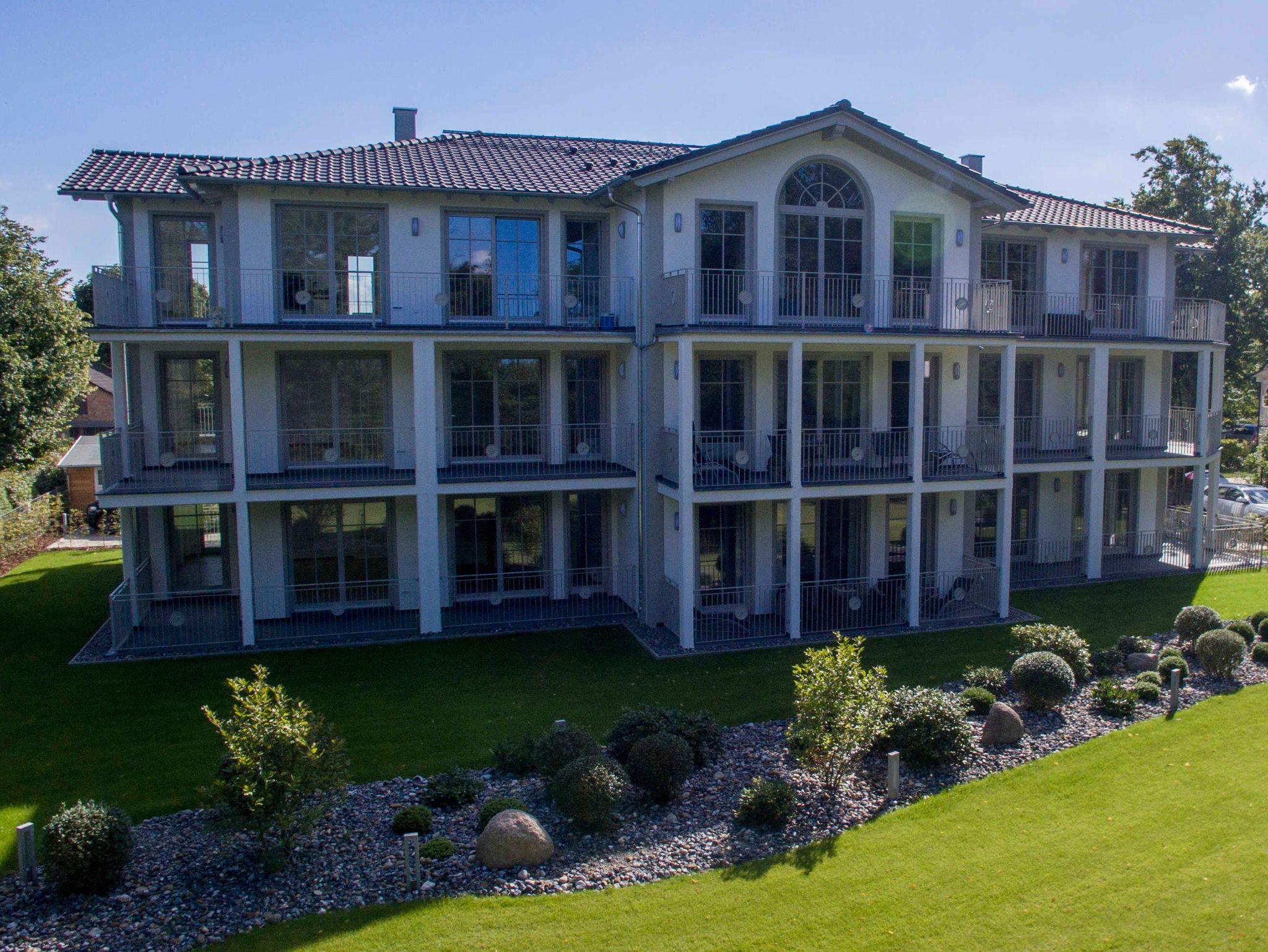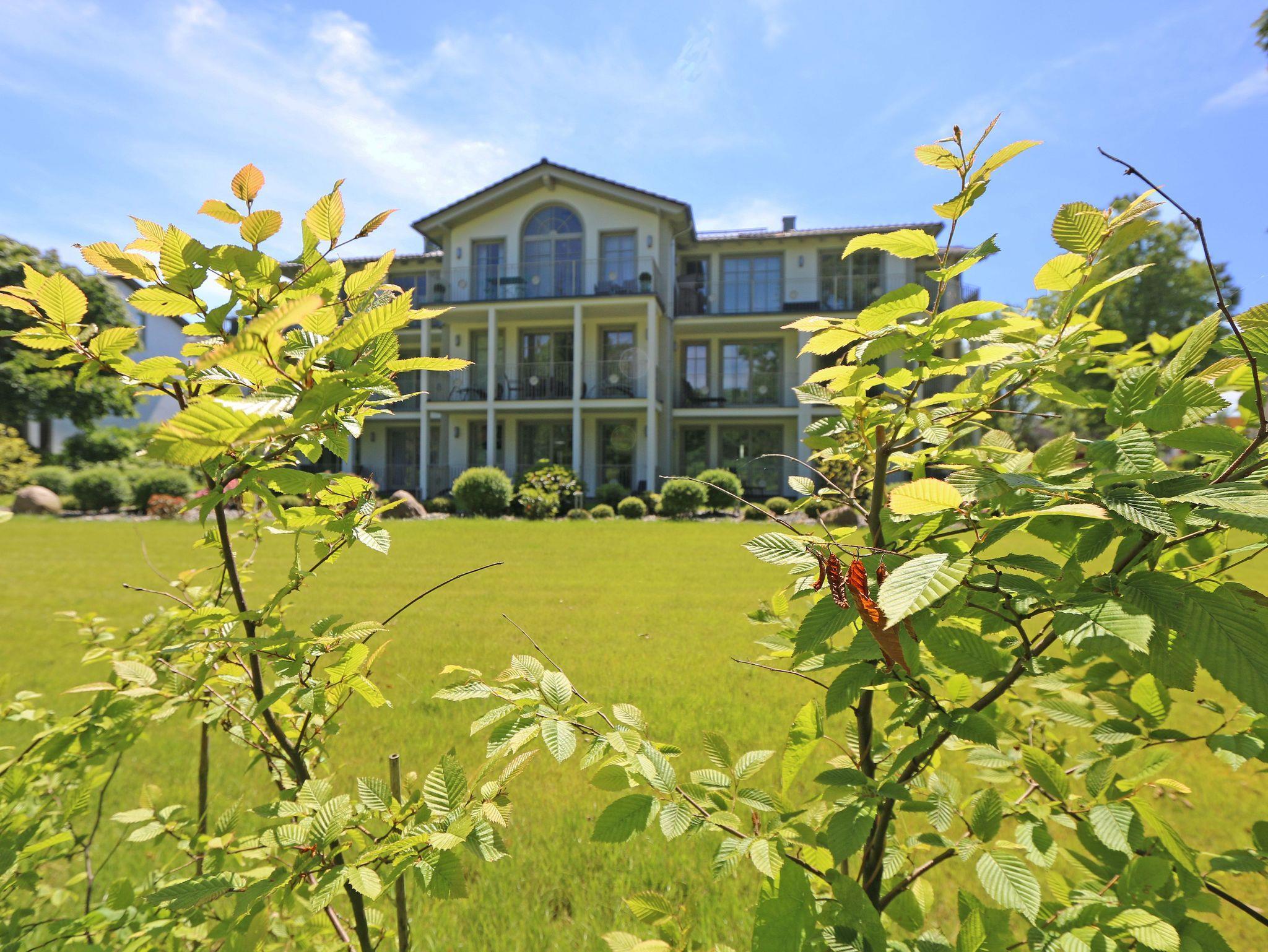 Göhren ist außergewöhnlich: Göhren hat Weitblick, denn es liegt auf einer Anhöhe inmitten eines Naturreservats mit Buchenwäldern am Hochufer, langen weißen Sandstränden, schroffen Steilküsten und der malerischen weiten Landschaft der Halbinsel Mönchgut. Diesen Weitblick fangen die Lage und die Architektur der Villa Pauline auf. Die Villa umfasst 9 Wohnungen auf einem ca. 2000 m² großen Grundstück mit einem exklusiven Garten. Sie liegt in einer exponierten und ruhigen Hochuferlage, als letztes Haus einer Stichstraße. Die Wohnung 5 im Obergeschoss ist über den Fahrstuhl erreichbar. Sie verfügt in allen Zimmern und Bädern über große bodentiefe Fenster. Licht und Weite werden eingefangen. Von dem großen Nord-West- Balkon und vielen Zimmern blicken Sie direkt auf den Garten und den dahinterliegenden Buchenwald, der im Herbst bunt leuchtet. Im Winter und Frühjahr (mit Glück auch in der übrigen Zeit) ist der Blick frei auf das Meer: Sie hören es rauschen. Der kleinere Süd-West-Balkon lädt zum Sonnen ein. Zum feinen flach abfallenden kilometerlangen Sandstrand gelangen Sie in wenigen Minuten und bei Bedarf ganz bequem über einen gläsernen Fahrstuhl. Die Ortsmitte mit Supermarkt, Sparkasse, Bäcker, kleinen Boutiquen und Restaurants ist in wenigen Metern fußläufig zu erreichen. Wanderwege und Radwege schließen an das Villengrundstück an. Fernbus- und Kleinbahn enden unterhalb des Hochuferwaldes.