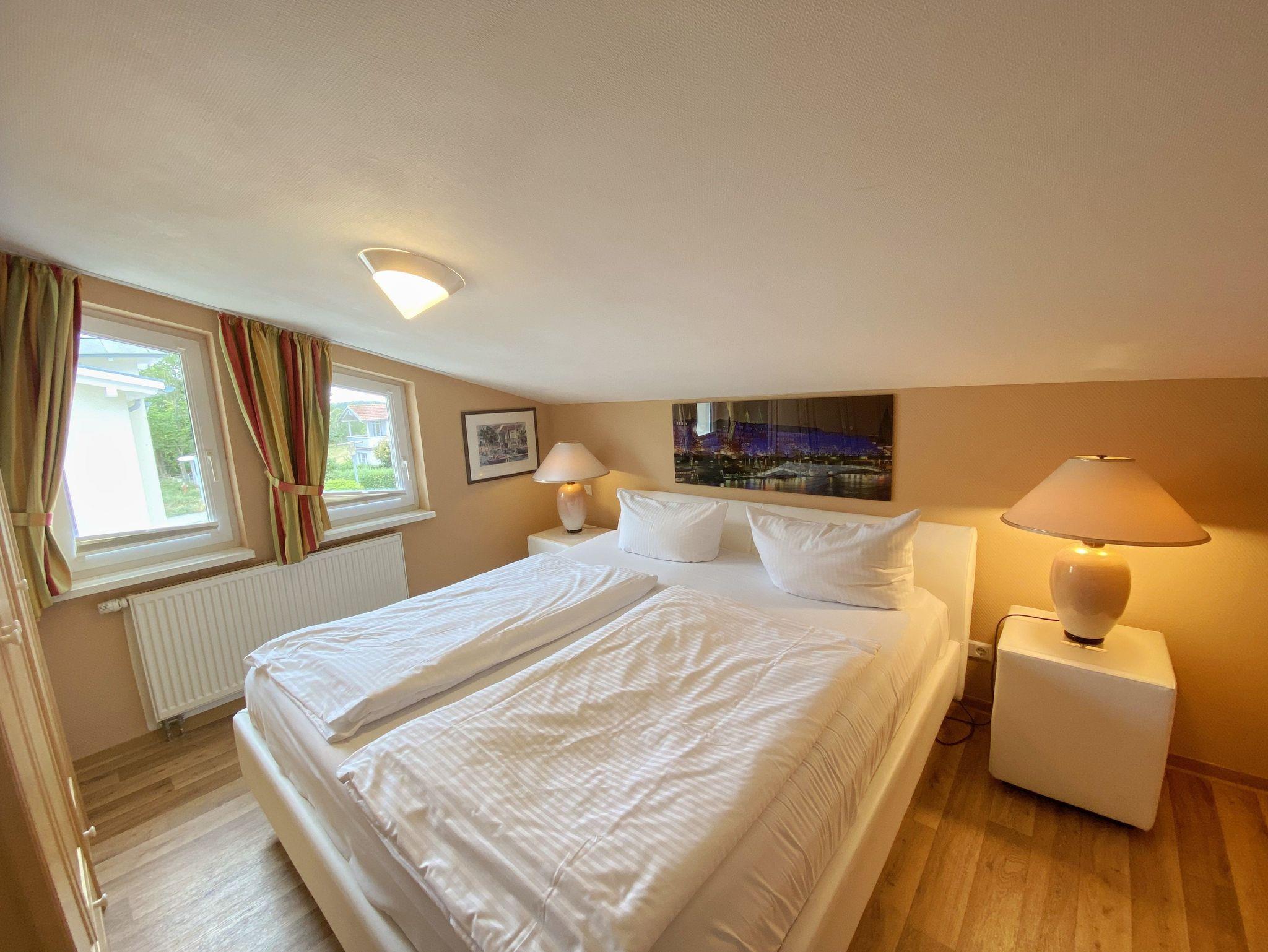 Die ca.64 m² große 3-Raum-Nichtraucherwohnung befindet sich in der 2.Etage und bietet Ihnen vom überdachten und bestuhlten Balkon (Süd) einen herrlichen Blick auf die Ostsee und die Halbinsel Mönchgut. Hier finden max. 4 Erwachsene Platz. Der großzügige und helle Wohn- und Essbereich ist, sowie alle anderen Räumlichkeiten liebevoll dekoriert und ausgestattet. Eine bequeme Ledercouch, ein Lesesessel mit Hocker, ein Couchtisch, ein TV-Board mit Flachbild-TV, ein WLAN-Zugang, einer Musikanlage und Urlaubslektüre runden den gemütlichen Wohnbereich ab. Von hier gelangen Sie auf Ihren Balkon, wo Sie einen einmaligen Blick auf die Ostsee sowie auf die Halbinsel Mönchgut haben. Ein Esstisch mit Stühlen und Beistelltisch sowie ein Sideboard komplettiert die offene Küchenzeile, in der sich ein Backofen mit Cerankochfeld mit Abzugshaube, eine Mikrowelle, ein Kühlschrank mit Gefrierfach, ein Geschirrspüler, eine Kaffeemaschine, ein Wasserkocher und ein Toaster befindet. Das große Schlafzimmer verfügt über ein Doppelbett (1,80m x 2,00m), mit Nachttischablagen und Beleuchtung, einem Kleiderschrank, einem Sideboard sowie ein TV. Im kleineren Schlafzimmer befindet sich ein französisches Doppelbett (1,60m x 2,00m) mit einer Nachttischablage und Beleuchtung und ein Kleiderschrank. Verdunkelungsgardinen und Insektenschutz sind zusätzliche in beiden Schlafzimmern vorhanden. Das geflieste Tageslichtbad verfügt über eine ebenerdige Dusche, ein WC, ein Fön, ein Kosmetikspiegel sowie ein Waschtisch. Im kleinen Abstellraum befinden sich Reinigungsutensilien, ein Bügelbrett und ein Bügeleisen sowie ein Wäscheständer und ein Staubsauger. Eine abschließbare Fahrradabstellmöglichkeit ist vorhanden. In einem separaten Raum (in der Anlage) besteht die Möglichkeit eine Waschmaschine und ein Trockner (kostenpflichtig) zu nutzen. Haustiere sind nicht erlaubt. Ein PKW-Stellplatz (Nr.41) ist für Sie inklusive. Die Erstausstattung eines Wäschepaketes (komplette Bettwäsche, 1 Duschhandtuch, 1 kleines Handtuch) können Sie bis 14 Tage vor Anreise gegen einen Aufpreis dazu buchen oder durch Eigenes ergänzen. Ab 2 gebuchten Paketen erhalten Sie einmalig 1 Geschirrhandtuch und 1 Duschvorleger hinzu.