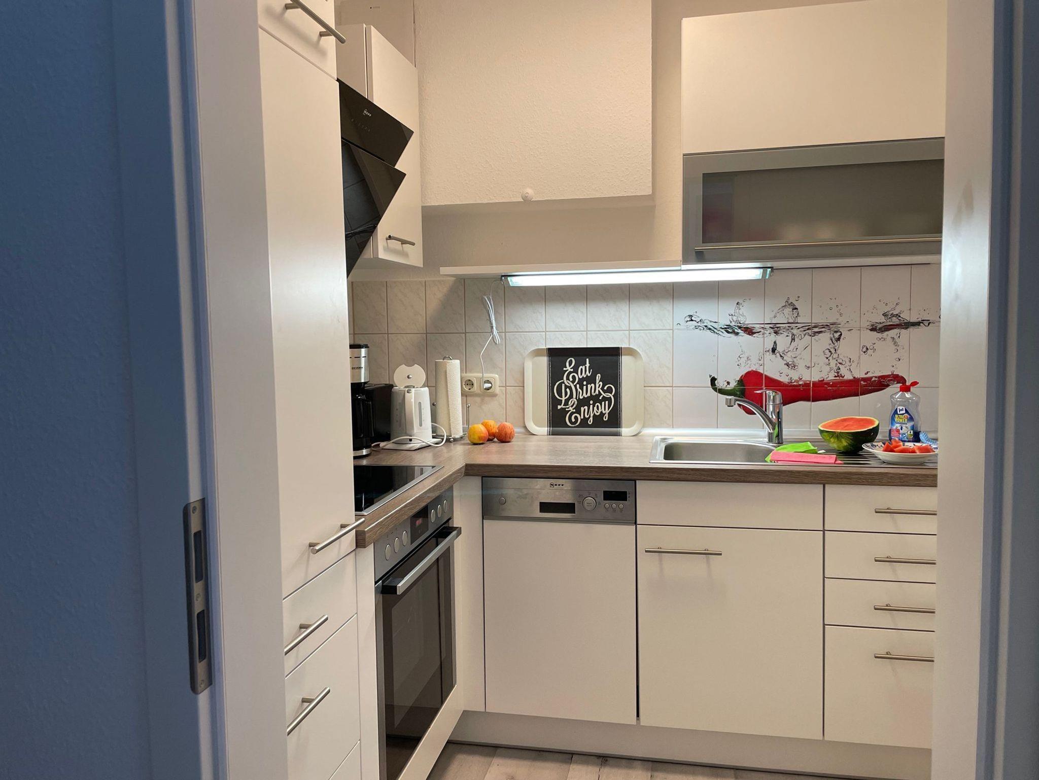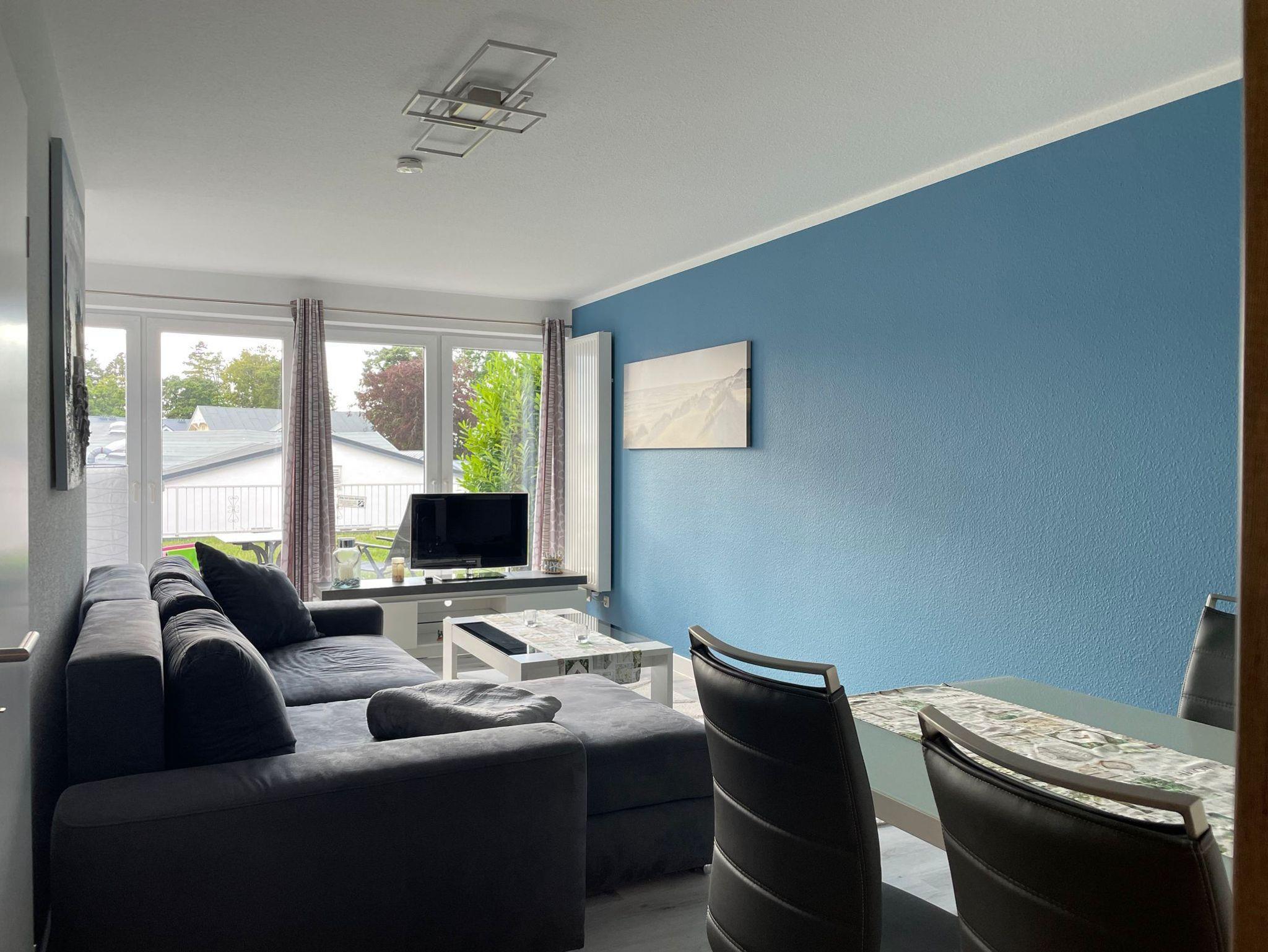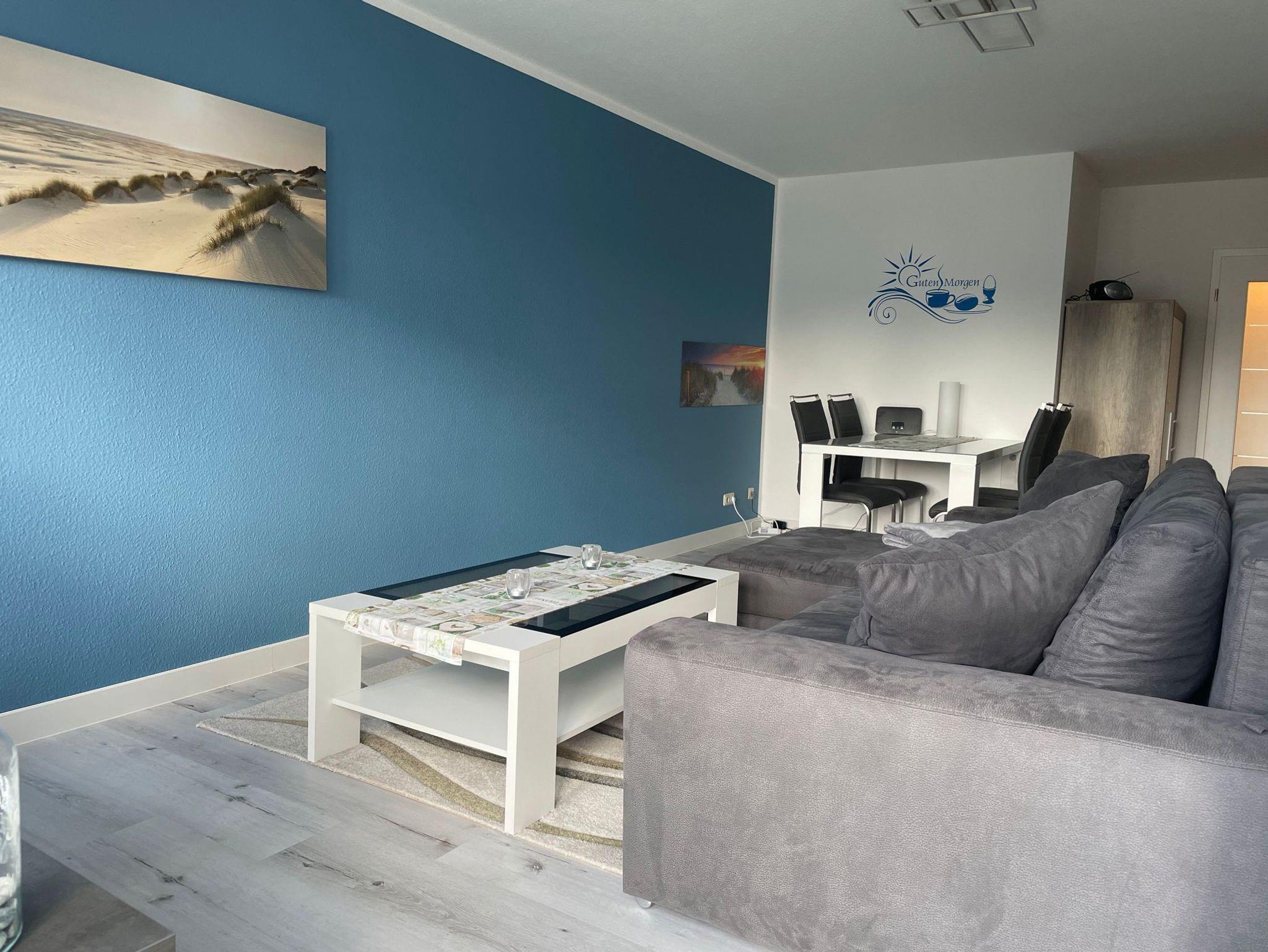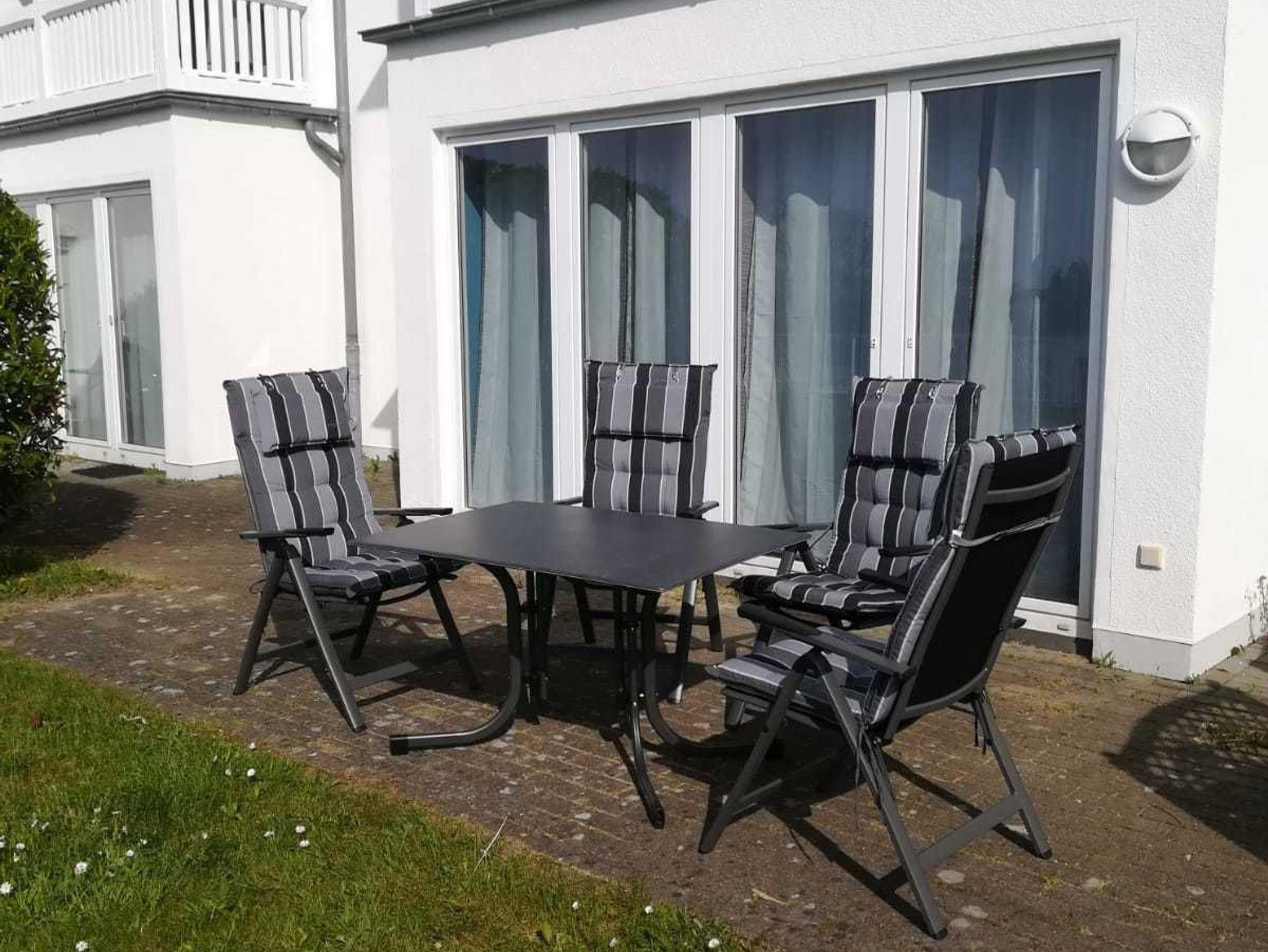 Die bis Mai 2019 komplett sanierte Fewo ist ca. 50 m² groß und für 4 Personen ausgestattet. Sie liegt im Parterre und verfügt über eine Terrasse. Die Wohnung ist hell, modern und freundlich ausgestattet. Die Wohnung beteht aus einem Schlafzimmer mit Boxspringbett (1,60x2,00m) und Kleiderschrank - Platz für ein Kinderbett wäre vorhanden (kann zusätzlich für 8,40 €/Woche gemietet werden), einem Wohnzimmer mit Sitzecke (Dauerschläfercouch in Boxspringausführung 1,60x2,20m), TV und Ausgang zur möblierten Terrasse, kleiner komplett eingerichteten Küche und Bad mit Dusche/WC. Bettwäsche und Handtücher sind bei einem Buchungszeitraum ab 10 Nächten inklusive, darunter kann Wäsche nur im Vorfeld (vor dem Anreisetag) gemietet werden. Ein PKW-Stellplatz befindet sich auf dem Nachbargrundstück.