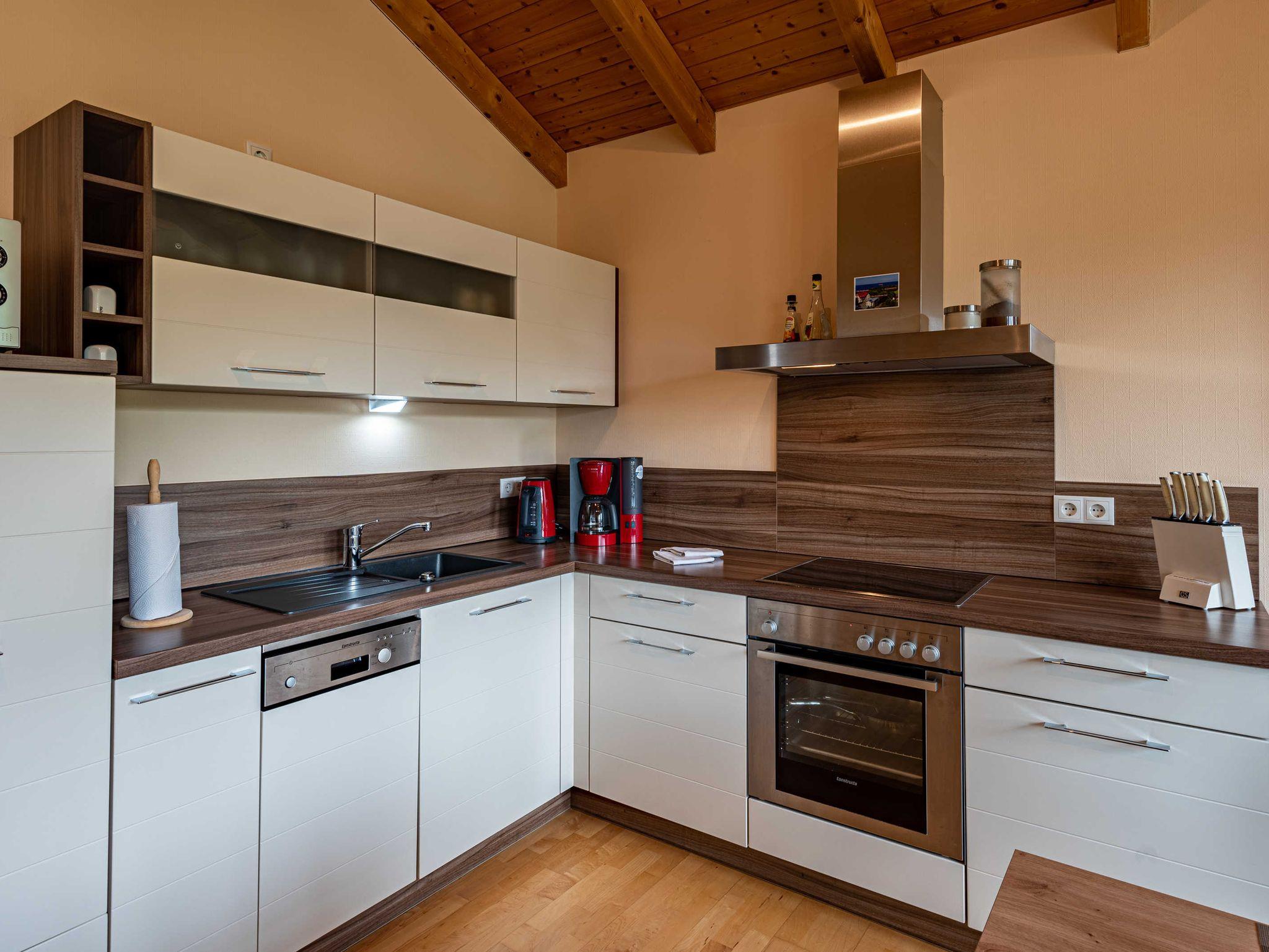 Küchenzeile mit Cerankochfeld, Backofen, Spülmaschine, Kühlschrank mit Gefrierfach, Mikrowelle,