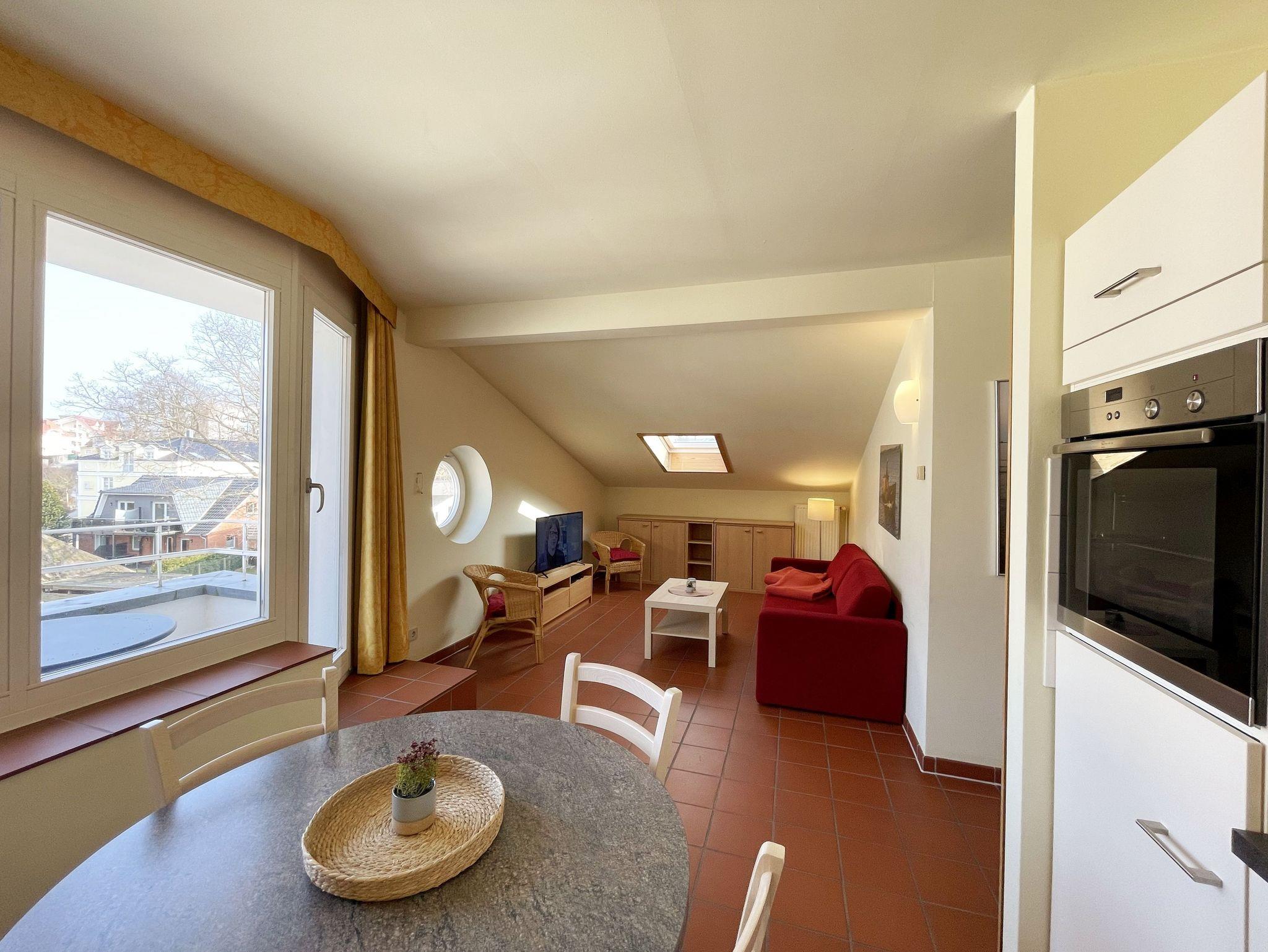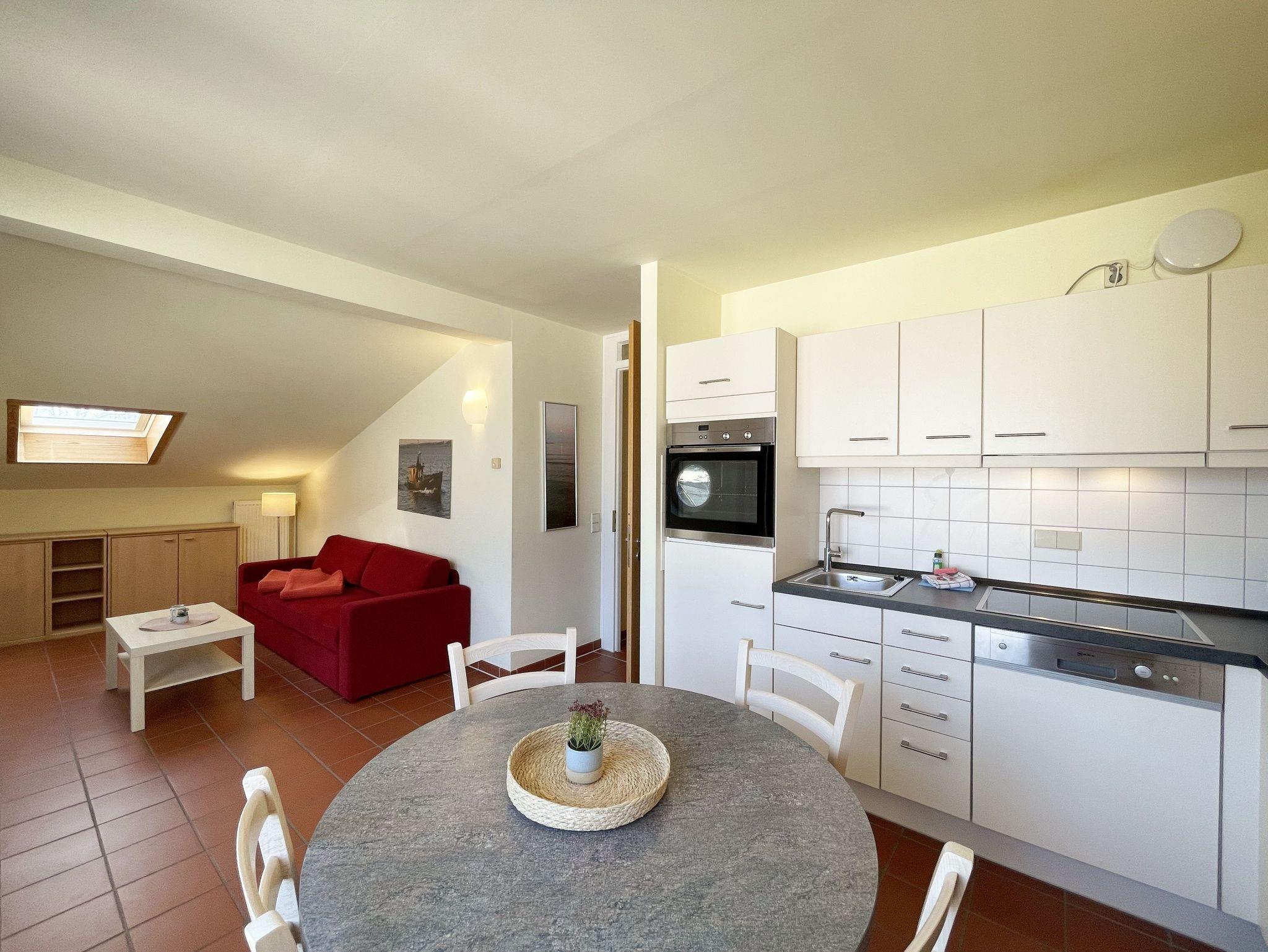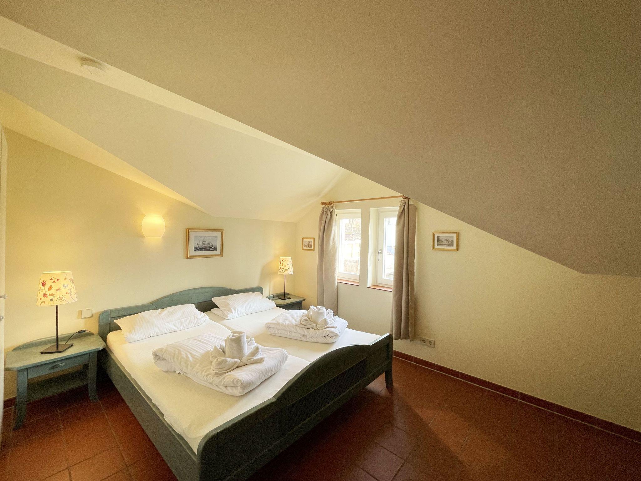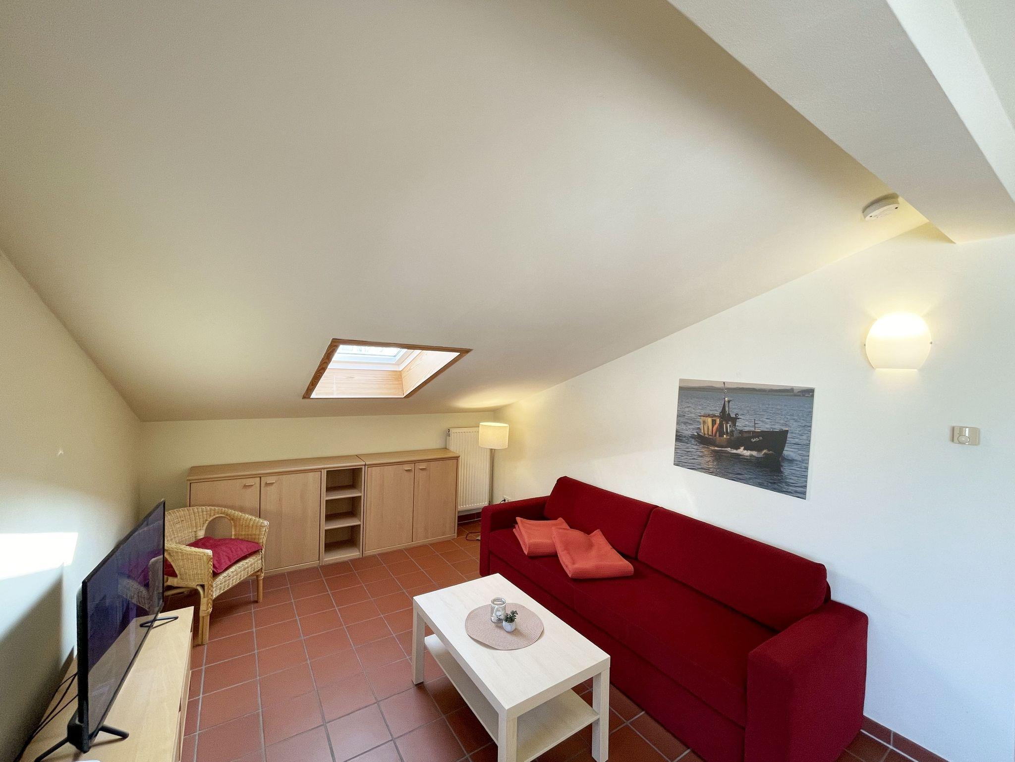Die geräumige, nach Süd-Ost ausgerichtete 2-Zimmerwohnung ist etwa 40 qm groß und befindet sich im Dachgeschoss Das Appartement ist für 2 bis 4 Personen geeignet. Im Wohnbereich finden Sie eine komfortable Schlafcouch (1,60m x 2,00m), einen LED-Fernseher, einen Essplatz für 4 Personen sowie die Küchenzeile. Sie ist mit Cerankochfeld, Spülmaschine, Backofen, Kaffeemaschine, Wasserkocher, Toaster, Kühlschrank mit Eisfach und allen wichtigen Küchenutensilien ausgestattet. An den Wohnbereich grenzt die nach Osten gerichtete, bestuhlte Loggia. Das gemütliche Schlafzimmer verfügt über ein Doppelbett (2 x 0,90 x 2,00 m) mit 7-Zonen-Matratzen, einen Kleiderschrank und eine Spiegelkommode. Das Bad ist mit WC, Waschbecken und Föhn ausgestattet. Die geräumige Dusche ist ebenerdig zu begehen und mit Glaswänden abgetrennt. In der kühleren Jahreszeit wärmt die angenehme Fußbodenheizung in allen Räumen den Terracottaboden. Auch im Urlaub brauchen Sie auf einen WLAN-Zugang nicht verzichten. Dieser ist für Sie inklusive vorhanden. Ein eigener Stellplatz Nr. 35 für Ihr Fahrzeug befindet sich hinter dem Haus. In einem separaten Raum können mitgebrachte oder geliehene Fahrräder abgeschlossen werden. Auch 1 Vierbeiner ist gegen eine Gebühr ein gern gesehener Gast. Die Erstausstattung eines Wäschepaketes (komplette Bettwäsche, 1 Duschhandtuch, 1 kleines Handtuch) können Sie bis 14 Tage vor Anreise dazu buchen oder durch eigene ergänzen. Ab 2 gebuchten Paketen erhalten Sie einmalig 1 Geschirrhandtuch und 1 Duschvorleger hinzu.