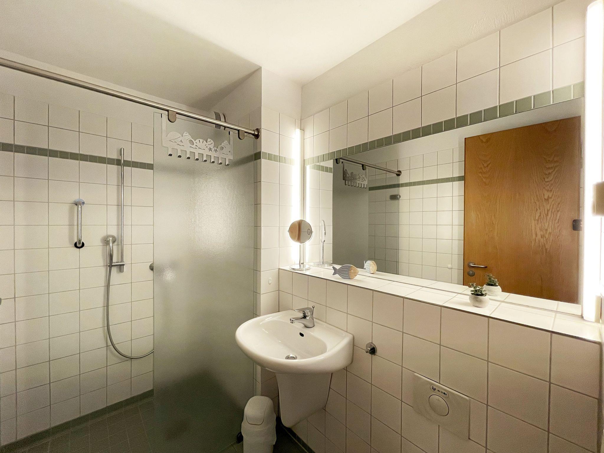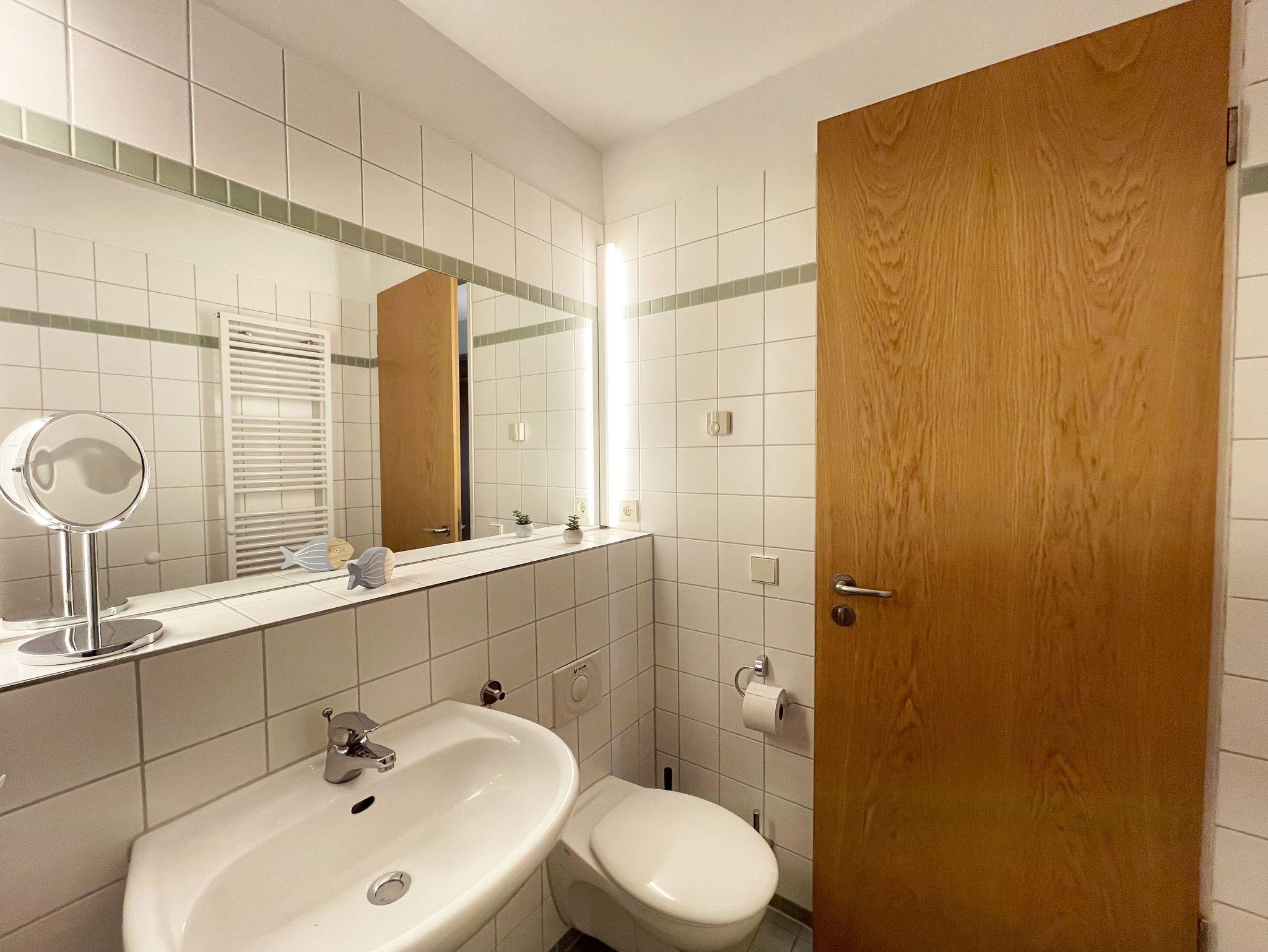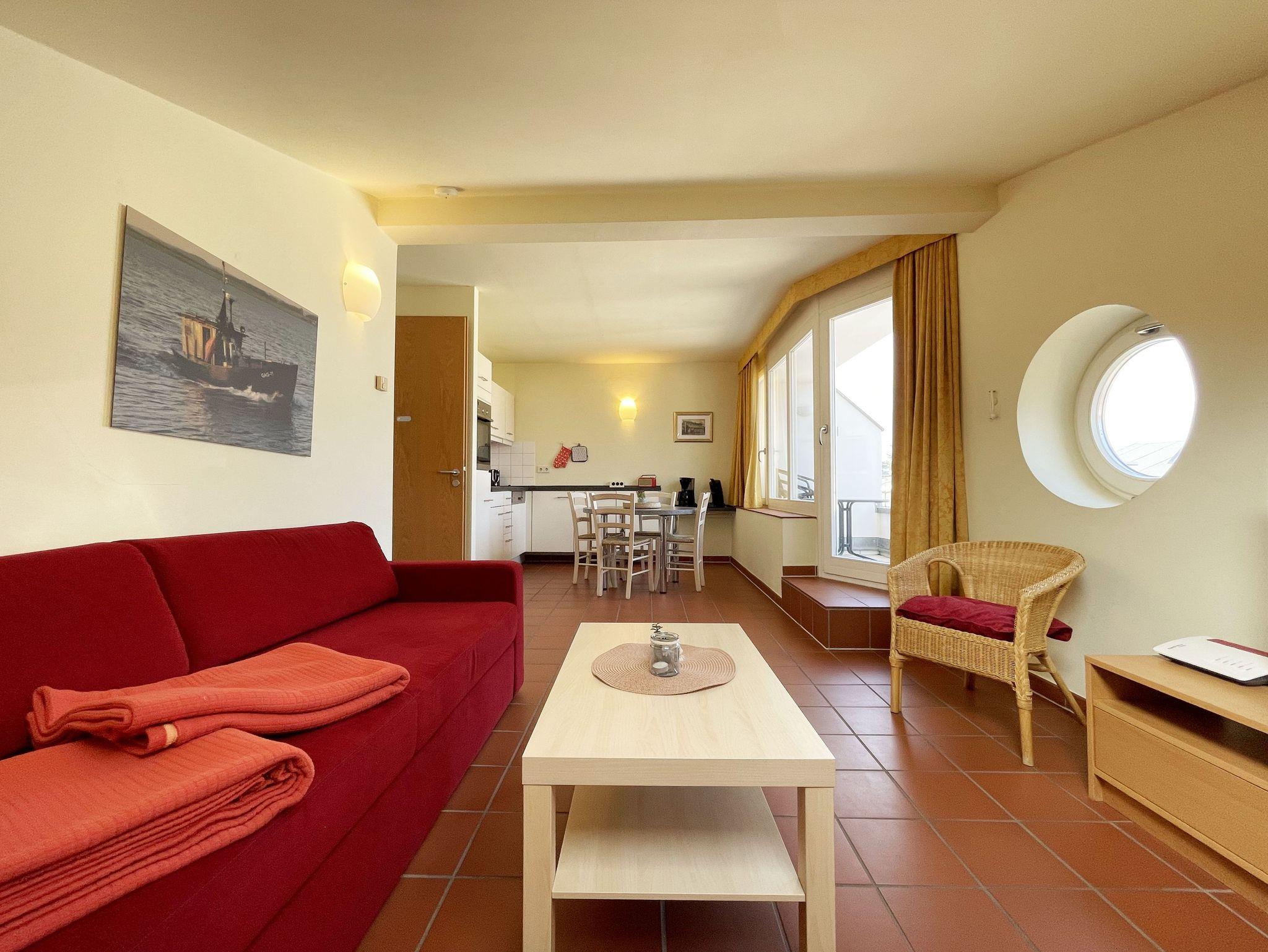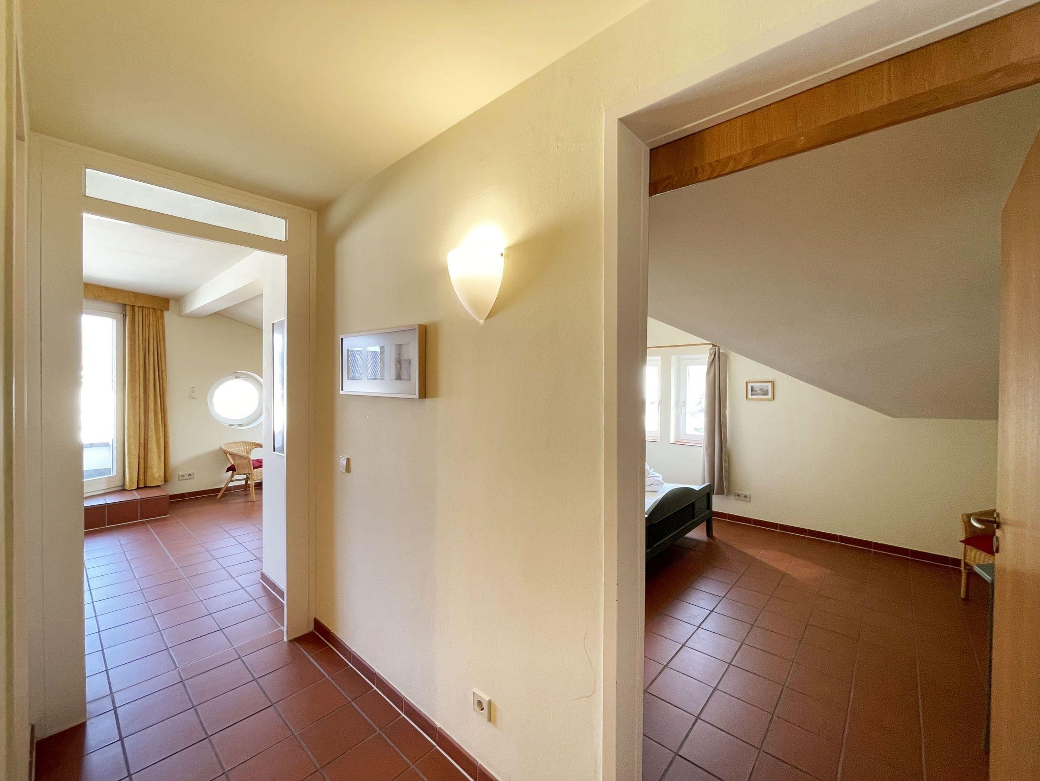 Die geräumige, nach Süd-Ost ausgerichtete 2-Zimmerwohnung ist etwa 40 qm groß und befindet sich im Dachgeschoss Das Appartement ist für 2 bis 4 Personen geeignet. Im Wohnbereich finden Sie eine komfortable Schlafcouch (1,60m x 2,00m), einen LED-Fernseher, einen Essplatz für 4 Personen sowie die Küchenzeile. Sie ist mit Cerankochfeld, Spülmaschine, Backofen, Kaffeemaschine, Wasserkocher, Toaster, Kühlschrank mit Eisfach und allen wichtigen Küchenutensilien ausgestattet. An den Wohnbereich grenzt die nach Osten gerichtete, bestuhlte Loggia. Das gemütliche Schlafzimmer verfügt über ein Doppelbett (2 x 0,90 x 2,00 m) mit 7-Zonen-Matratzen, einen Kleiderschrank und eine Spiegelkommode. Das Bad ist mit WC, Waschbecken und Föhn ausgestattet. Die geräumige Dusche ist ebenerdig zu begehen und mit Glaswänden abgetrennt. In der kühleren Jahreszeit wärmt die angenehme Fußbodenheizung in allen Räumen den Terracottaboden. Auch im Urlaub brauchen Sie auf einen WLAN-Zugang nicht verzichten. Dieser ist für Sie inklusive vorhanden. Ein eigener Stellplatz Nr. 35 für Ihr Fahrzeug befindet sich hinter dem Haus. In einem separaten Raum können mitgebrachte oder geliehene Fahrräder abgeschlossen werden. Auch 1 Vierbeiner ist gegen eine Gebühr ein gern gesehener Gast. Die Erstausstattung eines Wäschepaketes (komplette Bettwäsche, 1 Duschhandtuch, 1 kleines Handtuch) können Sie bis 14 Tage vor Anreise dazu buchen oder durch eigene ergänzen. Ab 2 gebuchten Paketen erhalten Sie einmalig 1 Geschirrhandtuch und 1 Duschvorleger hinzu.