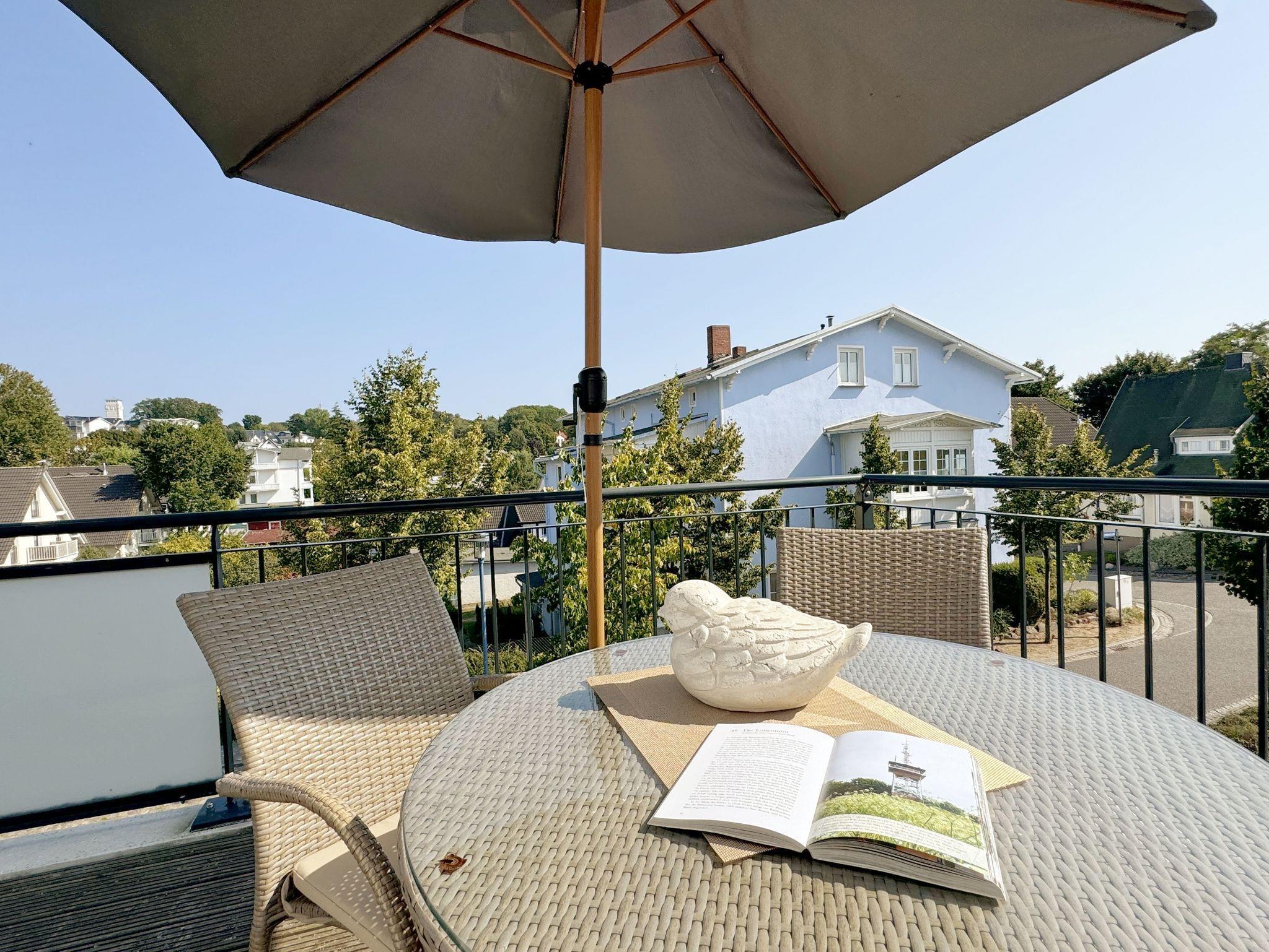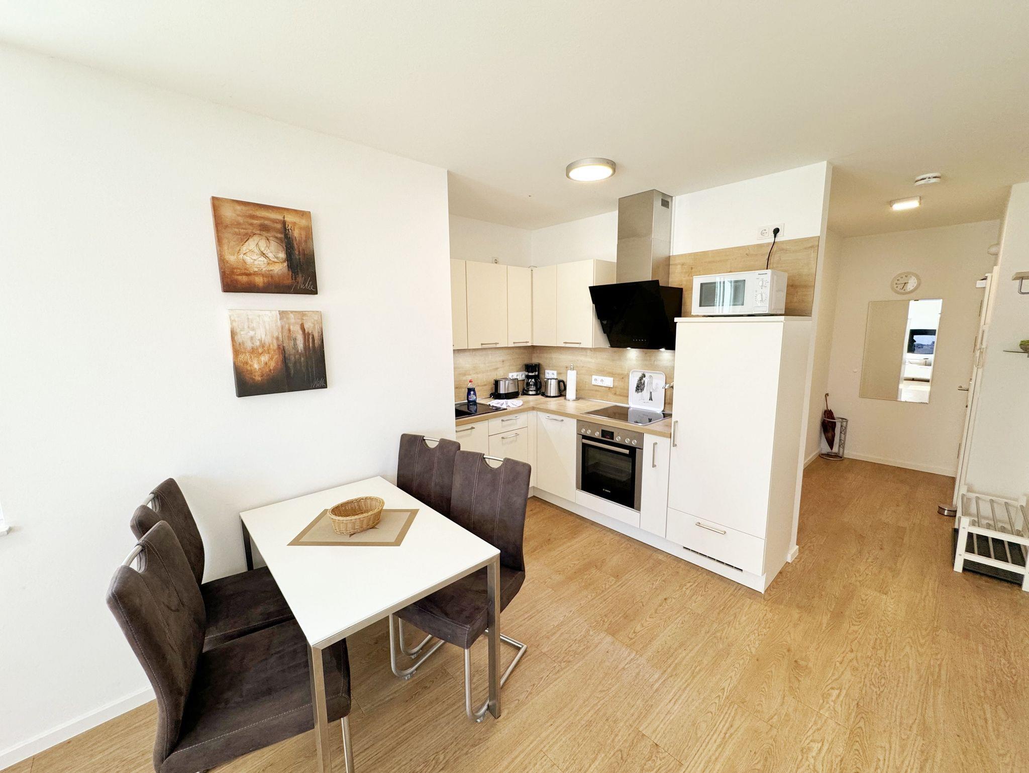 Die Wohnung Nr. 4 der Villa Anni ist eine komfortable, ca. 57 m² große und stilvoll eingerichtete Nichtraucherferienwohnung im ersten Obergeschoss. Sie bietet Ihnen ausreichend Platz für 2 bis 3 Personen. Der kombinierte Wohn-/Koch- und Essbereich mit der modernen und integrierten Küchenzeile lässt mit Ceranfeld, Backofen, Geschirrspüler, Mikrowelle, Kühlschrank mit Gefrierfach, Kaffeemaschine, Wasserkocher, Toaster und diversen Küchenutensilien keine Wünsche offen. Der Essbereich fügt sich der Küchenzeile an. Der offene Wohnbereich verfügt über eine gemütliche Sitzecke (Liegefläche 1,50m x 2,00m) mit Couchtisch, eine Leselampe, ein TV mit CD-Player, DAB-Radio und einen Blu-Ray Player. Auch auf einen Internetanschluss (WLAN) müssen Sie in Ihrem Urlaub nicht verzichten. Dieser ist für Sie inklusive! Eine Auswahl an Gesellschaftsspielen und Urlaubslektüre sorgt für eine gelungene Abwechslung. Der nach Nord/Osten mit Blick Richtung Meer ausgerichtete, und bestuhlte Balkon mit Sonnenschirm ist direkt vom Wohnbereich aus zu erreichen. Das Schlafzimmer verfügt über ein Boxspringbett mit Tonnentaschenfederkernmatratzen (1,80m x 2,00m), Nachttischablagen, Flachbild-TV und einen Kleiderschrank. Für einen ruhigen Schlaf sorgt eine Verdunklungsmöglichkeit sowie ein Insektenschutzgitter. Das Bad ist mit einer ebenerdigen Dusche, Waschplatz, Kosmetikspiegel, WC, Handtuchheizkörper und Fön ausgestattet. Im Schlafzimmer ist ein Insektenschutzgitter vorhanden. Alle Räumlichkeiten sind mit einer Fußbodenheizung versehen und sorgen für eine angenehme Wärme. Ein eigener PKW-Stellplatz (Nr. 4) befindet sich in der Tiefgarage (Einfahrtshöhe: 2,00 m) des Hauses. 1 kleiner Hund ist gegen eine Gebühr in der Wohnung erlaubt! Die Erstausstattung eines Wäschepaketes (komplette Bettwäsche, 1 Duschhandtuch, 2 kleine Handtücher) können Sie bis 14 Tage vor Anreise gegen einen Aufpreis dazu buchen oder durch eigene ergänzen. Ab 2 gebuchten Paketen erhalten Sie einmalig 1 Geschirrhandtuch und 1 Duschvorleger hinzu.