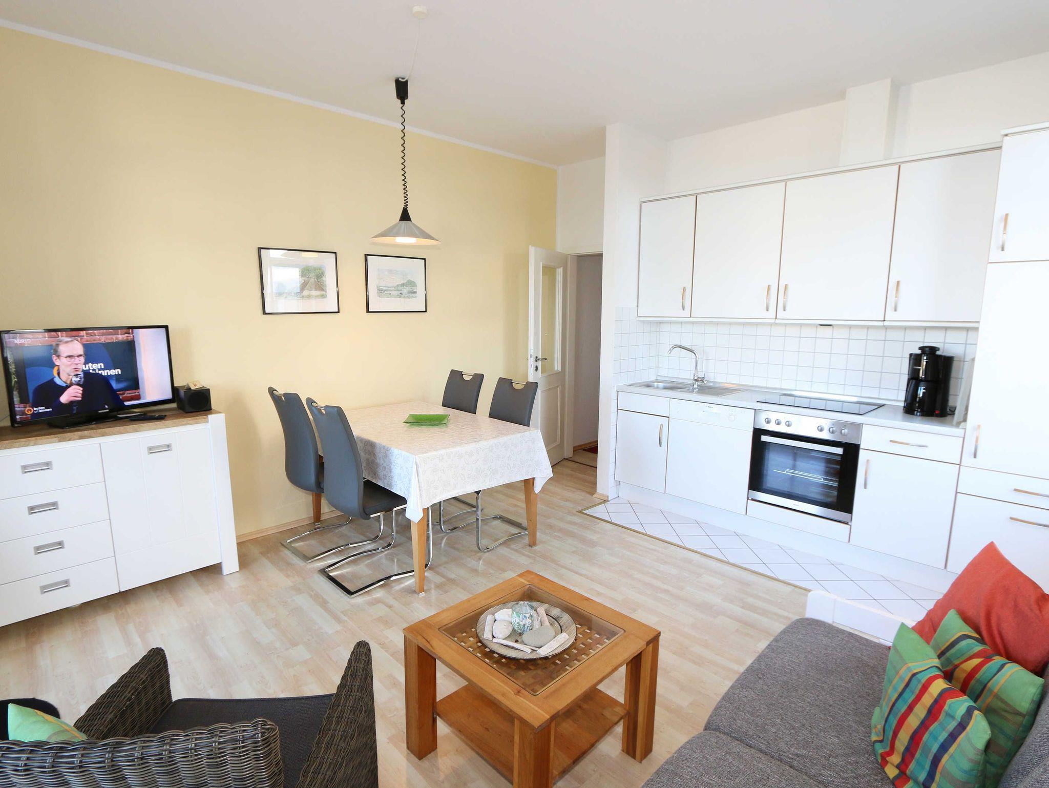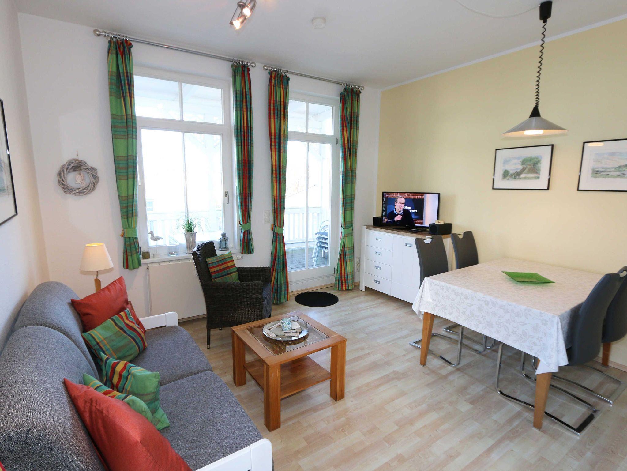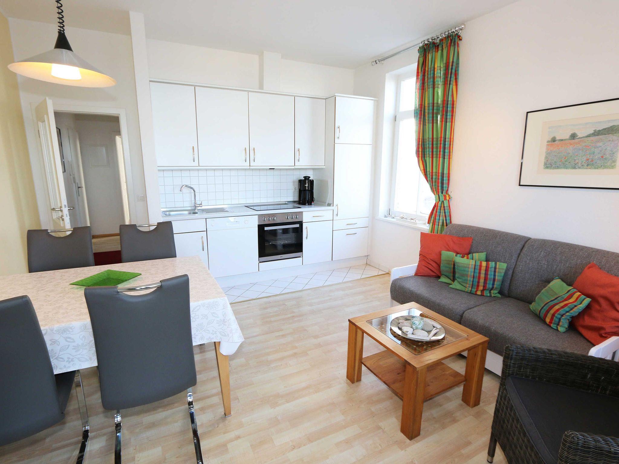 Die liebevoll eingerichtete 2- Raumferienwohnung ist eine Nichtraucherwohnung und bietet ausreichend Platz für 2 bis 4 Personen. Die Wohnfläche umfasst ca. 45 m². Der kombinierte Wohn- Essbereich ist mit einer komplett ausgestatteten Küchenzeile versehen, die über einen Geschirrspüler, Kühlschrank mit Eisfach, Cerankochfeld, Backofen, Kaffeemaschine, Toaster, Wasserkocher, diversen Küchenutensilien sowie einen Esstisch mit 4 Stühlen verfügt. Angrenzend bietet Ihnen der Wohnbereich eine Couchecke (Aufbettung für 3./4. Person 1,50m x 2,00m) mit Sessel, Couchtisch, Leselampe sowie eine Anrichte mit Smart-TV (81 cm Diagonale), Video/Blu-Ray-Player und DAB-Radio. Vom Wohnbereich aus gelangen Sie auf den ca. 10 m² bestuhlten und überdachten Balkon. Von hier aus haben Sie Blick auf die Ostsee, wo Sie Ihren Tag bei einem Glas Wein ausklingen lassen können. Das Tageslichtbad erreichen Sie durch den Flur wo eine Dusche, Kosmetikspiegel, Fön, WC und ein Waschtisch das Ganze abrunden. Das separate Schlafzimmer ist mit einem Doppelbett (1,80m x 2,00m), Nachtischkonsolen und Kleiderschrank ausgestattet. Ein kleiner Abstellraum steht Ihnen zusätzlich in der Wohnung zur Verfügung wo Sie auch ein Bügelbrett/Bügeleisen vorfinden. Die Räumlichkeiten sind mit Fliesen und Laminat verlegt worden. Ein WLAN-Zugang ist für Sie Inklusive. Ein PKW-Stellplatz (Nr.08) ist für Sie vorhanden sowie eine Fahrradunterstellmöglichkeit im Keller. Im Nebengebäude können Sie eine Waschmaschine und einen Trockner gegen eine Extragebühr nutzen. Die Erstausstattung eines Wäschepaketes (komplette Bettwäsche, 1 Duschhandtuch, 2 kleine Handtücher, 2 Geschirrhandtücher) können Sie bis 14 Tage vor Anreise gegen einen Aufpreis dazu buchen oder durch eigene ergänzen.